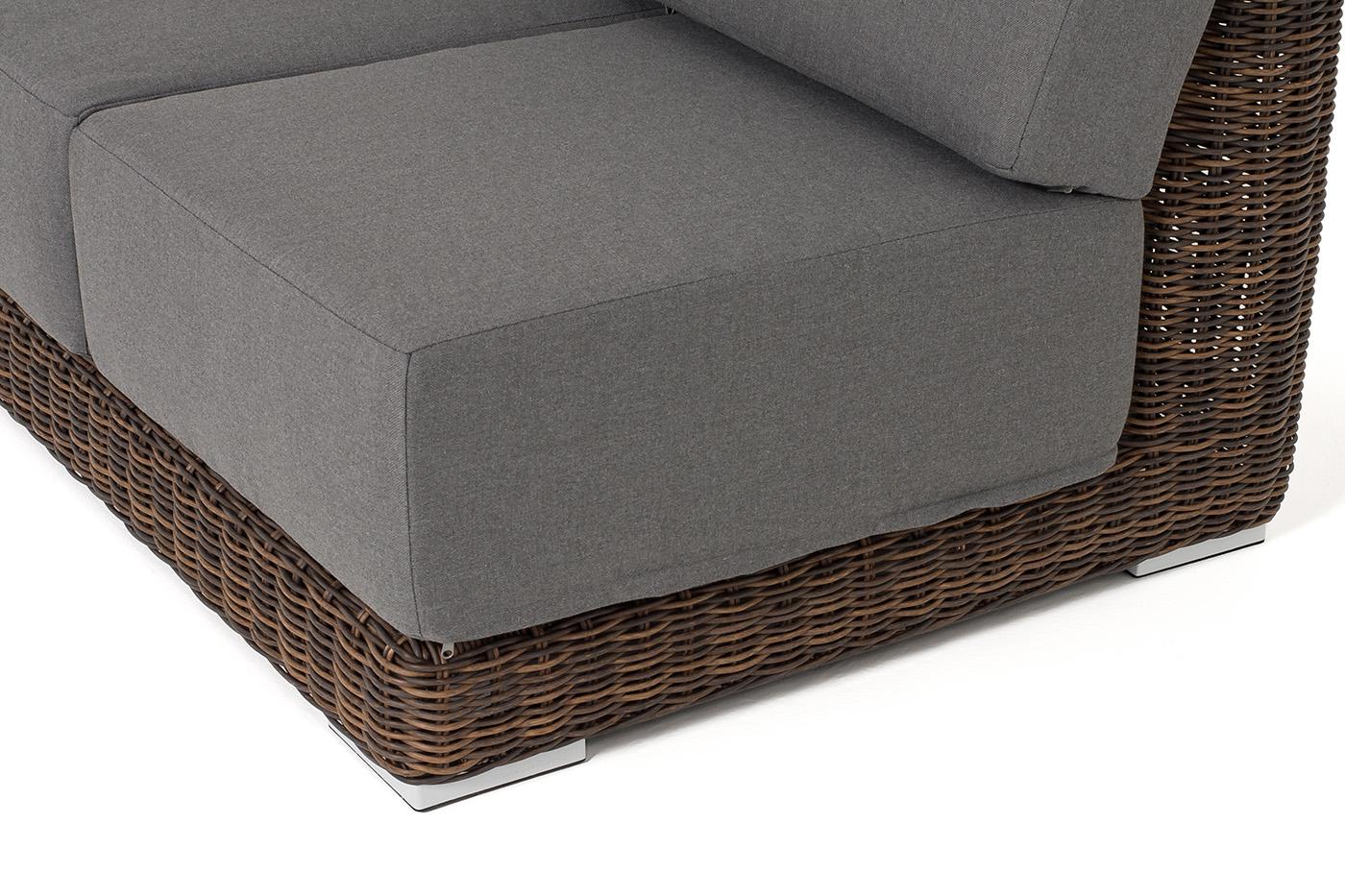 Правый модуль «Капри», выполненный из круглого искусственного ротанга коричневого оттенка, позволяет использовать не только как самостоятельный элемент, но и быть частью лаунж-зоны, в которую данная модель превосходно интегрируется. Габариты составляют - 1500×900×650 мм, в комплект входят подушки серого цвета.