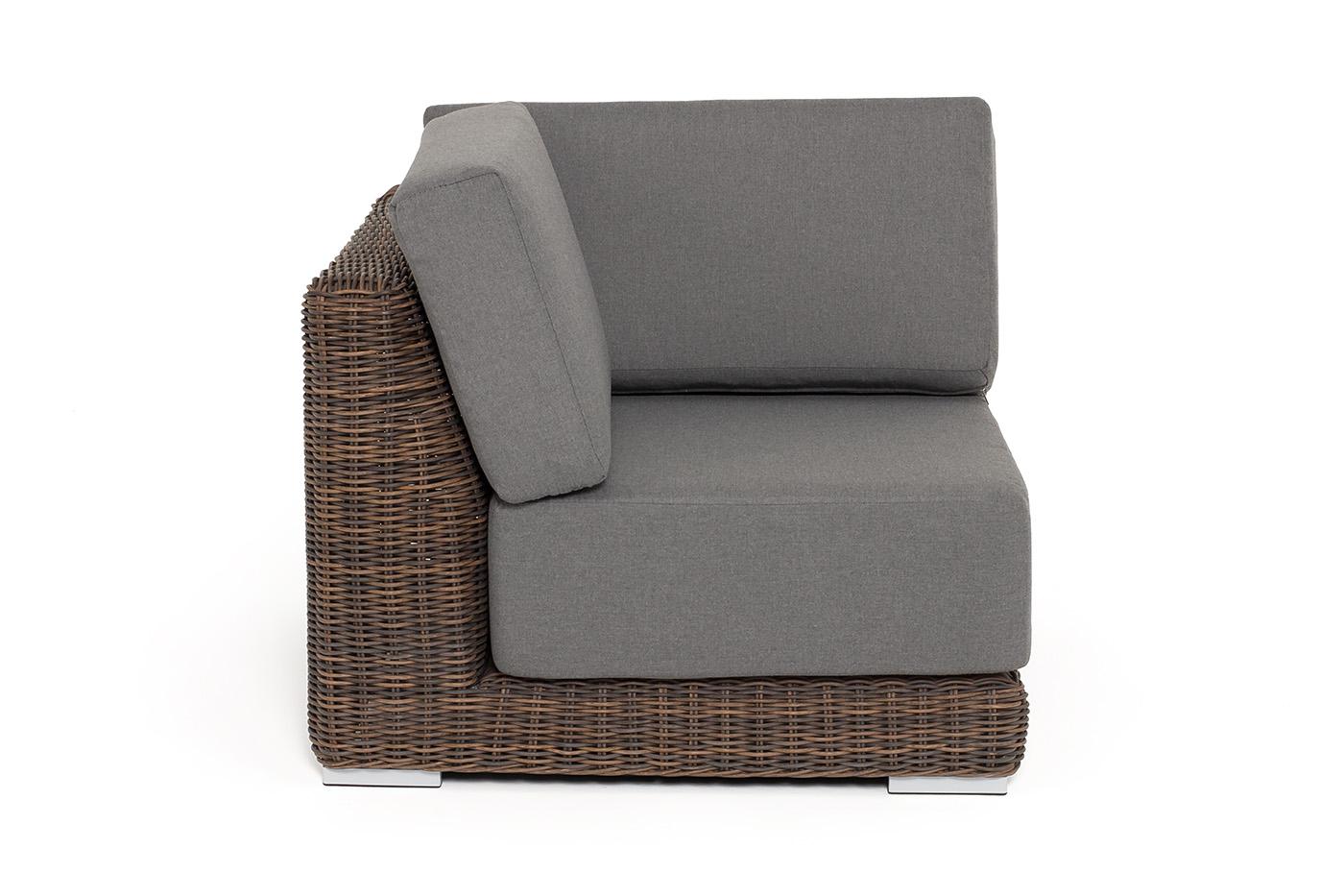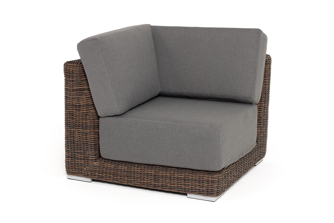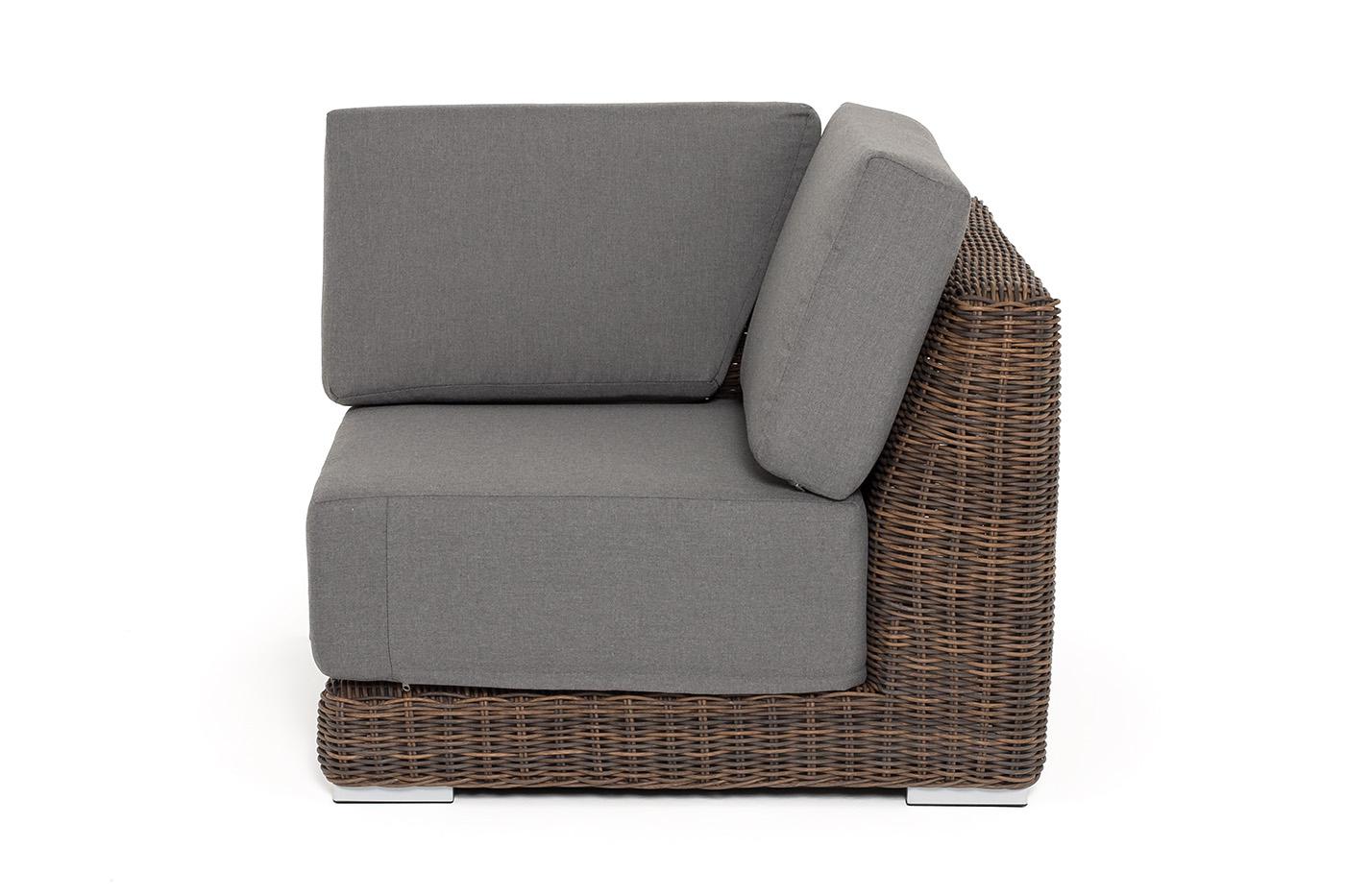 Угловой модуль из круглого искусственного ротанга «Капри» является одним из звеньев для создания лаунж зоны по индивидуальным потребностям. Основа выполнена из алюминиевого каркаса, декорированного вручную оплеткой коричневого цвета. Комплектацией предусмотрены подушки, выполенные из полиэстера с влагоотводящей пропиткой. Габариты изделия: 900×900×650 мм.