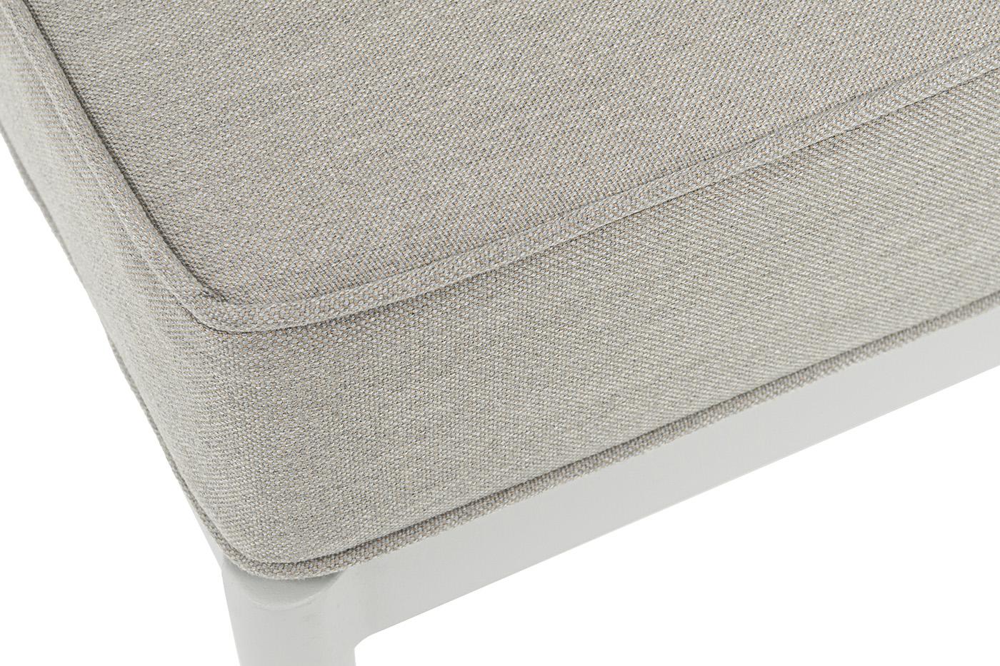 Модуль диванный угловой входит в комплект трансформирующегося дивана «Касабланка». Изготовлен из качественного алюминиевого профиля, окрашенного порошковой краской в светло-серый (RAL7035) цвет. Каркас оплетен плоским роупом, шириной 23 мм, серо-коричневого цвета. Подушки со съёмными влагоотталкивающими чехлами входят в комплект. Размер модуля: 800×800×700 мм.