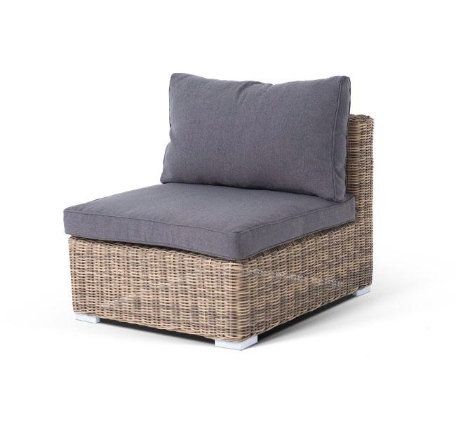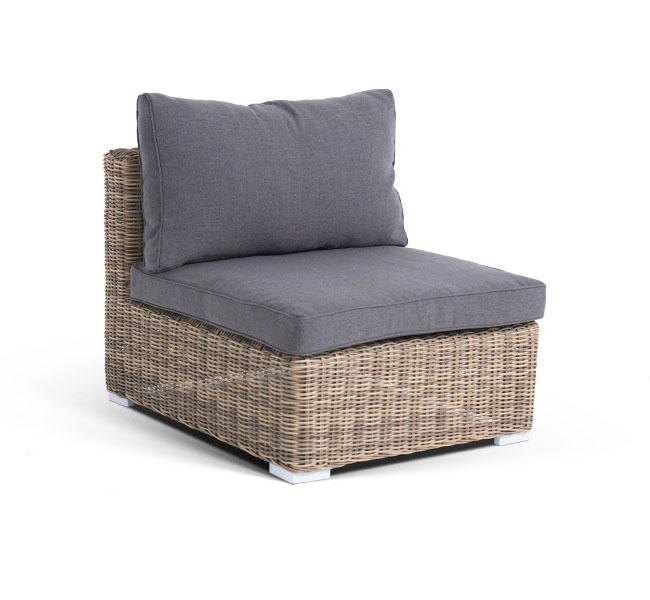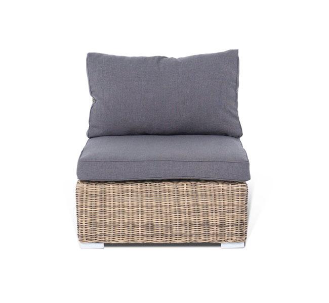 Прямой модуль «Лунго», выполненный из круглого искусственного ротанга натурального соломенного оттенка, позволяет использовать не только как самостоятельный элемент, но и быть частью лаунж-зоны, в которую данная модель превосходно интегрируется. Габариты составляют - 740×860×650 мм, в комплект входят подушки серого цвета.
