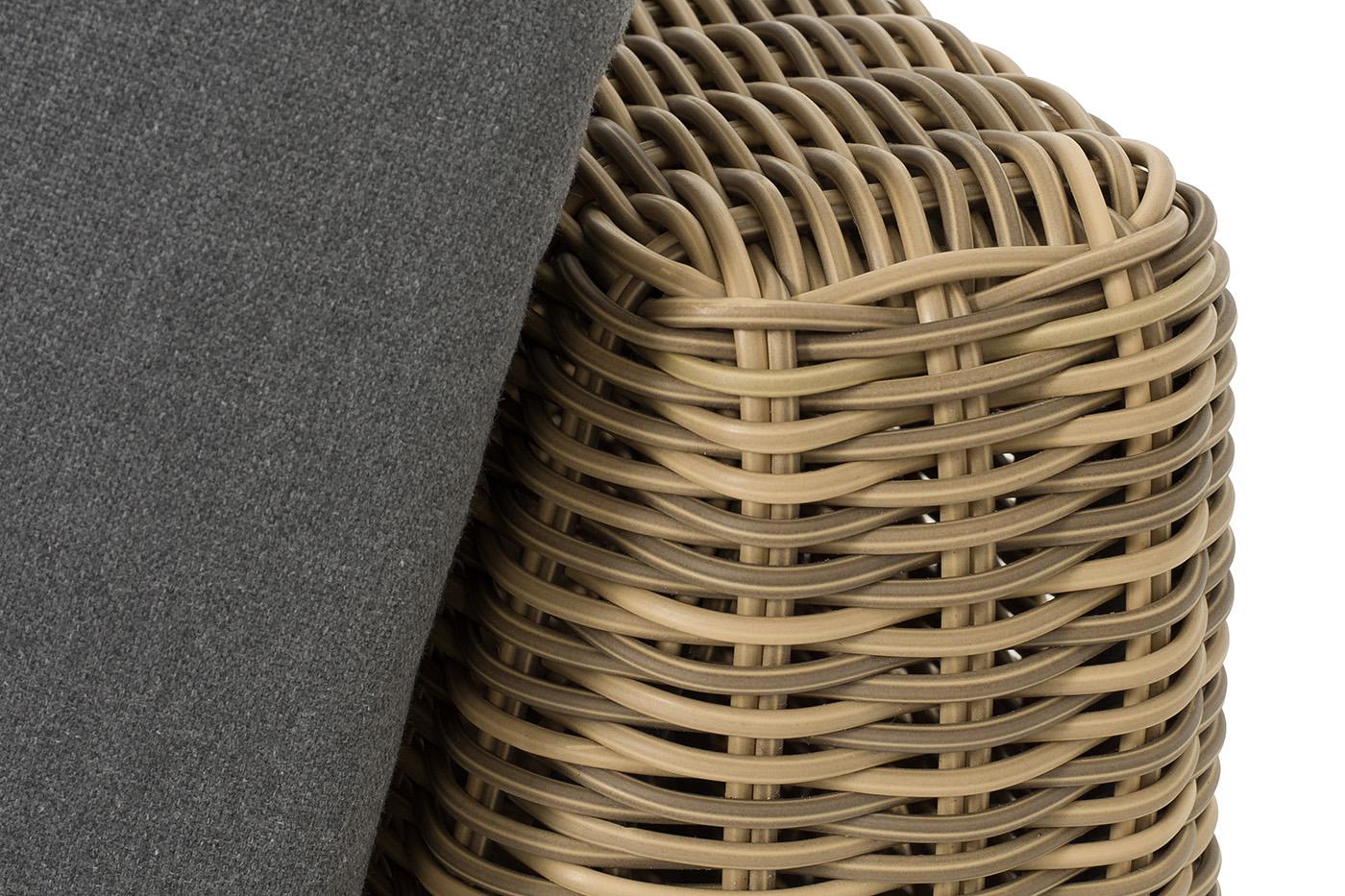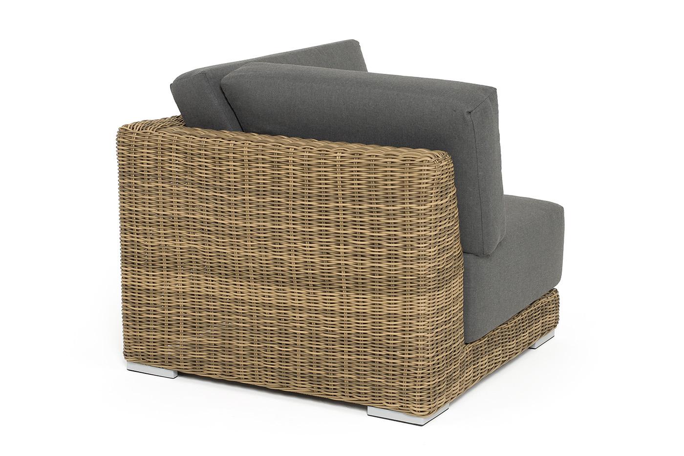 Угловой модуль из круглого искусственного ротанга «Капри» является одним из звеньев для создания лаунж зоны по индивидуальным потребностям. Основа выполнена из алюминиевого каркаса, декорированного вручную оплеткой соломенного цвета. Комплектацией предусмотрены подушки, выпаленные из полиэстера с влагоотталкивающей пропиткой. Габариты изделия: 900×900×650 мм.