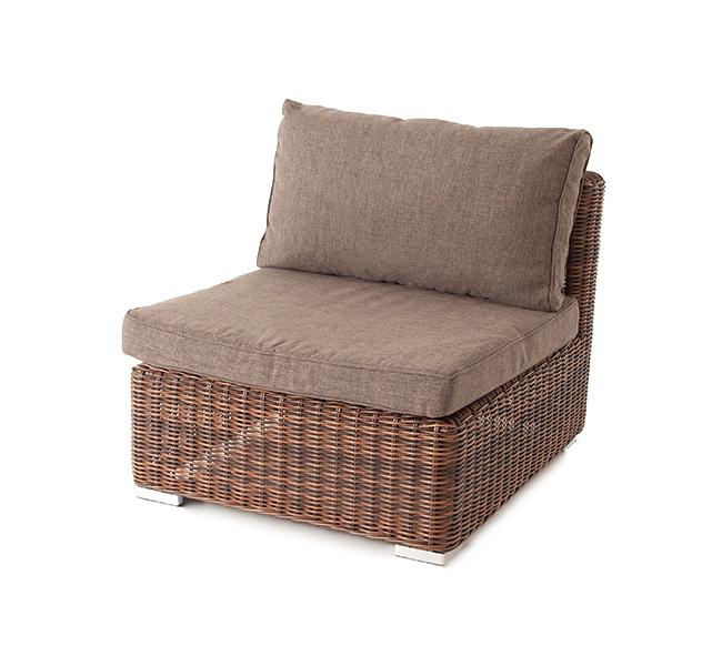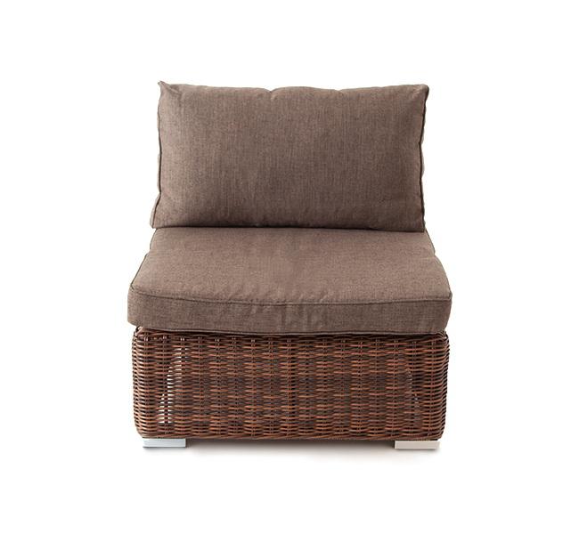 Прямой модуль «Лунго», выполненный из круглого искусственного ротанга коричневого оттенка, позволяет использовать не только как самостоятельный элемент, но и быть частью лаунж-зоны, в которую данная модель превосходно интегрируется. Габариты составляют - 740×860×650 мм, в комплект входят подушки серого цвета.