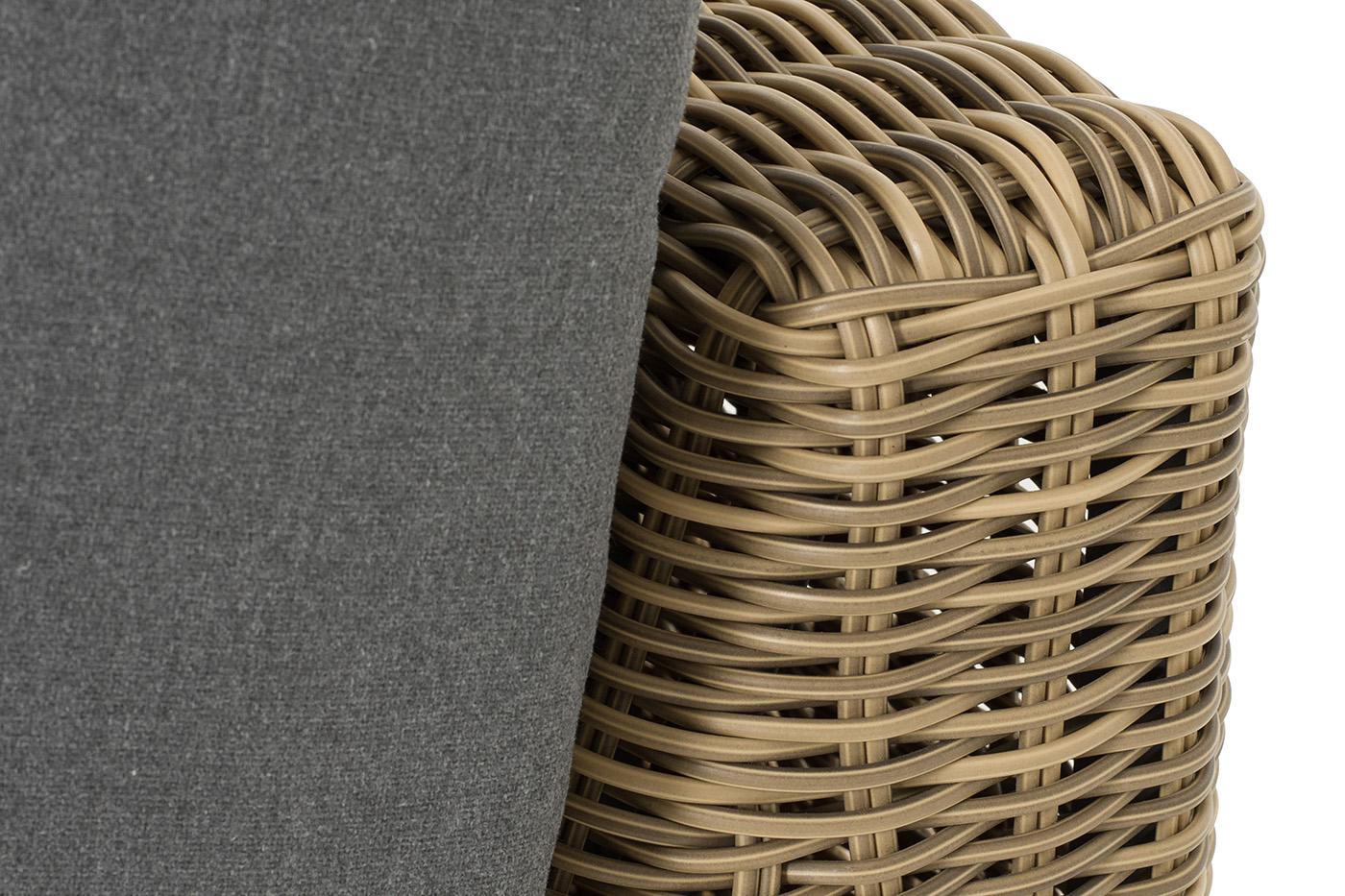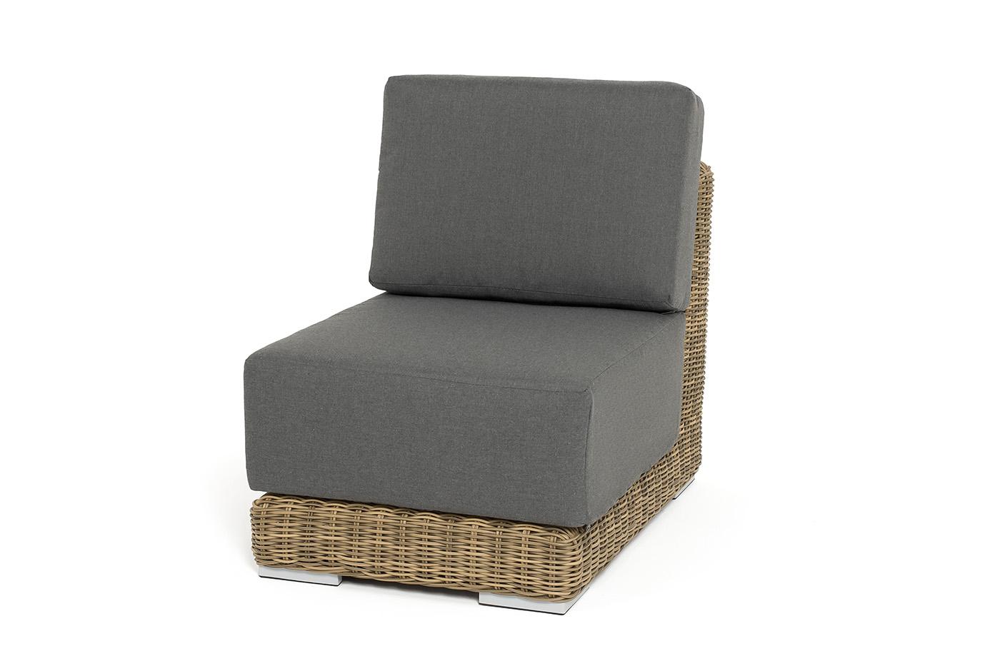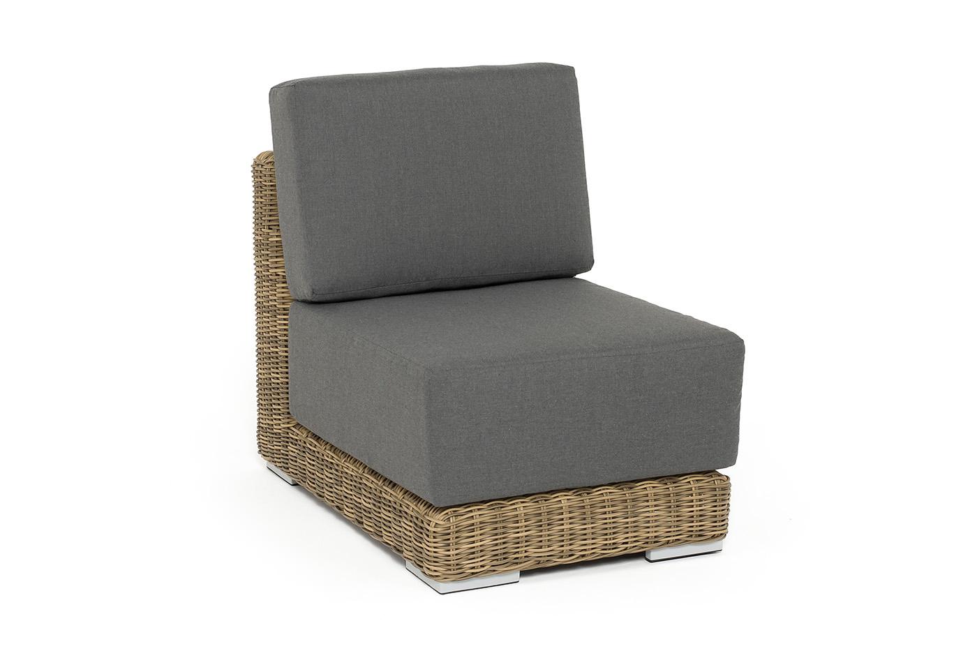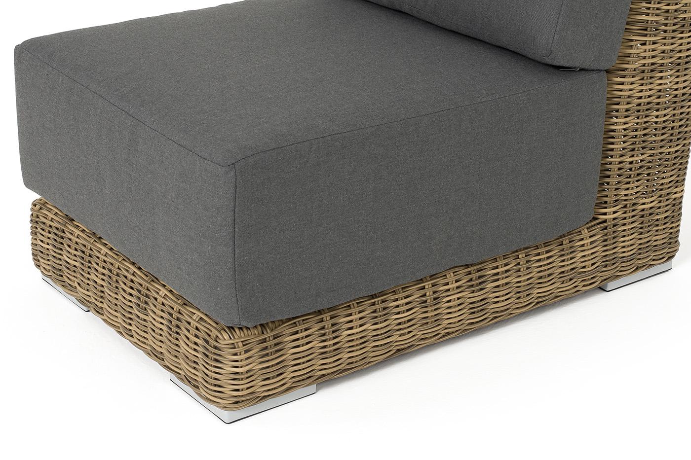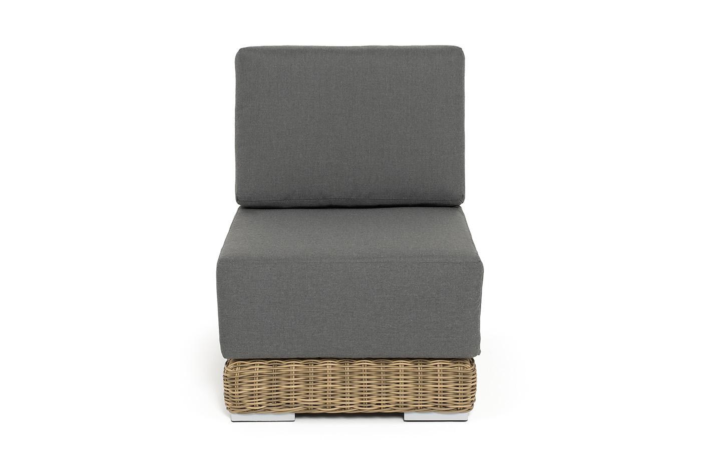 Прямой модуль «Капри», выполненный из круглого искусственного ротанга соломенного оттенка, позволяет использовать не только как самостоятельный элемент, но и быть частью лаунж-зоны, в которую данная модель превосходно интегрируется. Габариты составляют - 600×900×650 мм, в комплект входят подушки серого цвета.