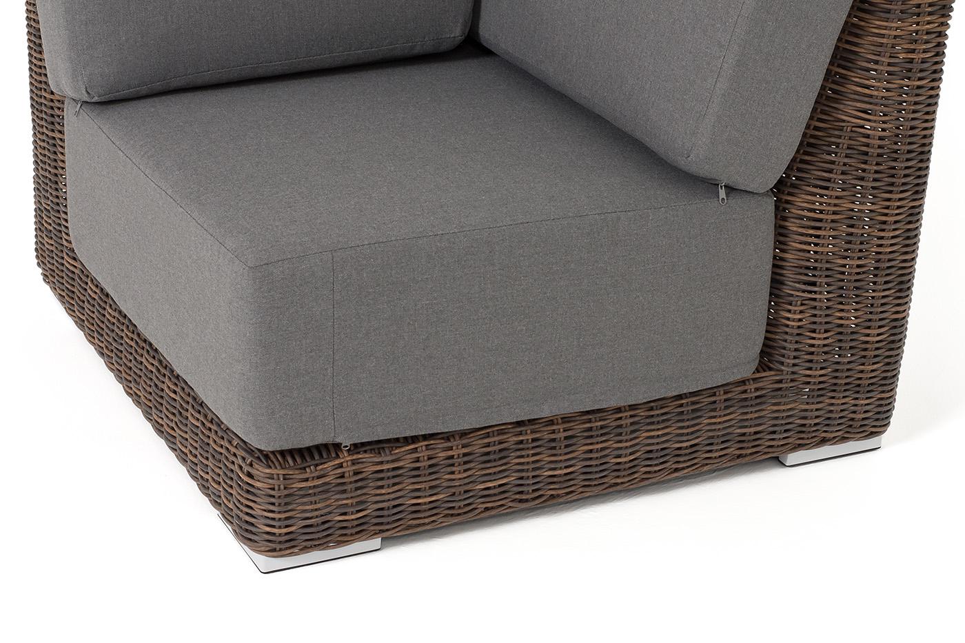 Угловой модуль из круглого искусственного ротанга «Капри» является одним из звеньев для создания лаунж зоны по индивидуальным потребностям. Основа выполнена из алюминиевого каркаса, декорированного вручную оплеткой коричневого цвета. Комплектацией предусмотрены подушки, выполенные из полиэстера с влагоотводящей пропиткой. Габариты изделия: 900×900×650 мм.