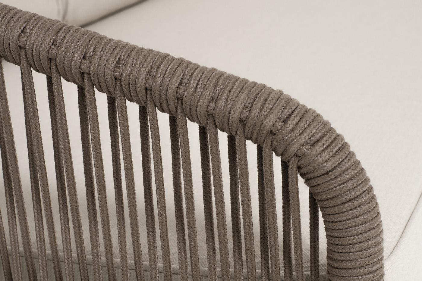 Диванный модуль «Канны» правосторонний из комплекта трансформирующегося одноименного дивана. Модуль имеет алюминиевый каркас, окрашенный порошковой краской в коричневый (RAL8016) цвет. Боковины каркаса вручную оплетены роупом - эластичными синтетическими лентами, изготовленными из высокопрочных полиэфирных волокон. Цвет оплетки - коричневый. Подушки состоят из наполнителя и съёмных чехлов. Материал - 100% полиэстер, плотностью 300гр/м2. Размер плетеного модуля: 1480×850×750 мм.