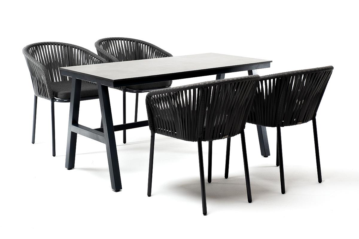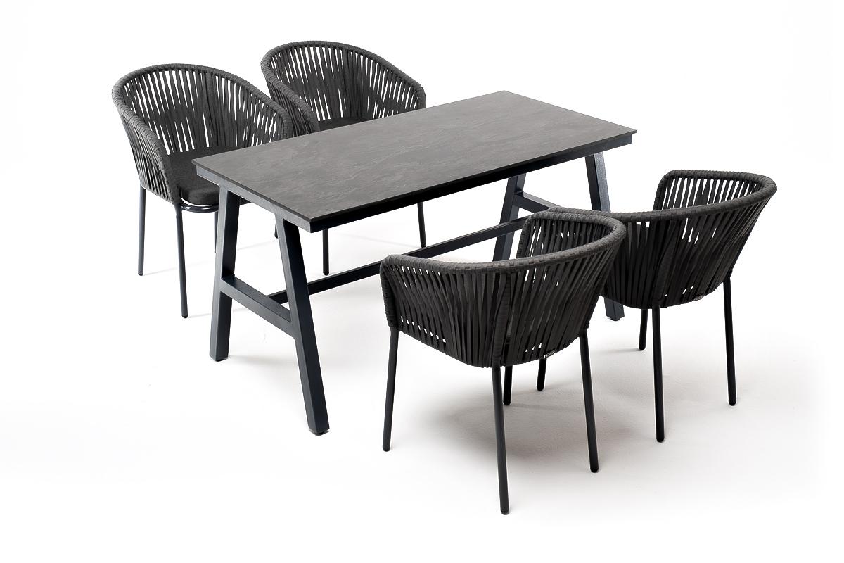Обеденная группа «Рио» рассчитана на 4 персоны. В состав комплекта входит: - Стол обеденный 140х70см, цвет «серый гранит» - 4 плетеных стула «Бордо» из плоского роупа, размером - 570х620х775 мм, цвет каркаса и роупа - серый. "Рио" стол из HPL 140х70см, H75, цвет столешницы "серый гранит" 1шт. 1 400Х700Х750, "Бордо" стул плетеный из роупа, каркас алюминий серый (RAL7022) муар, роуп серый 15мм, ткань темно-серая 027 4шт. 570Х620Х775,