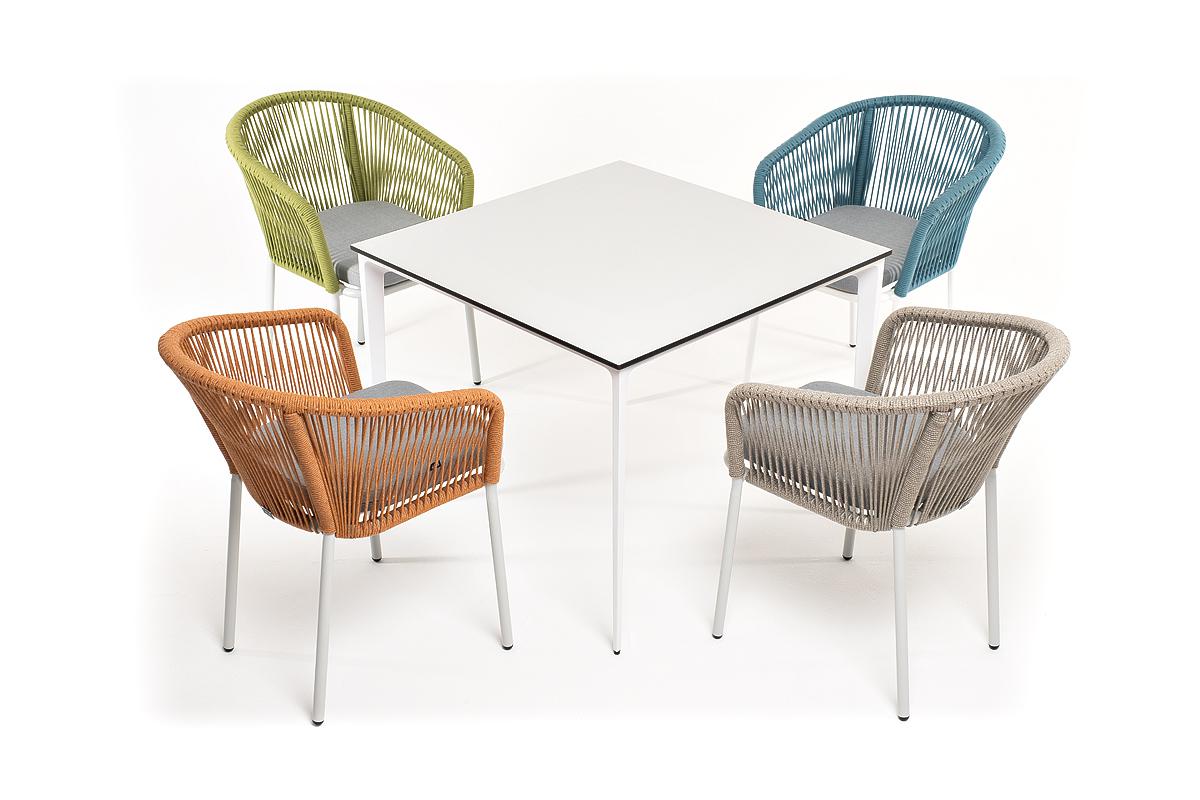 Комплект «Аркобалено» для обустройства обеденной зоны, рассчитан на 4 персоны. В комплект входят: - стол из HPL «Малага» 900×900×750 мм. - стул «Марсель», роуп салатовый меланж - 570×620×775 мм. - стул «Марсель», роуп бирюзовый - 570×620×775 мм. - стул «Марсель», роуп оранжевый меланж - 570×620×775 мм. - стул «Марсель», роуп серый меланж - 570×620×775 мм. Столешница стола «Малага» выполнена из современного высококачественного монолитного компакт-пластик HPL, толщиной 12 мм в молочном цветом. Материал устойчив к высоким температурам, попаданию влаги и может использоваться при любых погодных условиях. Подстолье изготовлено из крашеного алюминия белого цвета. Каркас стульев выполнен из алюминия. Оплетка выполнена вручную современным материалом - роупом. Цвет оплетки - бирюзовый, салатовый меланж, оранжевый меланж и серый меланж. В комплект входят подушки со съёмными водоотталкивающими чехлами светло-серого цвета. "Малага" обеденный стол из HPL 90х90см, цвет молочный, каркас белый 1шт. 900Х900Х750, "Марсель" стул плетеный из роупа, каркас алюминий светло-серый (RAL7035) муар, роуп бирюзовый круглый, ткань светло-серая 1шт. 570Х620Х775, "Марсель" стул плетеный из роупа, каркас алюминий светло-серый (RAL7035) муар, роуп оранжевый меланж круглый, ткань светло-серая 1шт. 570Х620Х775, "Марсель" стул плетеный из роупа, каркас алюминий светло-серый (RAL7035) муар, роуп салатовый меланж круглый, ткань светло-серая 1шт. 570Х620Х775, "Марсель" стул плетеный из роупа, каркас алюминий светло-серый (RAL7035) муар, роуп серый меланж круглый, ткань светло-серая 1шт. 570Х620Х775,
