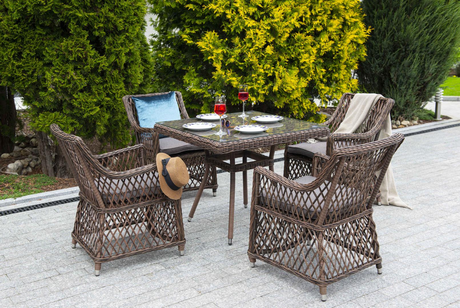 Ротанговая обеденная группа премиум-класса «Айриш». В комплекте: - квадратный обеденный стол «Айриш» (900×900×750 мм) с ударопрочной стеклянной столешницей. - 4 кресла «Латте» ( 550×660×850 мм). Каркас всех изделий изготовлен из легкого алюминия, оплетенного вручную долговечным искусственным ротангом. На креслах предусмотрены подушки со съёмными чехлами. Комплект выполнен в насыщенном коричневом цвете, имитирующем натуральную ротанговую лозу. Все элементы можно заказать по отдельности "Айриш" стол плетеный из искусственного ротанга, цвет коричневый 1шт. 900Х900Х750, "Латте" плетеное кресло из искусственного ротанга, цвет коричневый 4шт. 550Х660Х850,