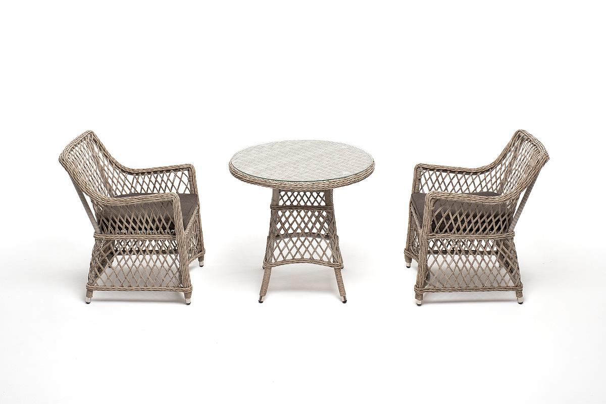 Комплект «Эспрессо–80 L» можно использовать в качестве обеденной группы на 2 персоны или как кофейный комплект на балконе или террасе. В плетеный комплект входит круглый стол «Эспрессо» диаметром 80 см с ударопрочной стеклянной столешницей и 2 кресла коллекции «Латте» 550×660×850 мм. Набор представлен в бежевом цвете. Параметры кресел без подушек: Глубина сидения – 480 мм; Высота сидения – 400 мм; Высота спинки – 460 мм. "Эспрессо" плетеный круглый стол, диаметр 80 см, цвет бежевый 1шт. 800Х800Х750, "Латте" плетеное кресло из искусственного ротанга, цвет бежевый 2шт. 550Х660Х850,