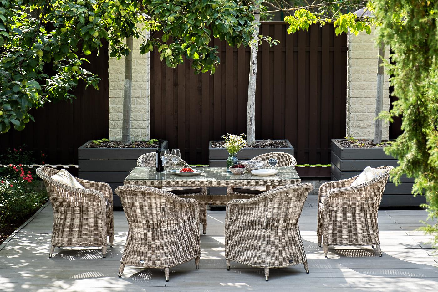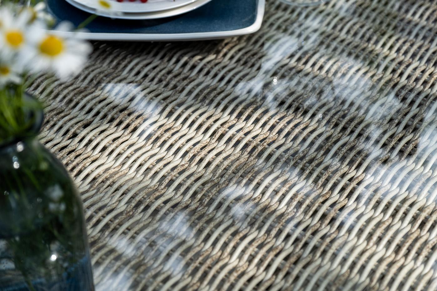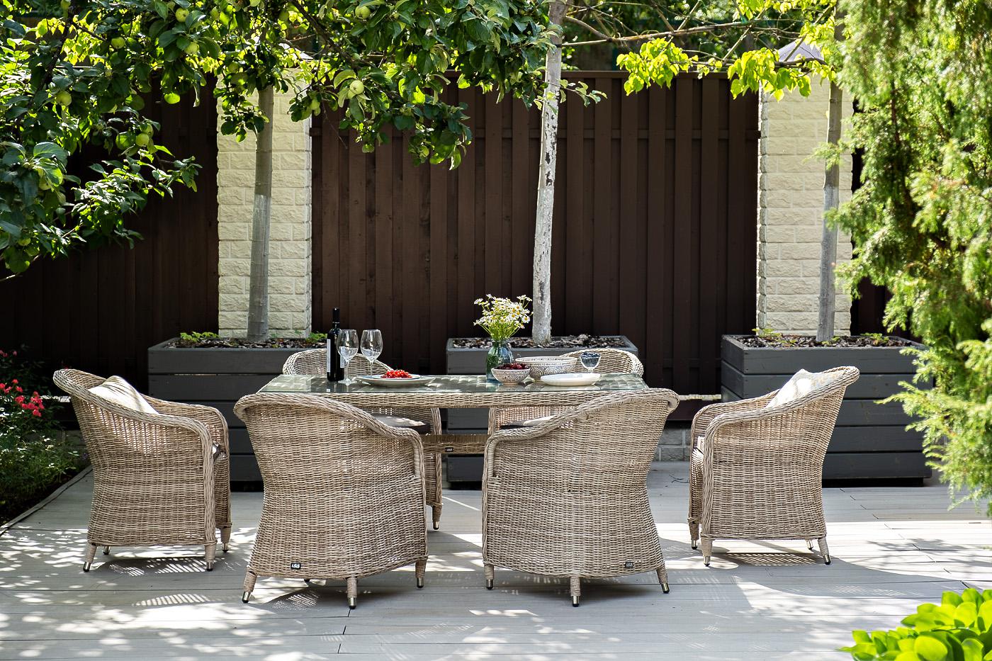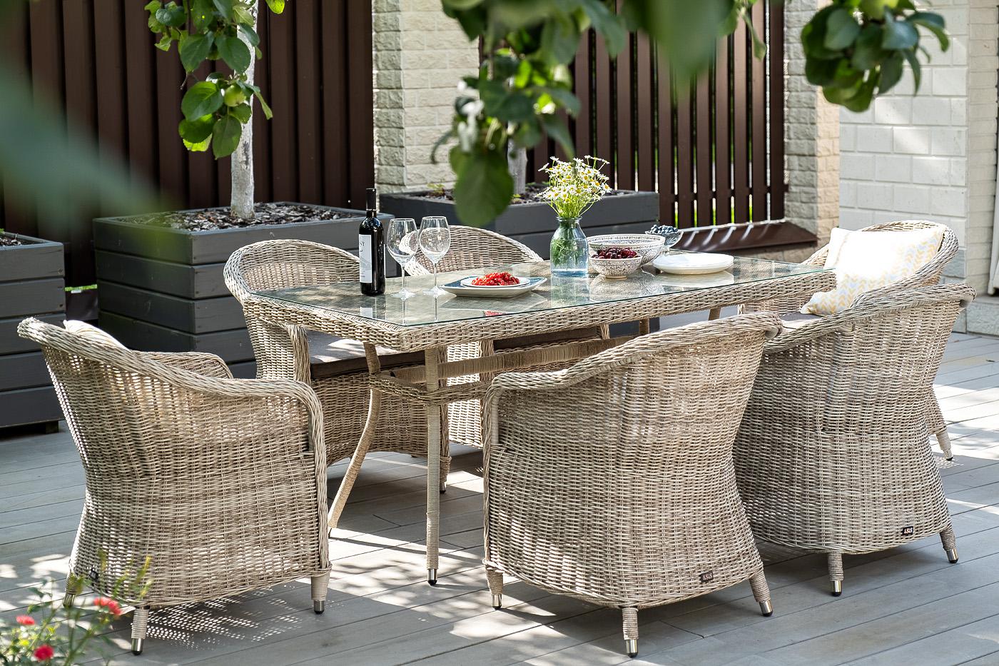 Премиальная обеденная группа «Эспрессо» для большой компании. В набор входит большой прямоугольный стол «Латте», размером - 1600×900×750 мм и 6 кресел «Равенна», размер - 570×680×810 мм, в бежевом оттенке. Каркас всех предметов мебели изготовлен из легкого и прочного алюминия, оплетенного вручную искусственным ротангом. Стол для удобства использования накрыт прочным стеклом, кресла укомплектованы подушками со съёмными чехлами серого цвета. Вы можете заказать любое количество элементов из дан "Латте" плетеный стол из искусственного ротанга 160х90см, цвет бежевый 1шт. 1 600Х900Х750, "Равенна" плетеное кресло из искусственного ротанга, цвет бежевый 6шт. 570Х680Х810,