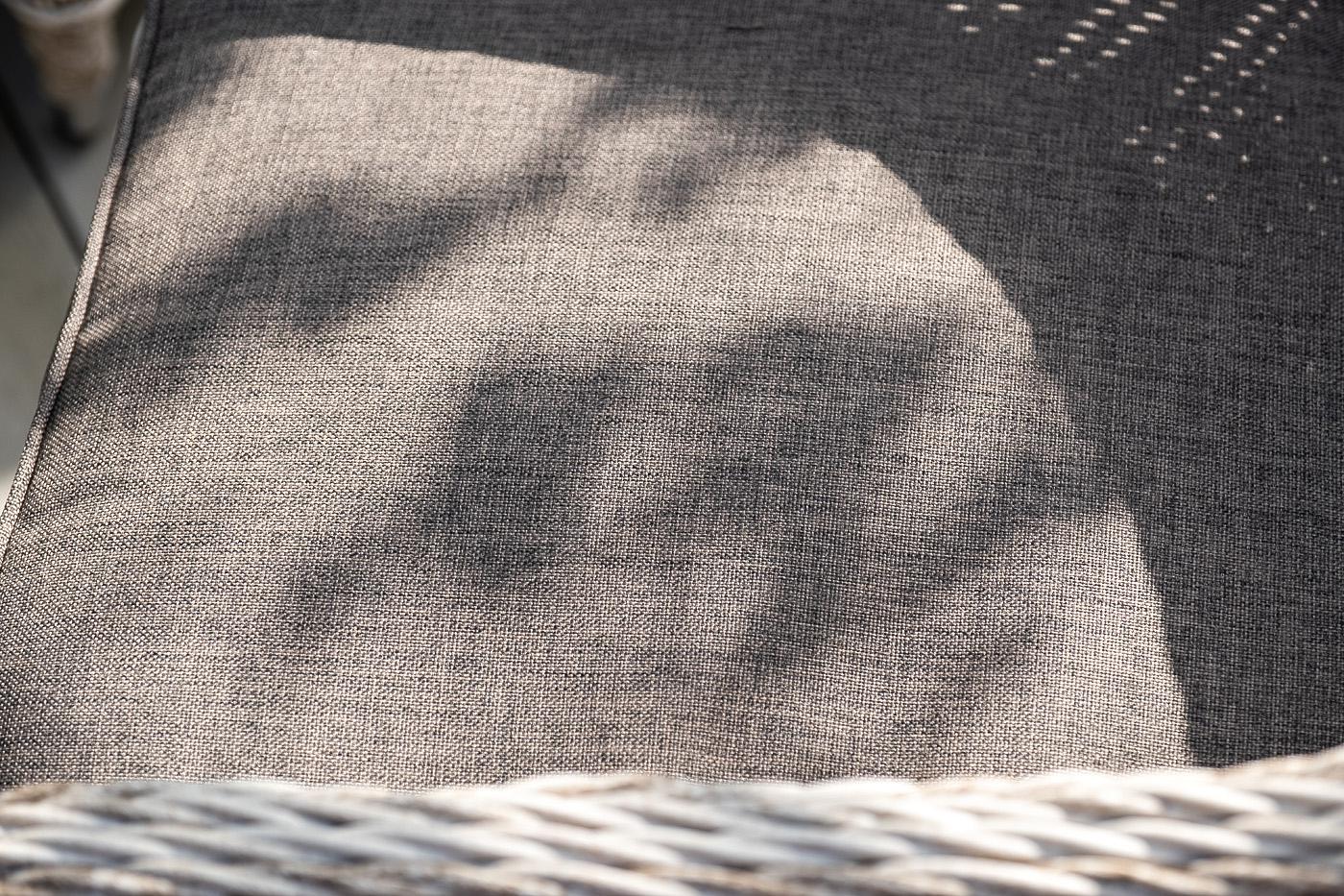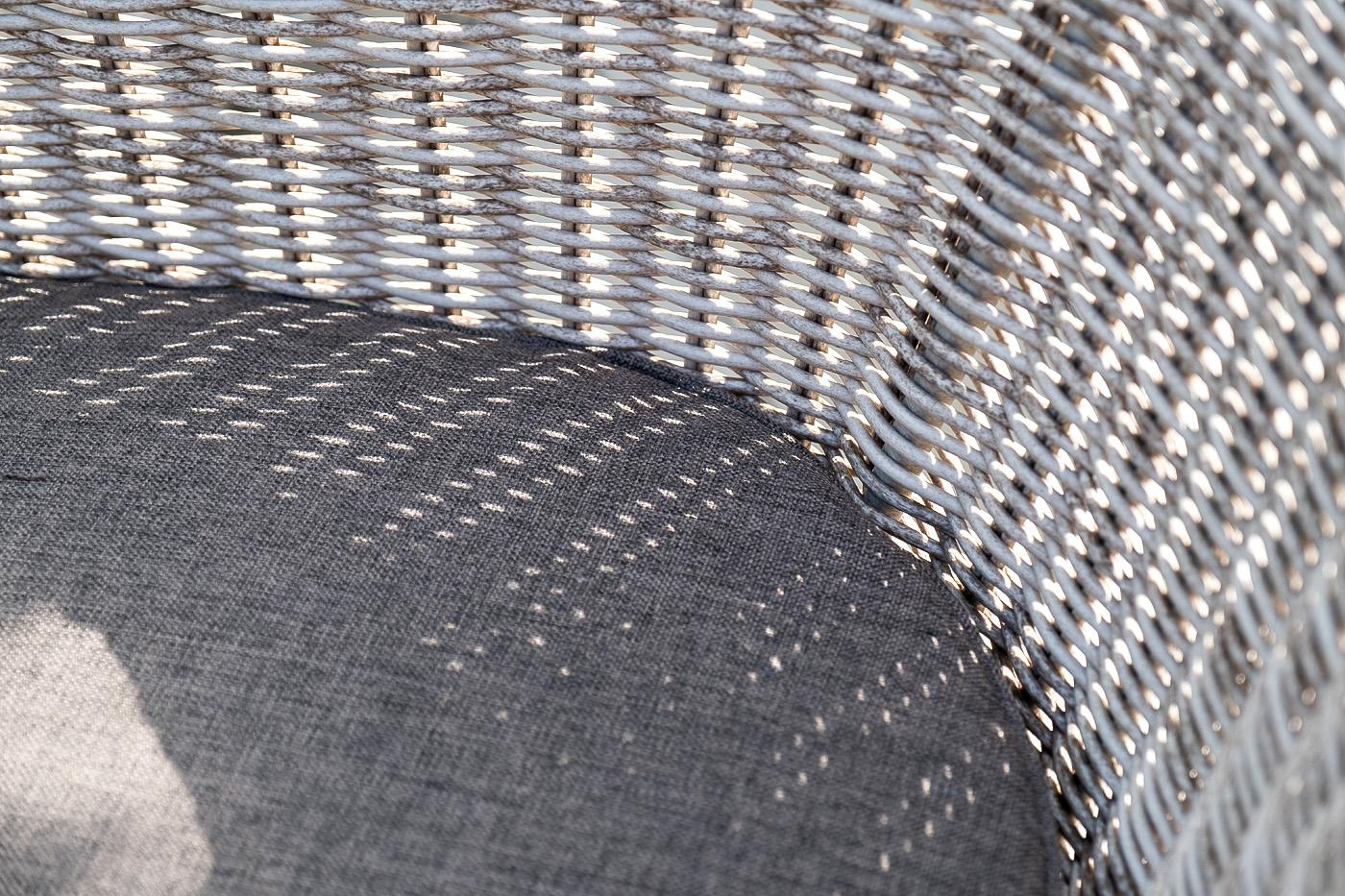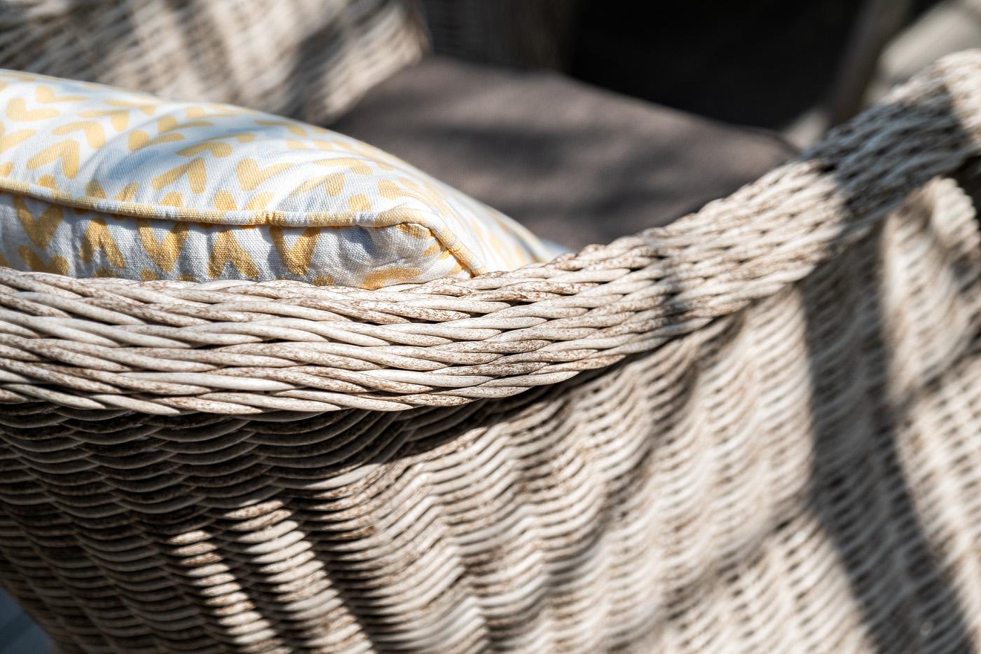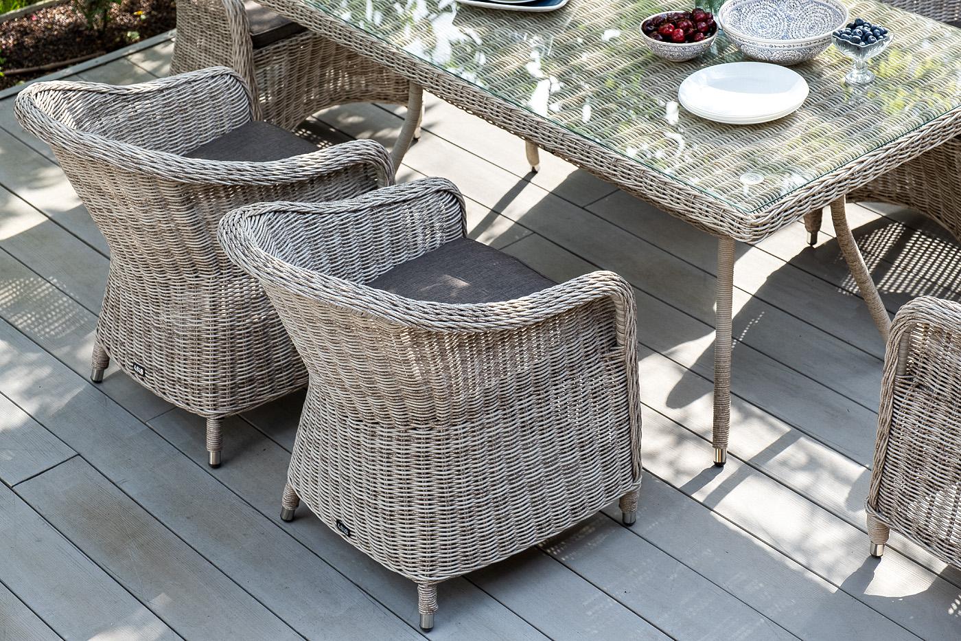 Премиальная обеденная группа «Эспрессо» для большой компании. В набор входит большой прямоугольный стол «Латте», размером - 1600×900×750 мм и 6 кресел «Равенна», размер - 570×680×810 мм, в бежевом оттенке. Каркас всех предметов мебели изготовлен из легкого и прочного алюминия, оплетенного вручную искусственным ротангом. Стол для удобства использования накрыт прочным стеклом, кресла укомплектованы подушками со съёмными чехлами серого цвета. Вы можете заказать любое количество элементов из дан "Латте" плетеный стол из искусственного ротанга 160х90см, цвет бежевый 1шт. 1 600Х900Х750, "Равенна" плетеное кресло из искусственного ротанга, цвет бежевый 6шт. 570Х680Х810,