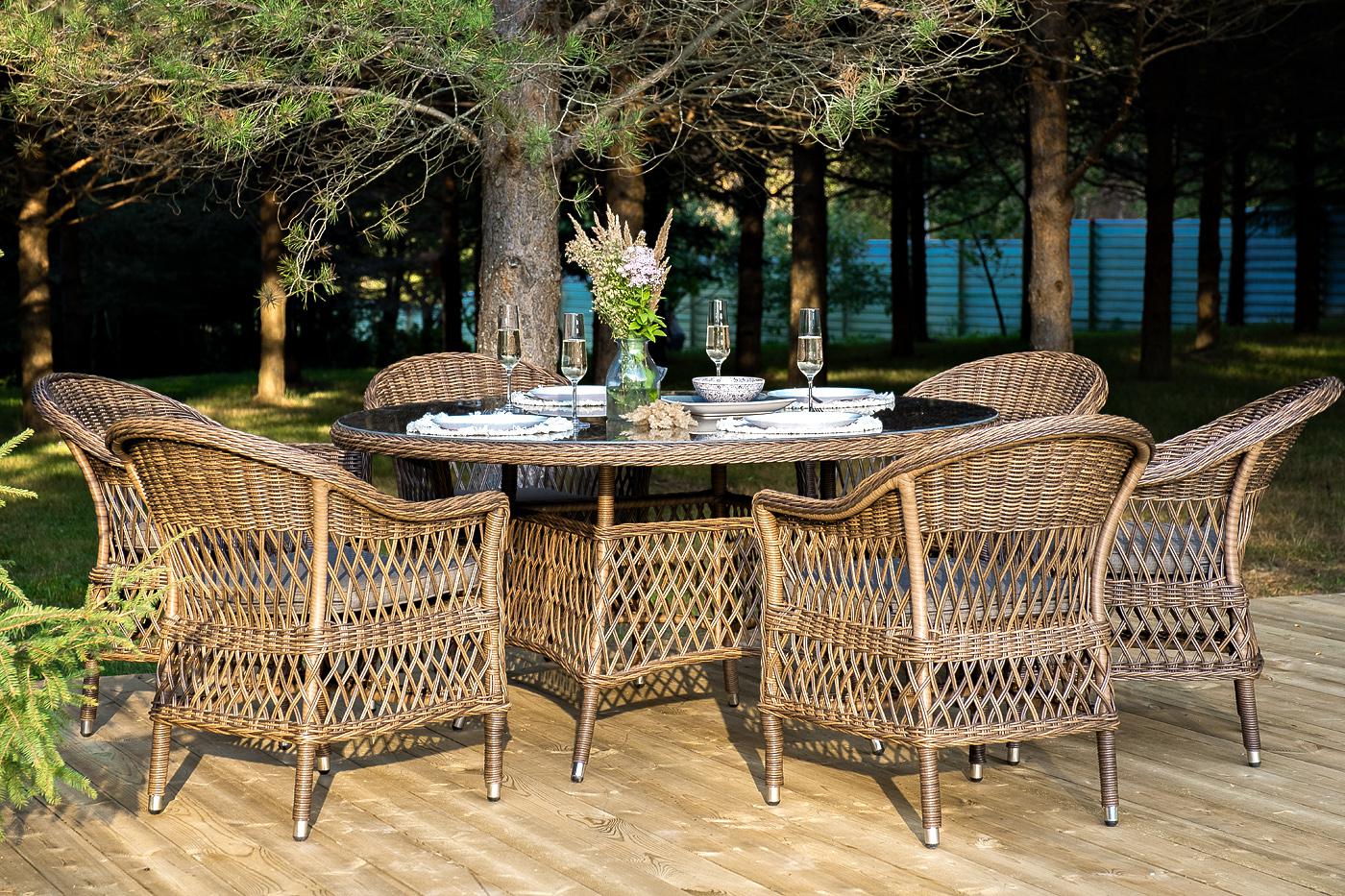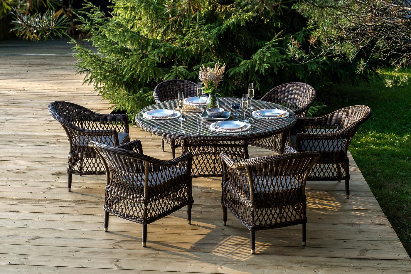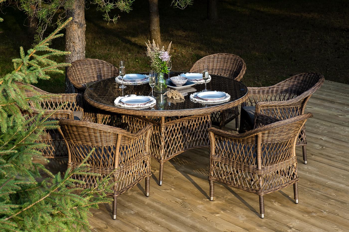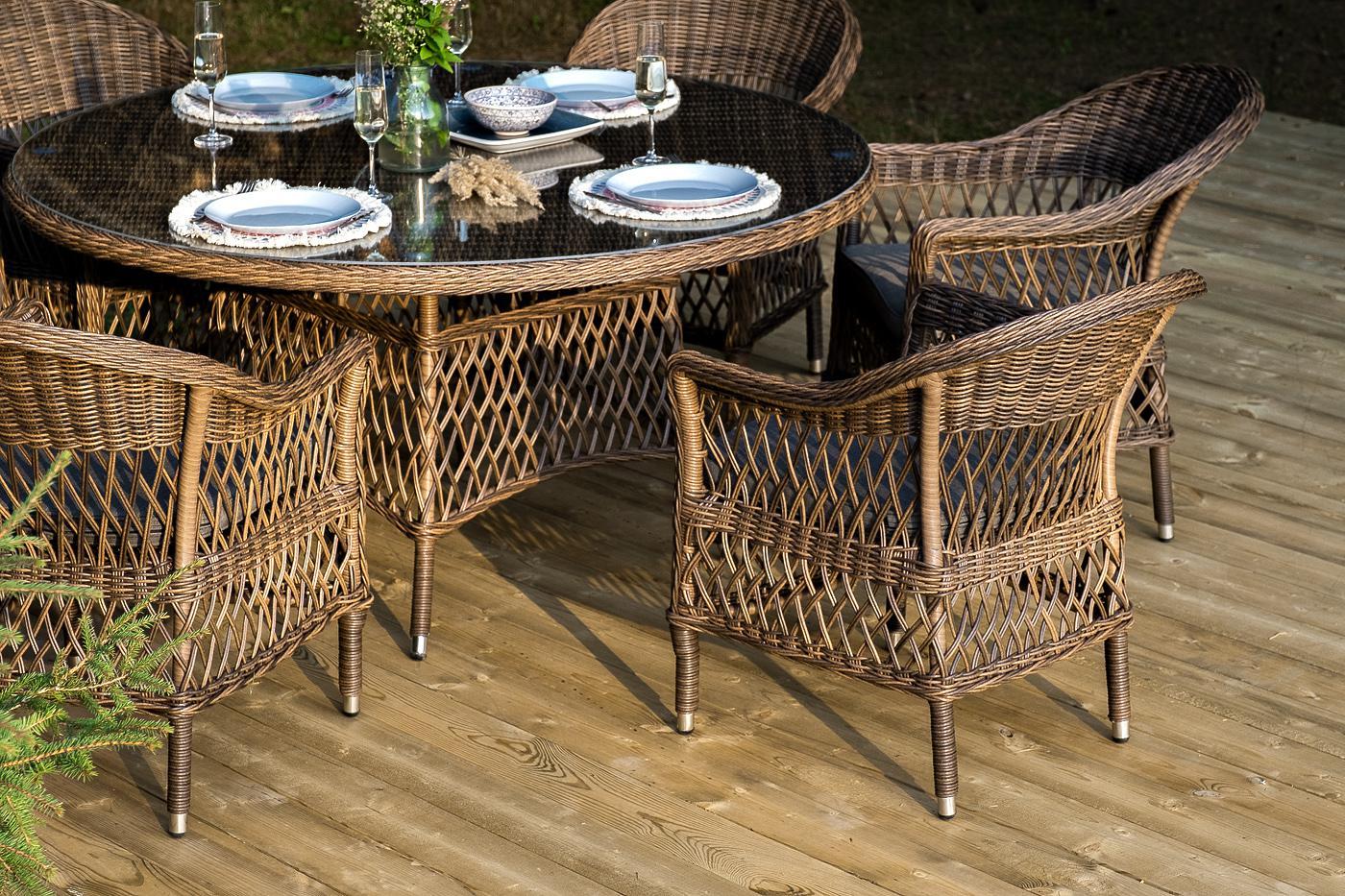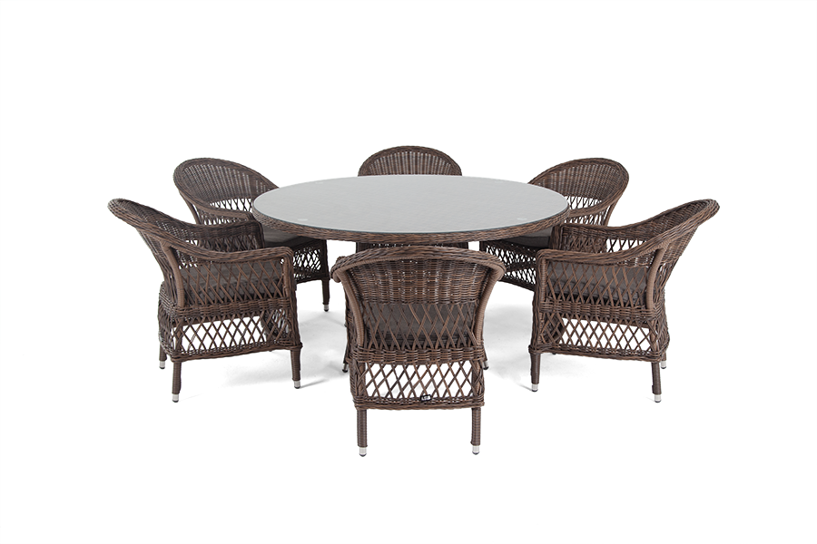 В комплект входит круглый обеденный стол «Эспрессо» (1500×1500×750 мм) с ударопрочной стеклянной столешницей и 6 кресел коллекции «Сицилия» (590×640×820 мм). Цвет - коричневый. Вся мебель изготовлена из долговечного и легкого алюминия, обтянутого синтетическим ротангом. На столе для удобства эксплуатации предусмотрена столешница из ударопрочного закаленного стекла 5 мм. Стулья укомплектованы подушками на сидениях. Параметры кресел без подушек: Глубина сидения – 480 мм; Высота сидения – 420 мм "Эспрессо" плетеный круглый стол, диаметр 150 см, цвет коричневый 1шт. 1 500Х1 500Х750, "Сицилия" плетеный стул из искусственного ротанга, цвет коричневый 6шт. 590Х640Х820,