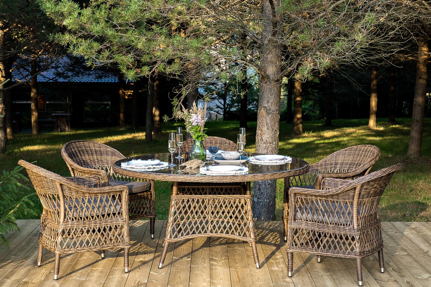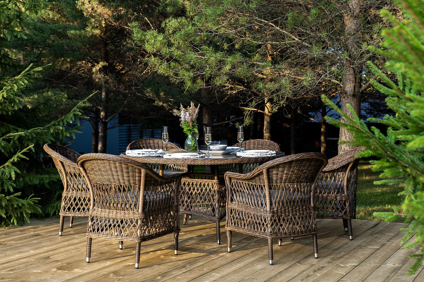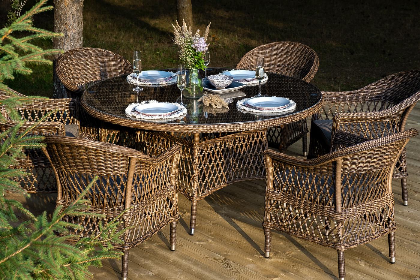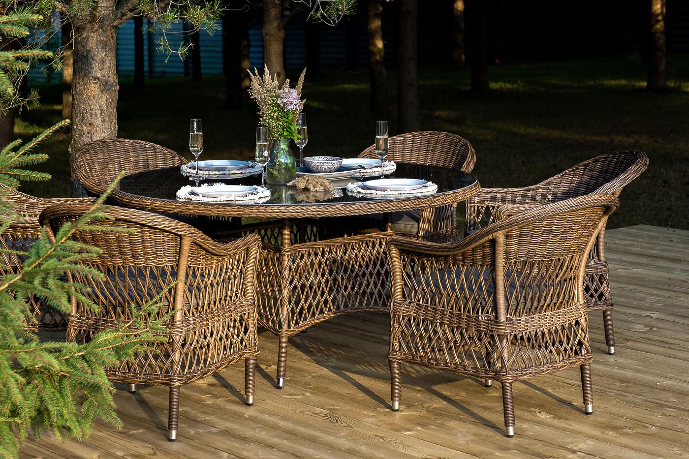 В комплект входит круглый обеденный стол «Эспрессо» (1500×1500×750 мм) с ударопрочной стеклянной столешницей и 6 кресел коллекции «Сицилия» (590×640×820 мм). Цвет - коричневый. Вся мебель изготовлена из долговечного и легкого алюминия, обтянутого синтетическим ротангом. На столе для удобства эксплуатации предусмотрена столешница из ударопрочного закаленного стекла 5 мм. Стулья укомплектованы подушками на сидениях. Параметры кресел без подушек: Глубина сидения – 480 мм; Высота сидения – 420 мм "Эспрессо" плетеный круглый стол, диаметр 150 см, цвет коричневый 1шт. 1 500Х1 500Х750, "Сицилия" плетеный стул из искусственного ротанга, цвет коричневый 6шт. 590Х640Х820,
