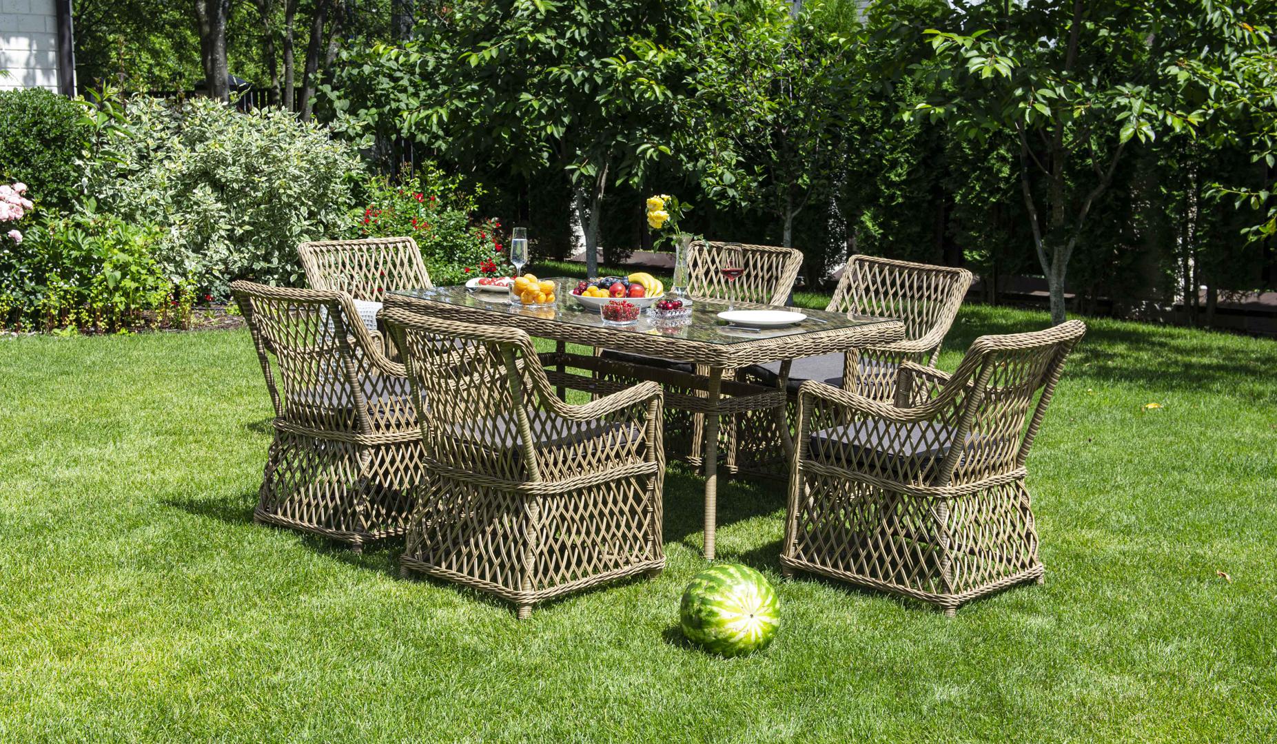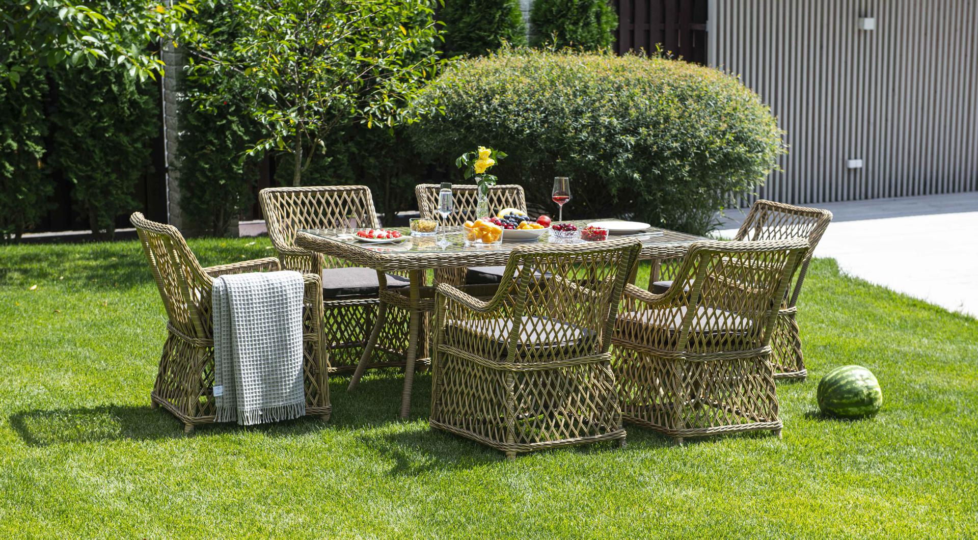 Элитная обеденная группа «Латте» для обустройства зоны отдыха на открытом пространстве. В комплекте прямоугольный обеденный стол 1600×900×750 мм и 6 кресел 550×660×850 мм. Каркас мебели изготовлен из прочного алюминия и задекорирован синтетическим искусственным ротангом натурального соломенного оттенка. Материал устойчив к ультрафиолетовому излучению. Кресла оснащены мягкими подушками со съёмными чехлами. Мебель пригодна для использования в общественных местах: отелях, ресторанах, SPA-цент "Латте" плетеный стол из искусственного ротанга 160х90см, цвет соломенный 1шт. 1 600Х900Х750, "Латте" плетеное кресло из искусственного ротанга, цвет соломенный 6шт. 550Х660Х850,