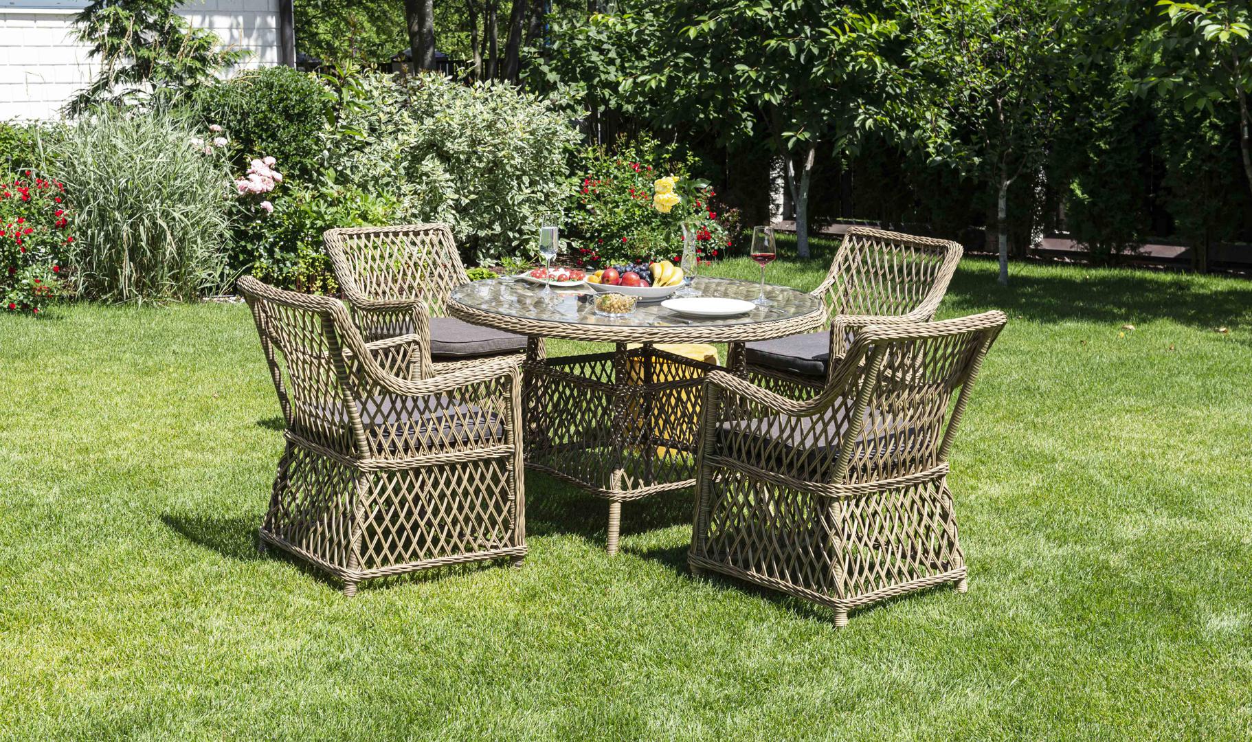 Классическая уличная обеденная группа «Доппио» для сада, летней веранды ресторана. В комплекте круглый обеденный стол «Эспрессо» (1180×1180×750 мм) с ударопрочной стеклянной столешницей и 4 кресла коллекции «Латте» 550×660×850 мм. Каркас мебели выполнен из прочного и легкого алюминия, вручную оплетенного круглым синтетическим ротангом натурального соломенного оттенка. На креслах предусмотрены мягкие подушки со съёмными чехлами серого цвета. Вы также можете приобрести каждый из элементов по "Эспрессо" плетеный круглый стол, диаметр 118 см, цвет соломенный 1шт. 1 180Х1 180Х750, "Латте" плетеное кресло из искусственного ротанга, цвет соломенный 4шт. 550Х660Х850,
