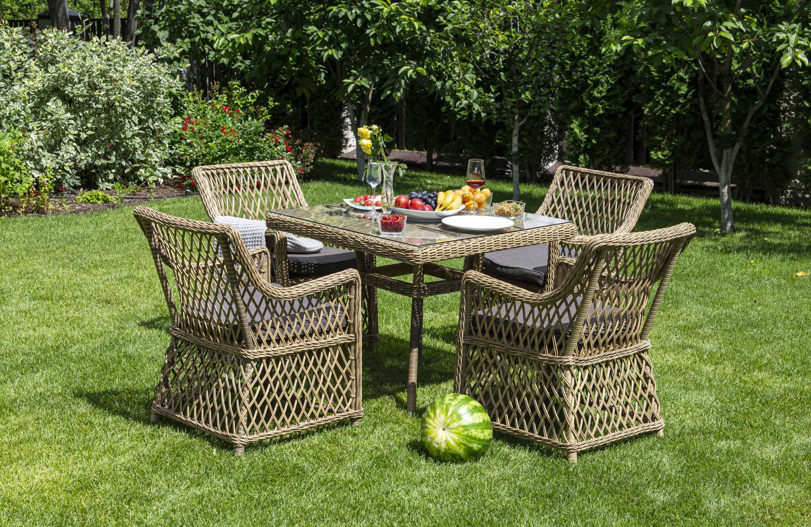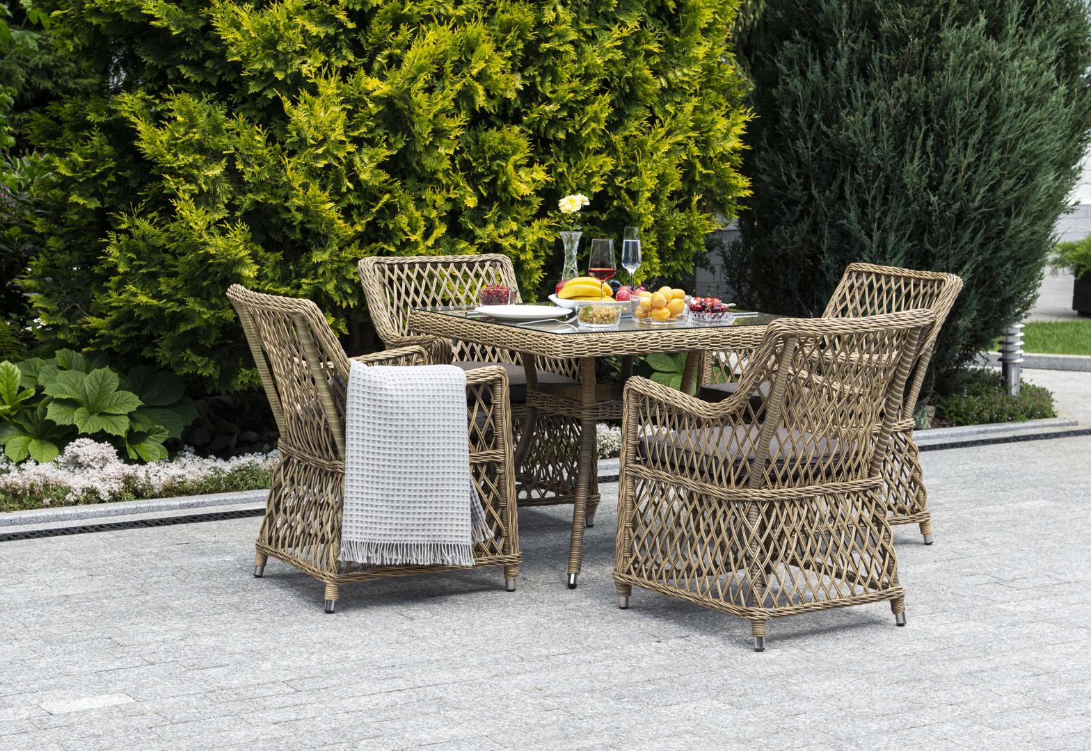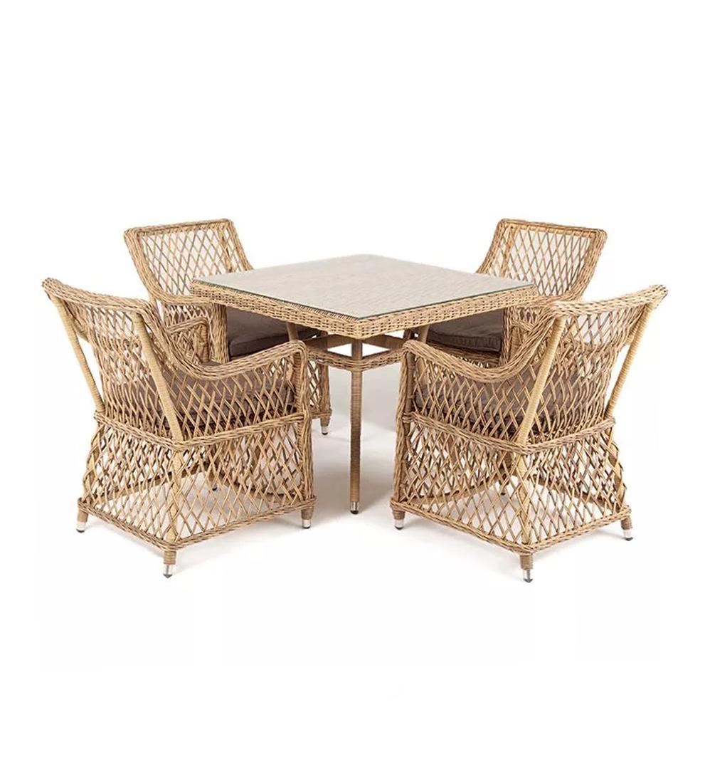 Изящная обеденная группа «Айриш» для сада. В комплекте: - квадратный обеденный стол, размером - 900×900×750 мм. - 4 классических кресла - 550×660×850 мм. Каркас мебели выполнен из прочного и легкого алюминия, оплетенного вручную долговечным искусственным ротангом натурального соломенного цвета, столешница – прочное стекло. На креслах предусмотрены подушки со съёмными чехлами для удобства ухода. Оригинальный дизайн украсит открытое пространство в саду, на террасе, летней площадке ка "Латте" плетеное кресло из искусственного ротанга, цвет соломенный 4шт. 550Х660Х850, "Айриш" стол плетеный из искусственного ротанга, цвет соломенный 1шт. 900Х900Х750,