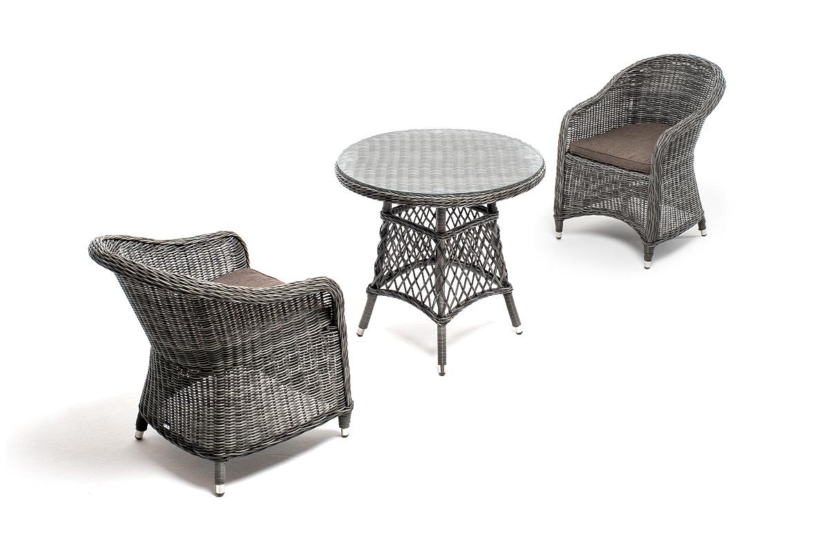 Комплект «Эспрессо-80 R» можно использовать в качестве обеденной группы на 2 персоны или как кофейный комплект на балконе или террасе. В плетеный комплект входит круглый стол «Эспрессо» диаметром 80 см с ударопрочной стеклянной столешницей и 2 кресла коллекции «Равенна» 570×680×810 мм. Набор представлен в графитовом цвете. Параметры кресел без подушек: Глубина сидения – 500 мм; Высота сидения – 440 мм; Высота спинки – 400 мм. "Эспрессо" плетеный круглый стол, диаметр 80 см, цвет графит 1шт. 800Х800Х750, "Равенна" плетеное кресло из искусственного ротанга, цвет графит 2шт. 570Х680Х810,