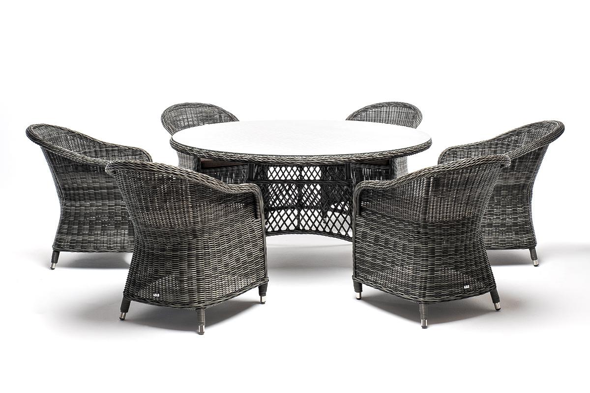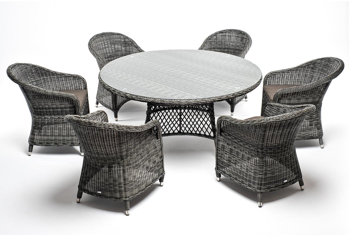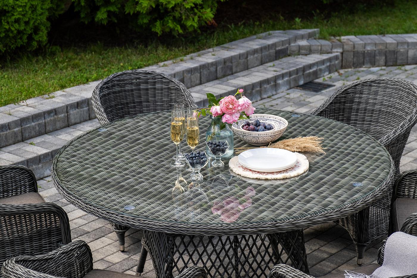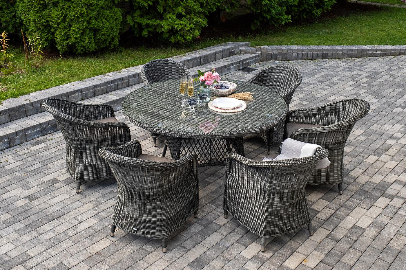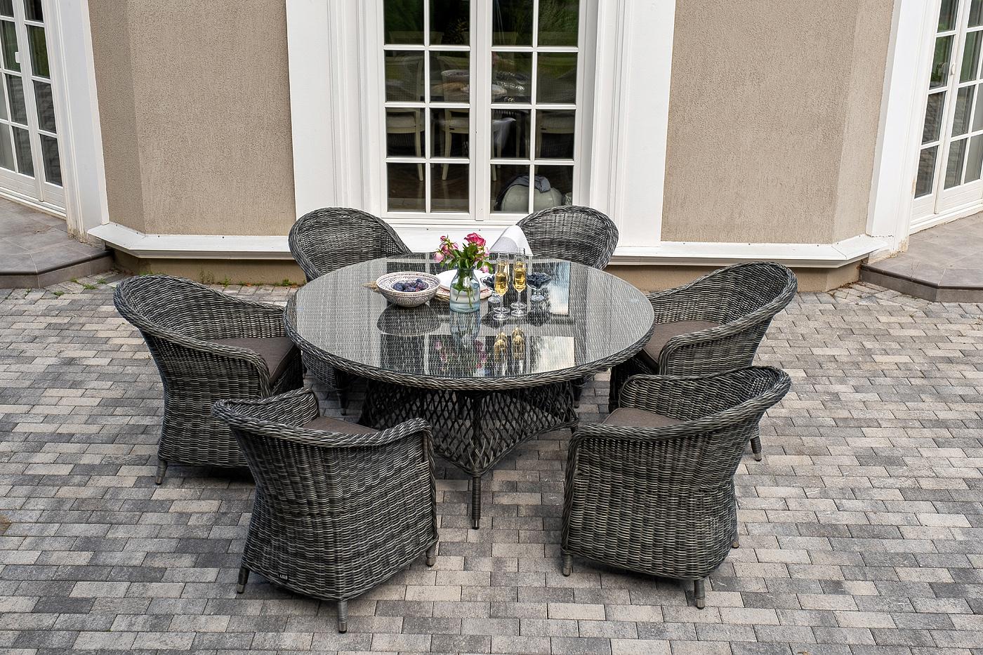 В комплект входит: - круглый обеденный стол «Эспрессо» (1500×1500×750 мм) с ударопрочной стеклянной столешницей; - 6 кресел коллекции «Равенна» (570×680×810 мм). Вся мебель изготовлена из долговечного и легкого алюминия, обтянутого синтетическим ротангом. На столе для удобства эксплуатации предусмотрена столешница из ударопрочного закаленного стекла 5 мм. Стулья укомплектованы подушками на сидениях. Параметры кресел без подушек: Глубина сидения – 500 мм; Высота сидения – 440 мм; Высота спинк "Равенна" плетеное кресло из искусственного ротанга, цвет графит 6шт. 570Х680Х810, "Эспрессо" плетеный круглый стол, диаметр 150 см, цвет графит 1шт. 1 500Х1 500Х750,