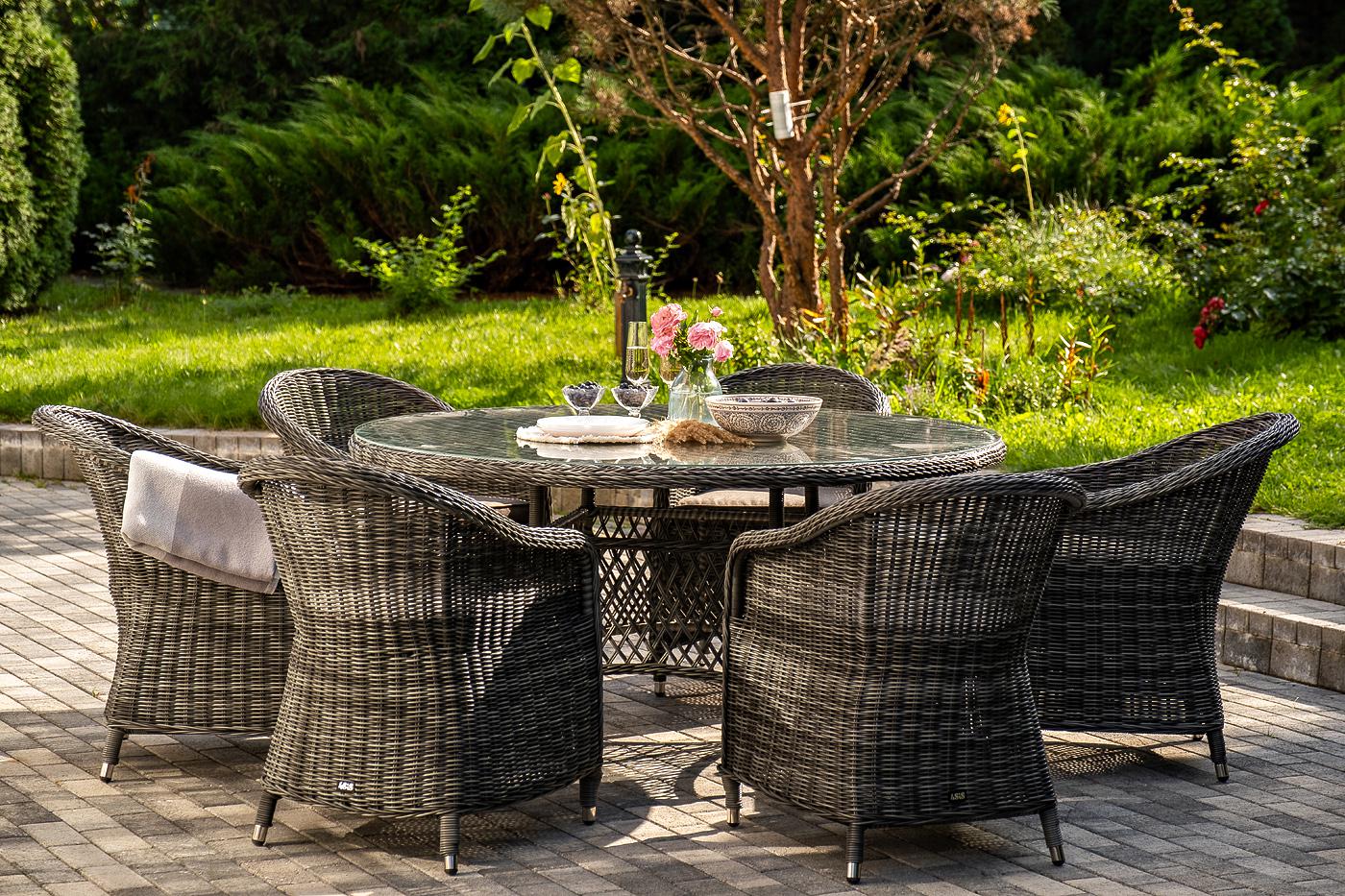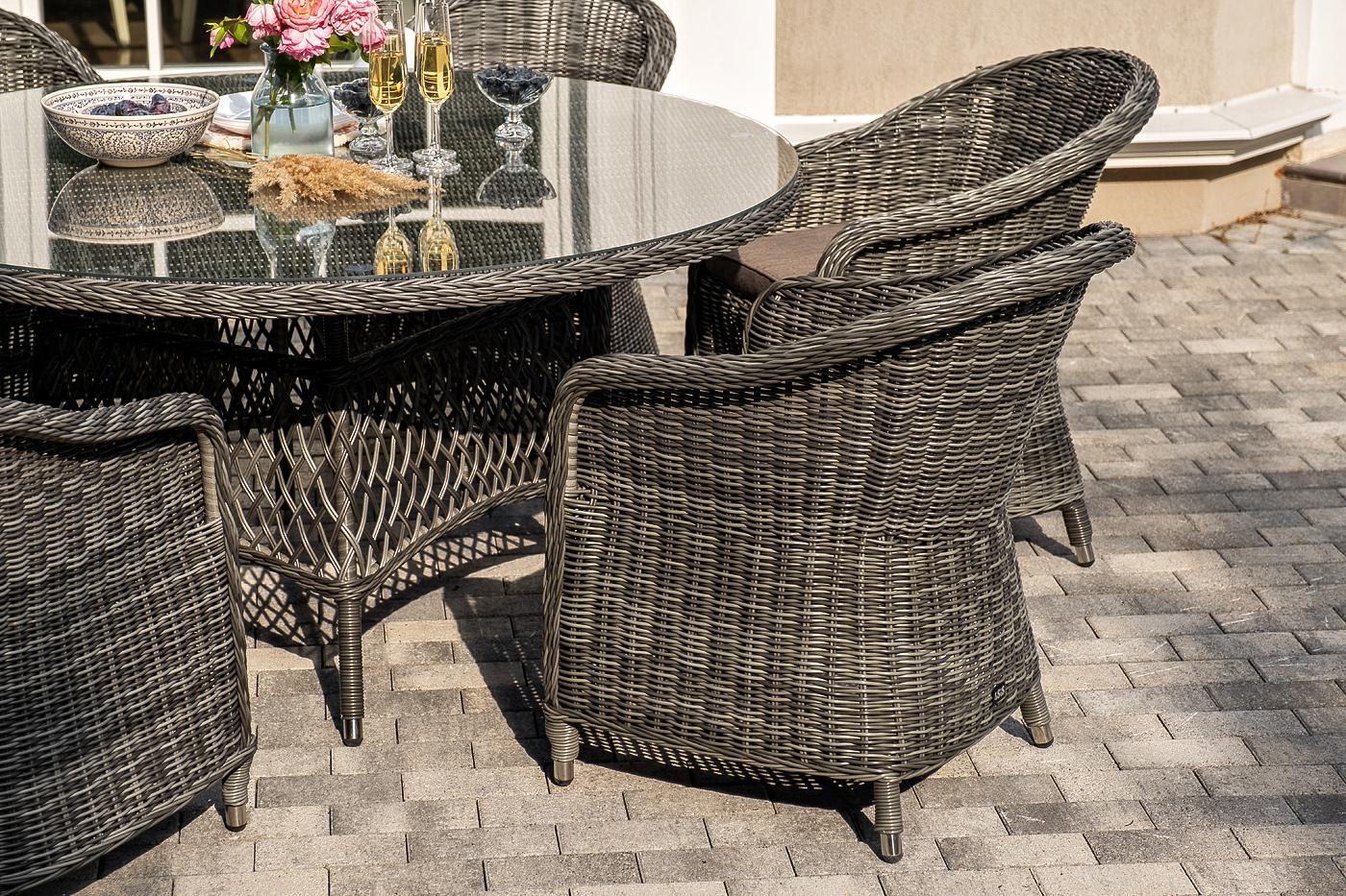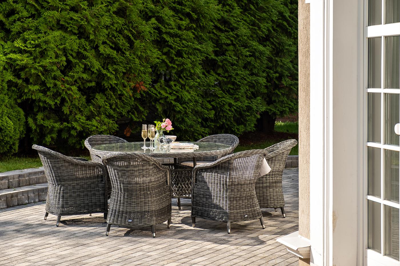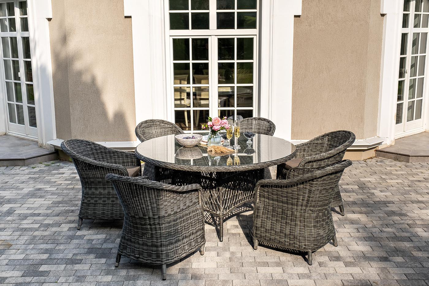 В комплект входит: - круглый обеденный стол «Эспрессо» (1500×1500×750 мм) с ударопрочной стеклянной столешницей; - 6 кресел коллекции «Равенна» (570×680×810 мм). Вся мебель изготовлена из долговечного и легкого алюминия, обтянутого синтетическим ротангом. На столе для удобства эксплуатации предусмотрена столешница из ударопрочного закаленного стекла 5 мм. Стулья укомплектованы подушками на сидениях. Параметры кресел без подушек: Глубина сидения – 500 мм; Высота сидения – 440 мм; Высота спинк "Равенна" плетеное кресло из искусственного ротанга, цвет графит 6шт. 570Х680Х810, "Эспрессо" плетеный круглый стол, диаметр 150 см, цвет графит 1шт. 1 500Х1 500Х750,