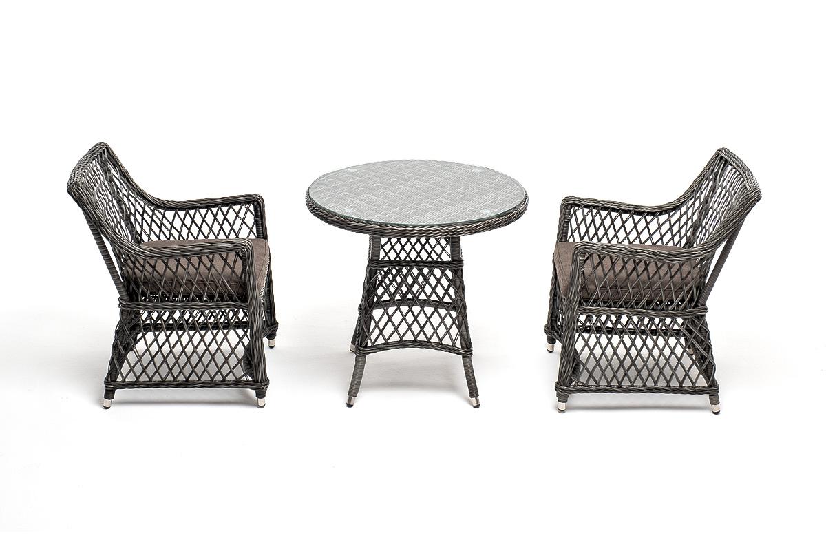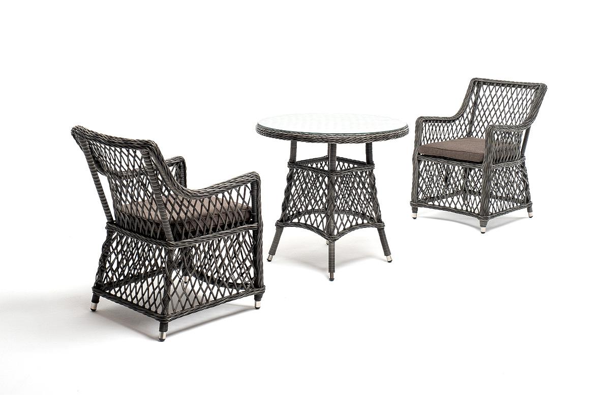 Комплект «Эспрессо–80 L» можно использовать в качестве обеденной группы на 2 персоны или как кофейный комплект на балконе или террасе. В плетеный комплект входит круглый стол «Эспрессо» диаметром 80 см с ударопрочной стеклянной столешницей и 2 кресла коллекции «Латте» 550×660×850 мм. Набор представлен в графитовом цвете. Параметры кресел без подушек: Глубина сидения – 480 мм; Высота сидения – 400 мм; Высота спинки – 460 мм. "Эспрессо" плетеный круглый стол, диаметр 80 см, цвет графит 1шт. 800Х800Х750, "Латте" плетеное кресло из искусственного ротанга, цвет графит 2шт. 550Х660Х850,