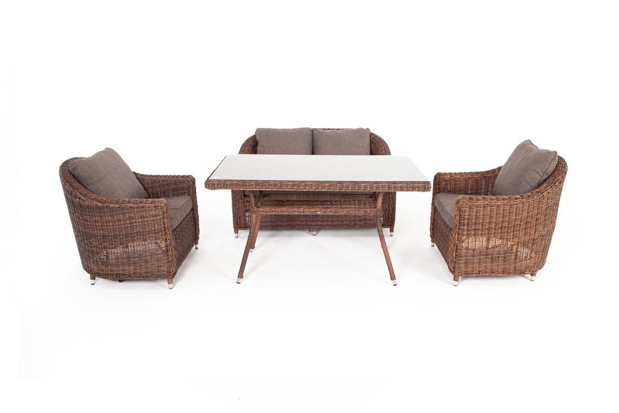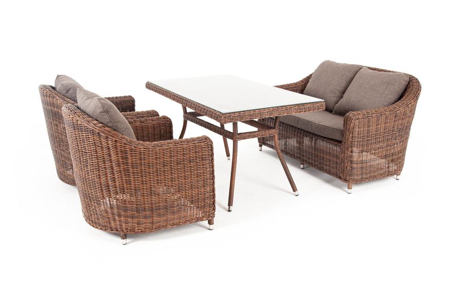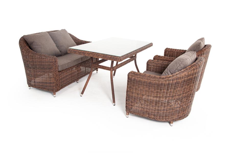 Обеденная группа «Кон Панна», рассчитана на 4 персоны. В ее состав входят: - два плетеных кресла – 800×800×800 мм. - двухместный диван – 1370×800×800 мм. - обеденный стол – 1400×800×750 мм. "Кон Панна" диван из искусственного ротанга двухместный, цвет коричневый 1шт. 1 370Х800Х800, "Латте" плетеный стол из искусственного ротанга 140х80см, цвет коричневый 1шт. 1 400Х800Х750, "Кон Панна" кресло из искусственного ротанга, цвет коричневый 2шт. 800Х800Х800,