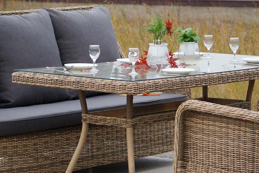 Обеденная группа «Гляссе» подойдет для компании из 5 человек. В ее составе: - трехместный диван «Гляссе» – 1900×880×990 мм. - два кресла «Гляссе» – 730×880×990 мм. - стол «Латте» – 1600×900×750 мм. Каркас мебели алюминиевый. Он оформлен с помощью искусственного ротанга круглой формы и был оплетен ручным способом. Цвет плетение - соломенный. На креслах и диване располагаются мягкие подушки серого цвета. Съёмные чехлы подушек пошиты из полиэстера. Материал имеет плотность 300гр/м2. В "Гляссе" диван трехместный из искусственного ротанга, цвет соломенный 1шт. 1 900Х880Х990, "Гляссе" кресло плетеное из искусственного ротанга, цвет соломенный 2шт. 730Х880Х990, "Латте" плетеный стол из искусственного ротанга 160х90см, цвет соломенный 1шт. 1 600Х900Х750,