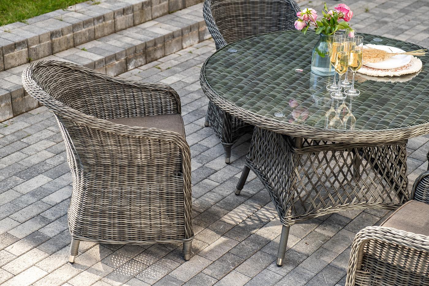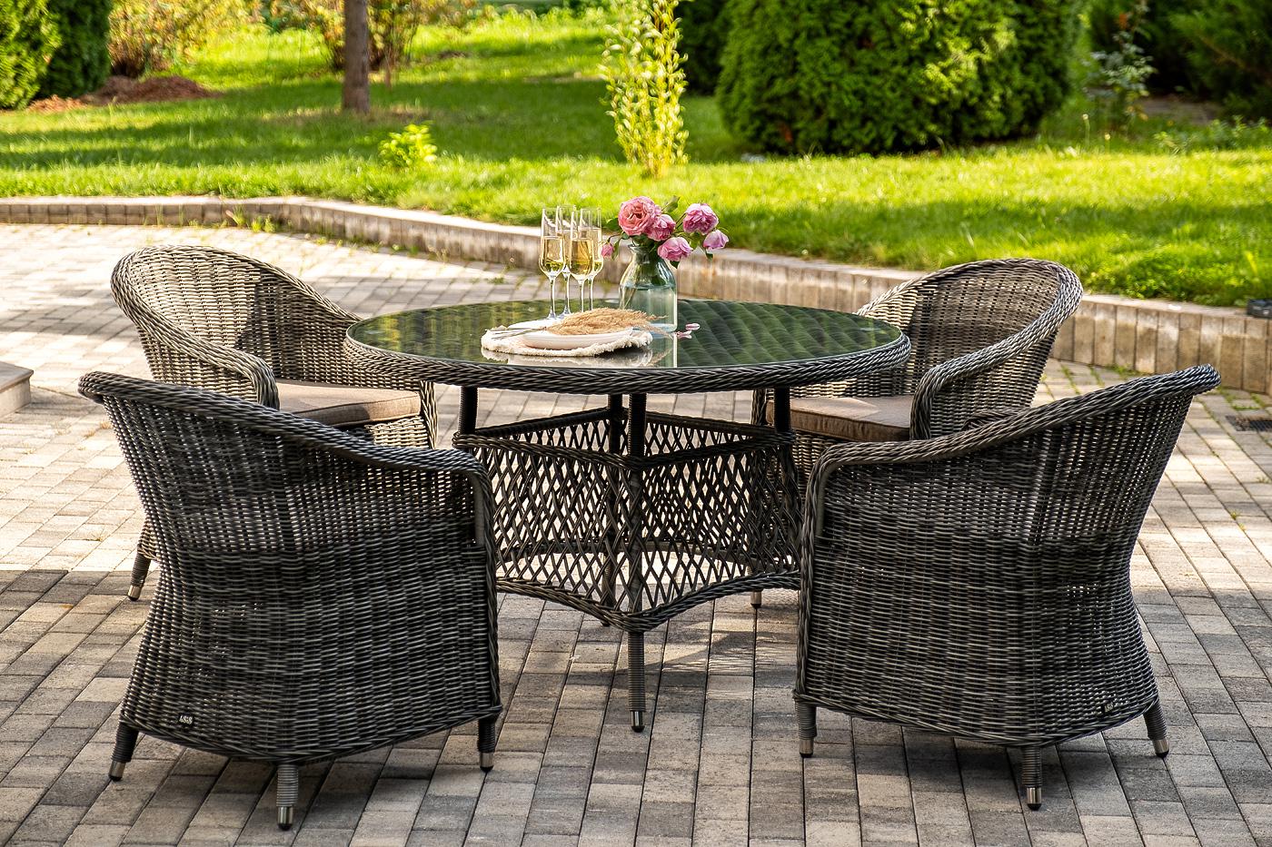 Уличная обеденная группа «Эспрессо» для обустройства зоны отдыха. В комплект входит: - круглый обеденный стол «Эспрессо» (1180×1180×750 мм) с ударопрочной стеклянной столешницей; - 4 кресел коллекции «Равенна» (570×680×810 мм). Вся мебель изготовлена из алюминия, поэтому ее очень легко перемещать. Декоративное покрытие выполнено из долговечного искусственного ротанга, устойчивого к перепадам температур и переменам погоды. Столешница изготовлена из прочного закаленного стекла 5 мм, кресла укомп "Эспрессо" плетеный круглый стол, диаметр 118 см, цвет графит 1шт. 1 180Х1 180Х750, "Равенна" плетеное кресло из искусственного ротанга, цвет графит 4шт. 570Х680Х810,