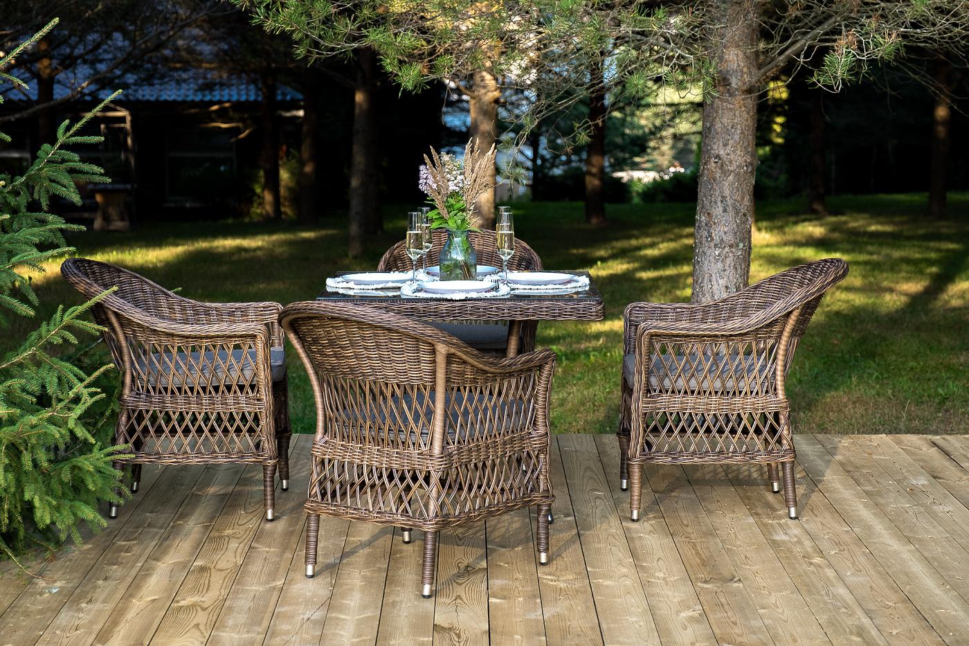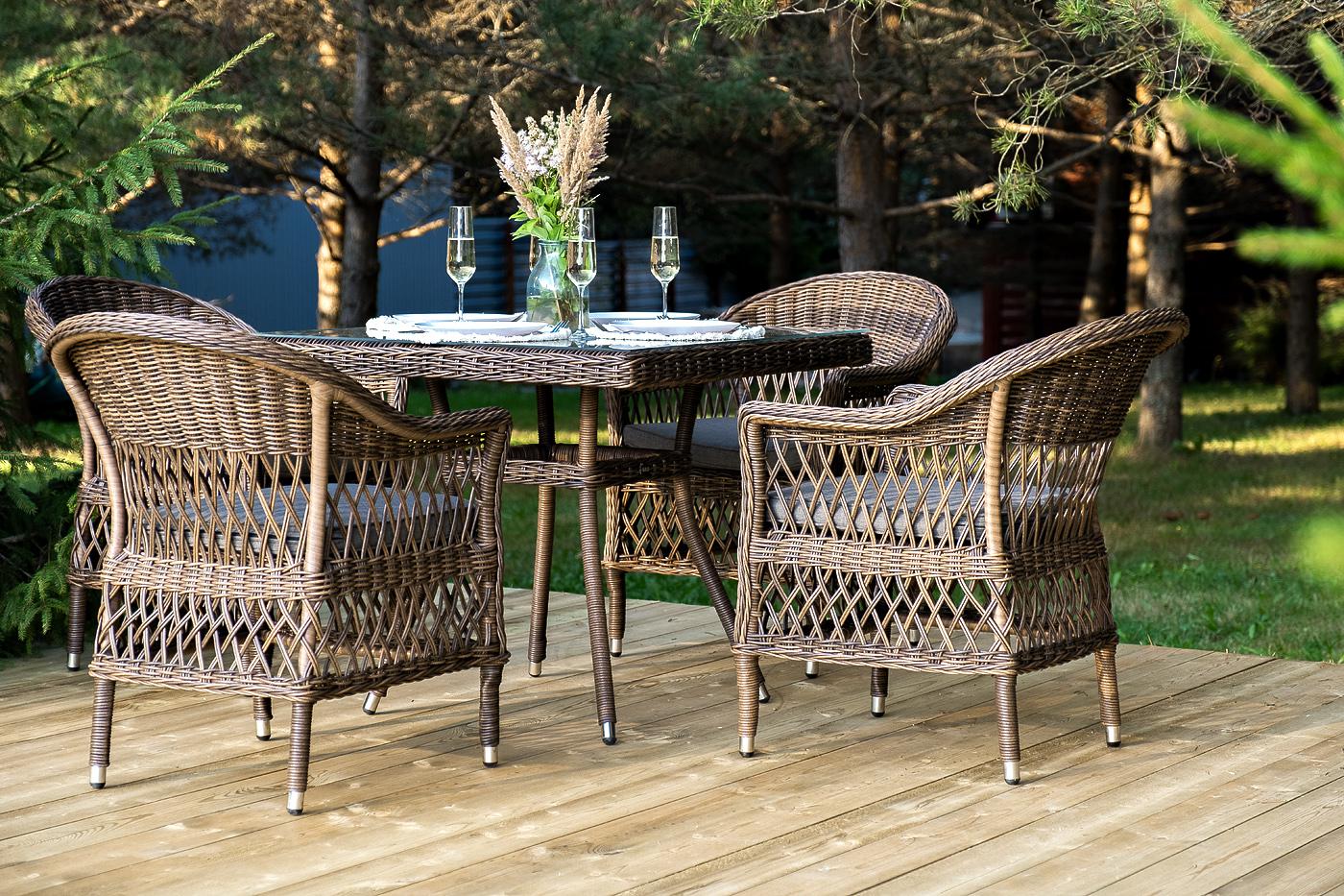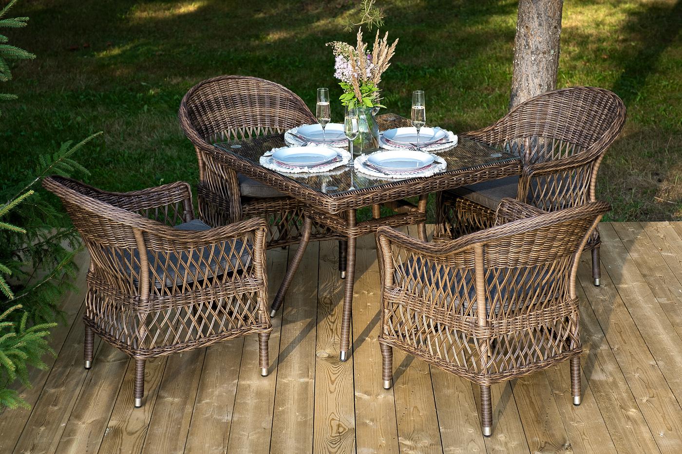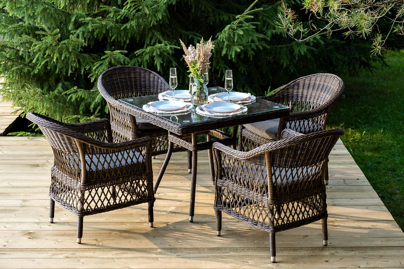 Комплект «Сицилия» - это обеденная группа из искусственного ротанга, которая рассчитана на 4 персоны. В комплект входит: - обеденный стол (900×900×750 мм). - 4 обеденных стула (590×640×820 мм). Мебель имеет надежный каркас из легкого алюминия. Изделия дополнительно оплетены ручным методом круглым искусственным ротангом натурального коричневого цвета. Стол оборудован столешницей из закаленного стекла, которой не страшна горячая посуда. Кресла оснащены подушками со съёмными чехлами серого ц "Айриш" стол плетеный из искусственного ротанга, цвет коричневый 1шт. 900Х900Х750, "Сицилия" плетеный стул из искусственного ротанга, цвет коричневый 4шт. 590Х640Х820,