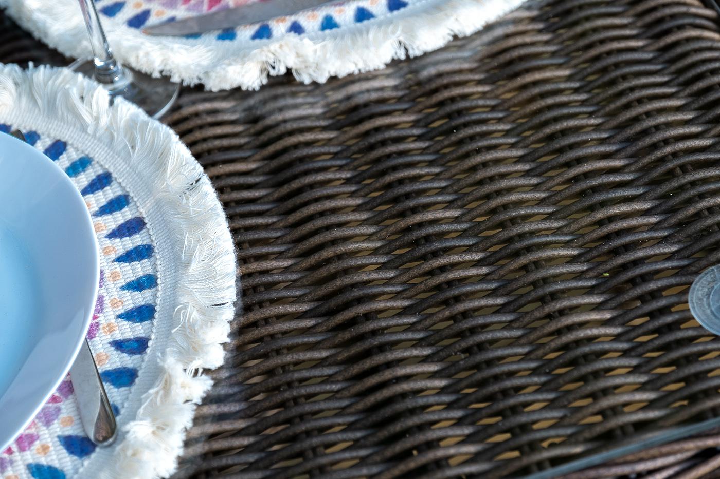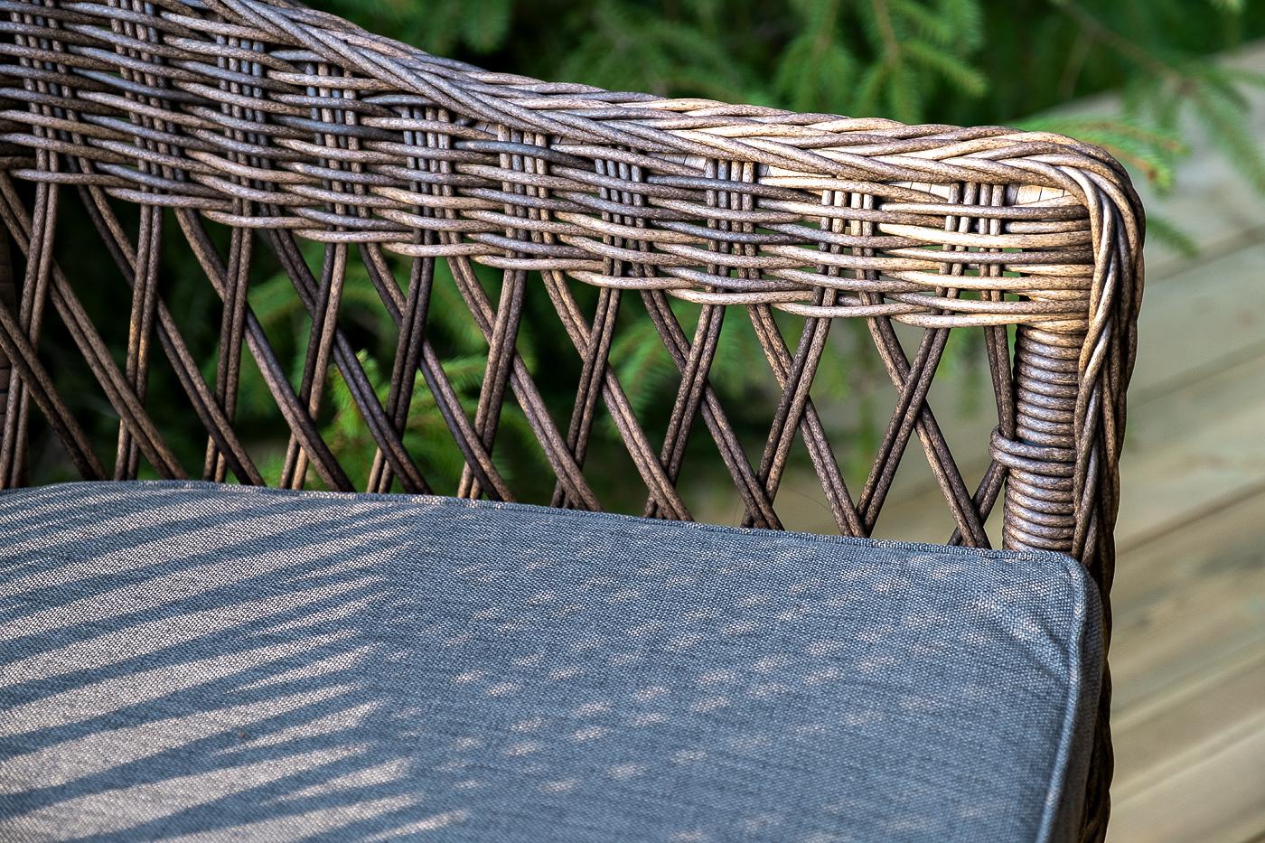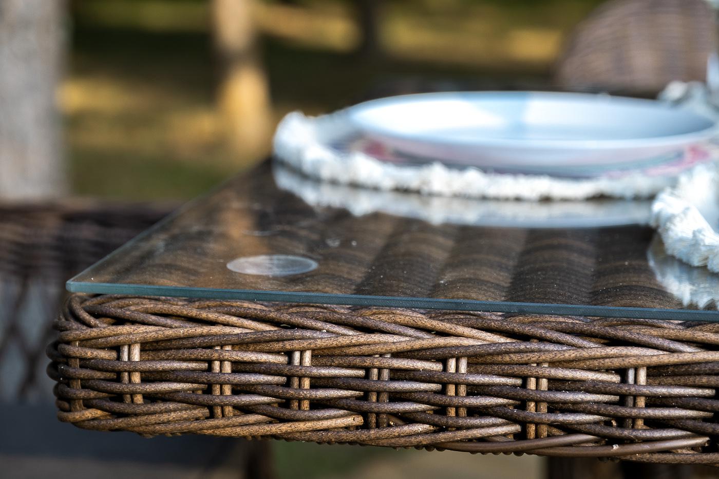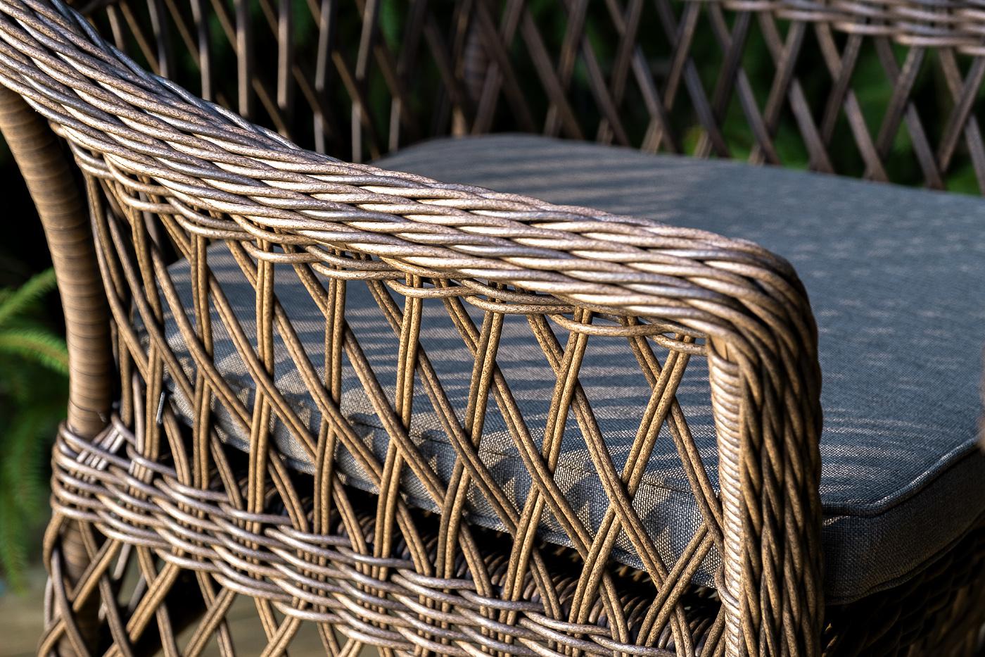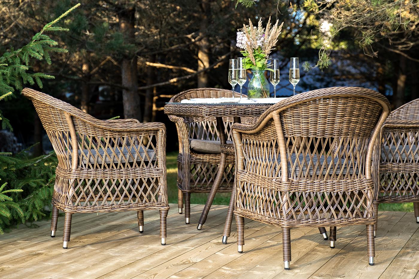 Комплект «Сицилия» - это обеденная группа из искусственного ротанга, которая рассчитана на 4 персоны. В комплект входит: - обеденный стол (900×900×750 мм). - 4 обеденных стула (590×640×820 мм). Мебель имеет надежный каркас из легкого алюминия. Изделия дополнительно оплетены ручным методом круглым искусственным ротангом натурального коричневого цвета. Стол оборудован столешницей из закаленного стекла, которой не страшна горячая посуда. Кресла оснащены подушками со съёмными чехлами серого ц "Айриш" стол плетеный из искусственного ротанга, цвет коричневый 1шт. 900Х900Х750, "Сицилия" плетеный стул из искусственного ротанга, цвет коричневый 4шт. 590Х640Х820,