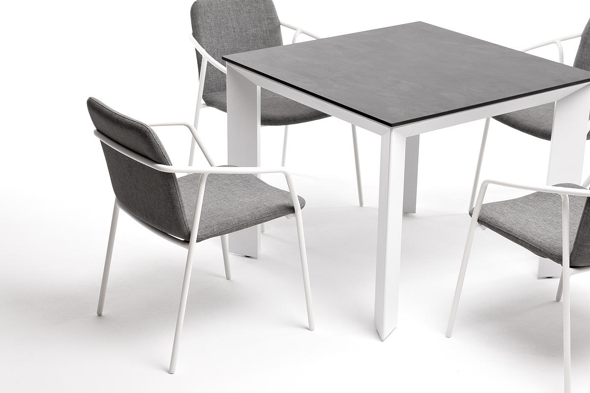 Обеденная группа «Венето» рассчитана на 4 персоны. В состав комплекта входит: - Стол «Венето» со столешницей из HPL-пластика, размер столешницы - 900×900 мм, цвет - «серый гранит». Высота стола - 750 мм - 4 стула «Марокко» из текстилена nanotex, современного материала для обивки мебели, размером - 575×600×800 мм, каркас белого цвета изготовлен из алюминия, что делает стул прочным и легким. "Венето" обеденный стол из HPL 90х90см, цвет "серый гранит", каркас белый 1шт. 900Х900Х750, "Марокко" стул из текстилена nanotex, алюминиевый каркас, цвет серый 4шт. 575Х600Х800,
