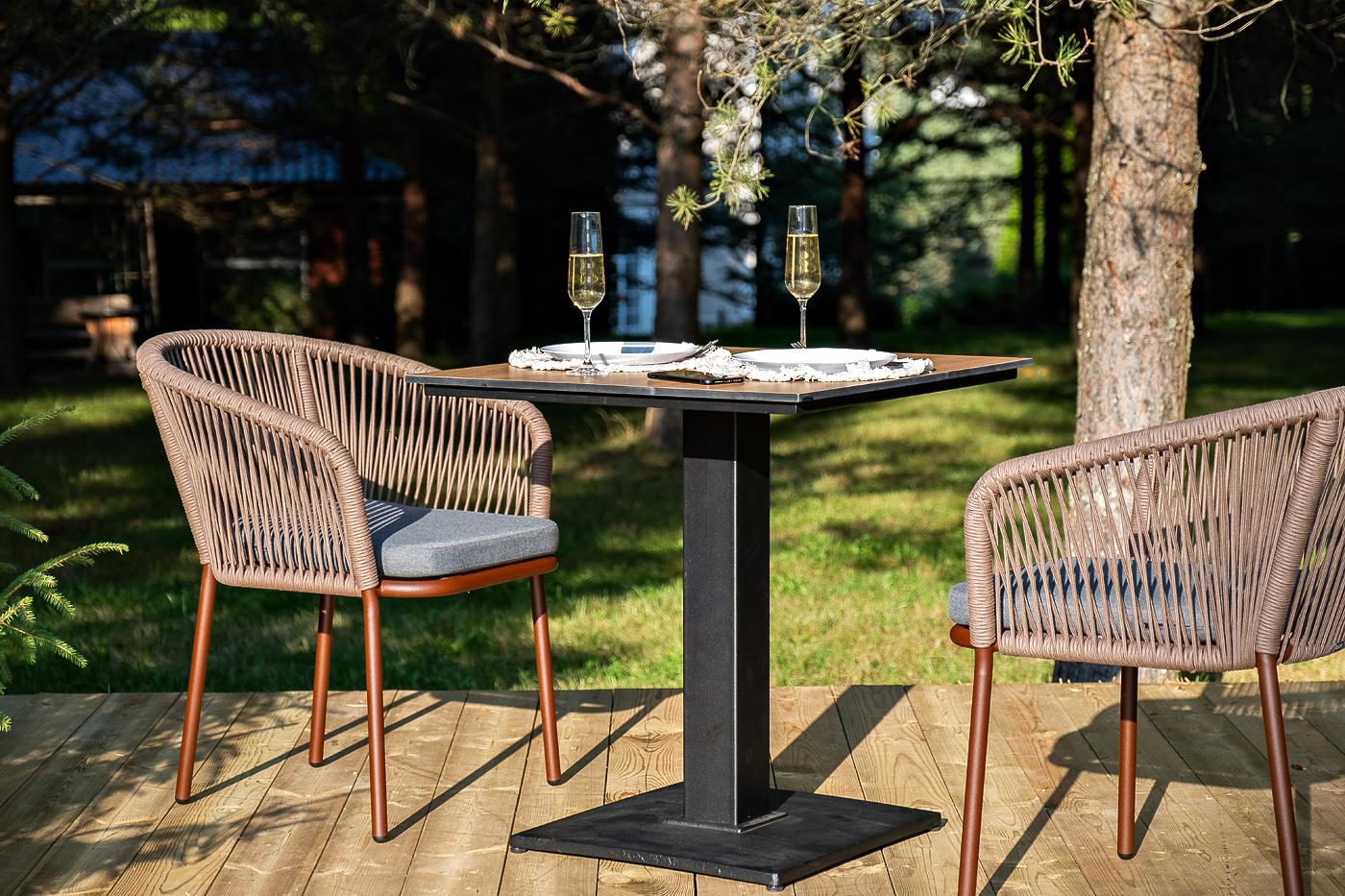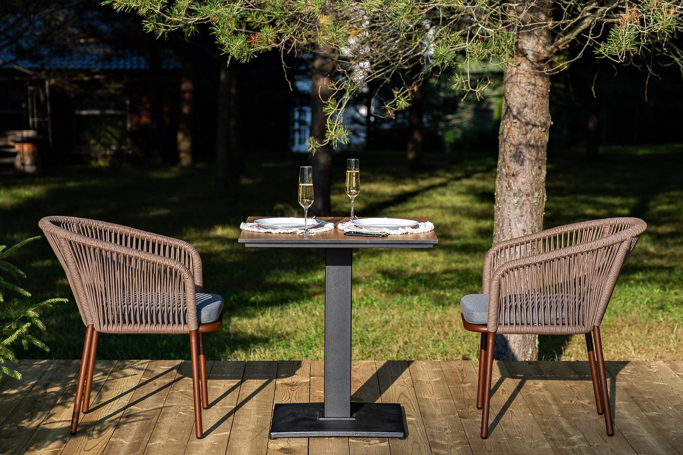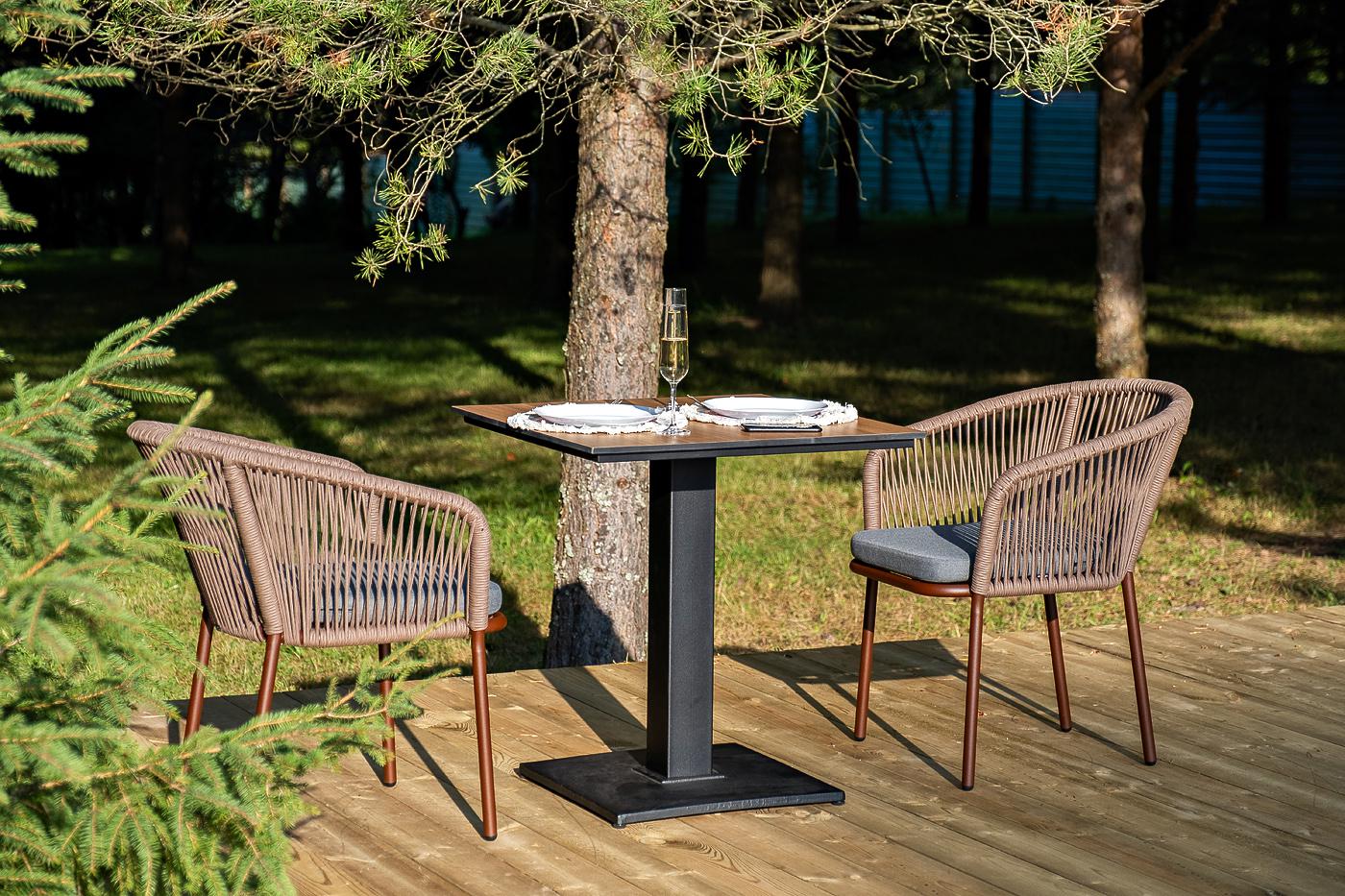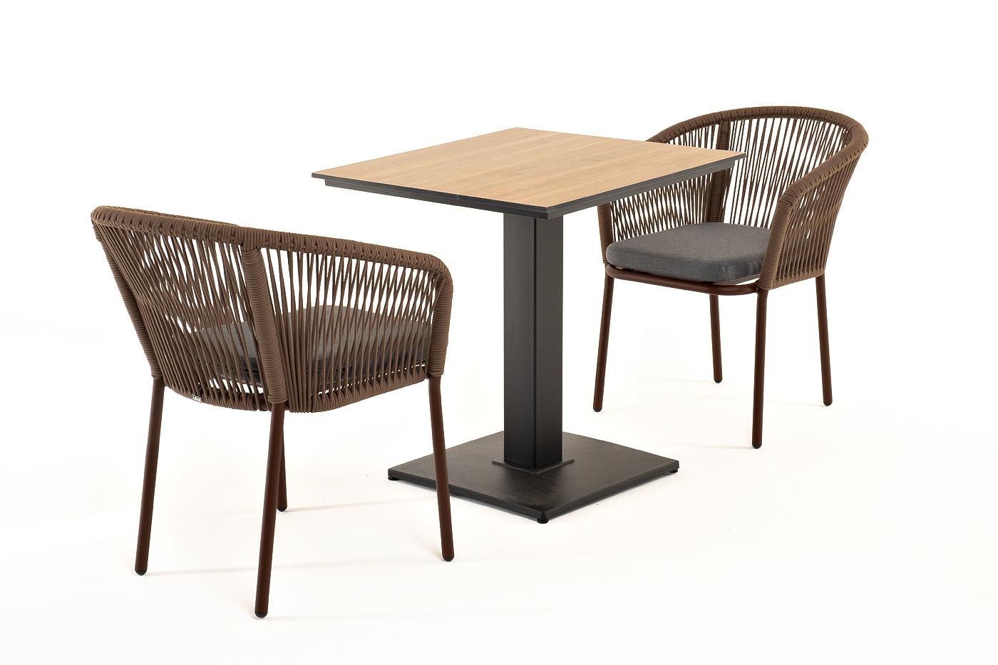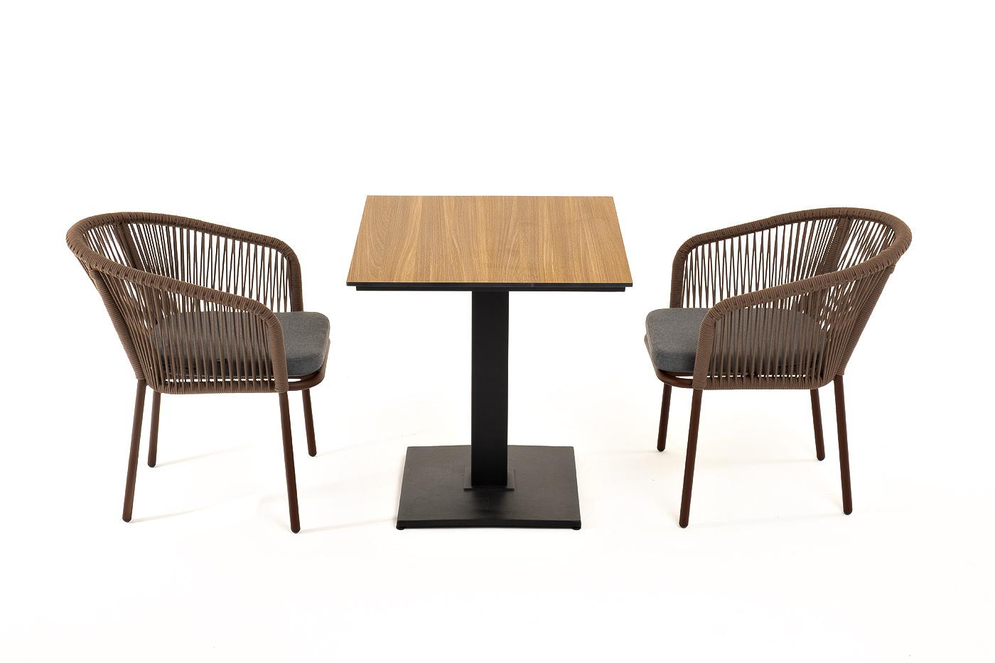 Обеденная группа «Каффе» рассчитана на 2 персоны. В состав комплекта входят: - стол со столешницей из HPL-пластика - 700×700×750 мм. - двух стульев «Марсель» - 570×620×775 мм. Интерьерный стол изготовлен из металлического подстолья, окрашенного в черный цвет, и столешницы из компактного пластика HPL в цвете «дуб». Благодаря массивному основанию столик устойчив на любых поверхностях. Стулья оснащены алюминиевым каркасом, которые вручную оплетены плоским роупом коричневого цвета. Габариты упако "Каффе" стол из HPL квадратный 70х70см, цвет "дуб" 1шт. 700Х700Х750, "Марсель" стул плетеный из роупа, каркас алюминий коричневый (RAL8016) муар, роуп коричневый круглый, ткань темно-серая 027 2шт. 570Х620Х775,
