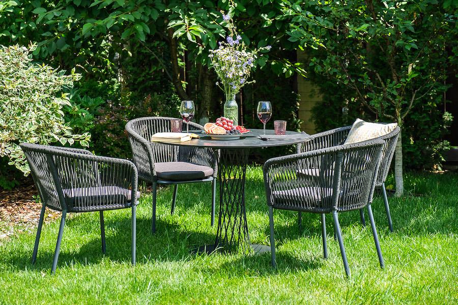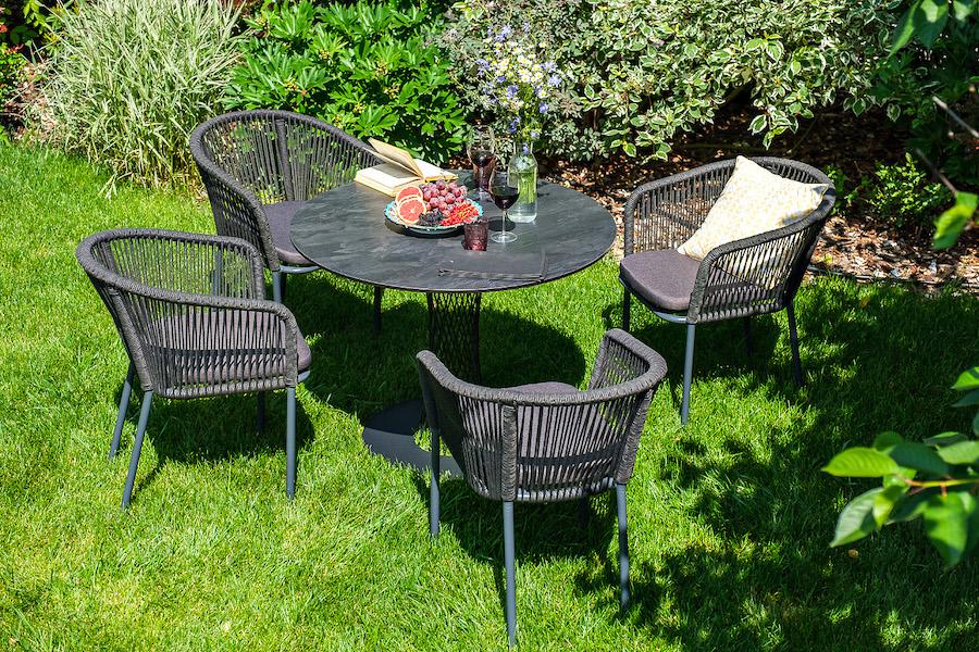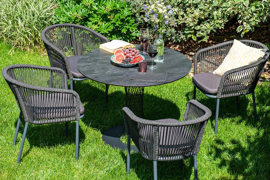 Обеденная группа «Диего» для интерьерных решений. Состоит из ккруглого обеденного стола со столешницей, диаметром 90см. Материал столешницы выполнен из высококачественного монолитного компакт-пластика HPL в цвете «серый гранит». Подстолье - нержавеющая сталь черного цвета. 4 кресла из коллекции «Марсель», выполненных из алюминиевого каркаса и ручной оплетки роупом. Это эластичные синтетические ленты из высокопрочных полиэфирных волокон, представлены в темно-сером цвете. В комплект также в "Марсель" стул плетеный из роупа, каркас алюминий темно-серый (RAL7024) муар, роуп темно-серый круглый, ткань темно-серая 027 4шт. 570Х620Х775, "Диего" обеденный стол из HPL круглый Ø90см, цвет "серый гранит" 1шт. 900Х900Х750,