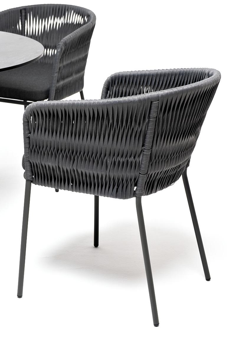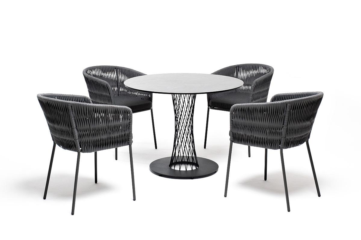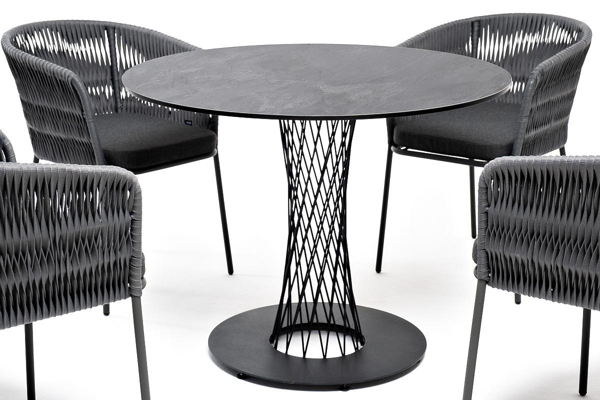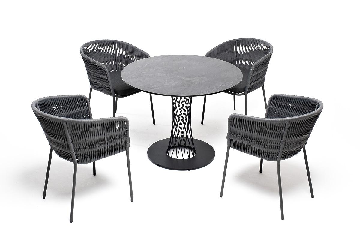 Обеденная группа «Диего» предназначена для комфортного размещения 4 человек. В комплект входят стол «Диего» с HPL-пластиковой столешницей, диаметром 900 мм в цвете «серый гранит». Высота данного стола составляет 750 мм, что обеспечивает оптимальный уровень для сидения и расположения посуды. Вместе с этим, в комплектацию входит 4 плетеных стула «Бордо», выполненных с использованием высокопрочного роуп-волокна серого цвета с плетением вида «колос». Стулья имеют размеры 570×620×775 мм и устойчи "Диего" обеденный стол из HPL круглый Ø90см, цвет "серый гранит" 1шт. 900Х900Х750, "Бордо" стул плетеный из роупа (колос), каркас алюминий темно-серый (RAL7024) муар, роуп серый 15мм, ткань темно-серая 027 4шт. 570Х620Х775,