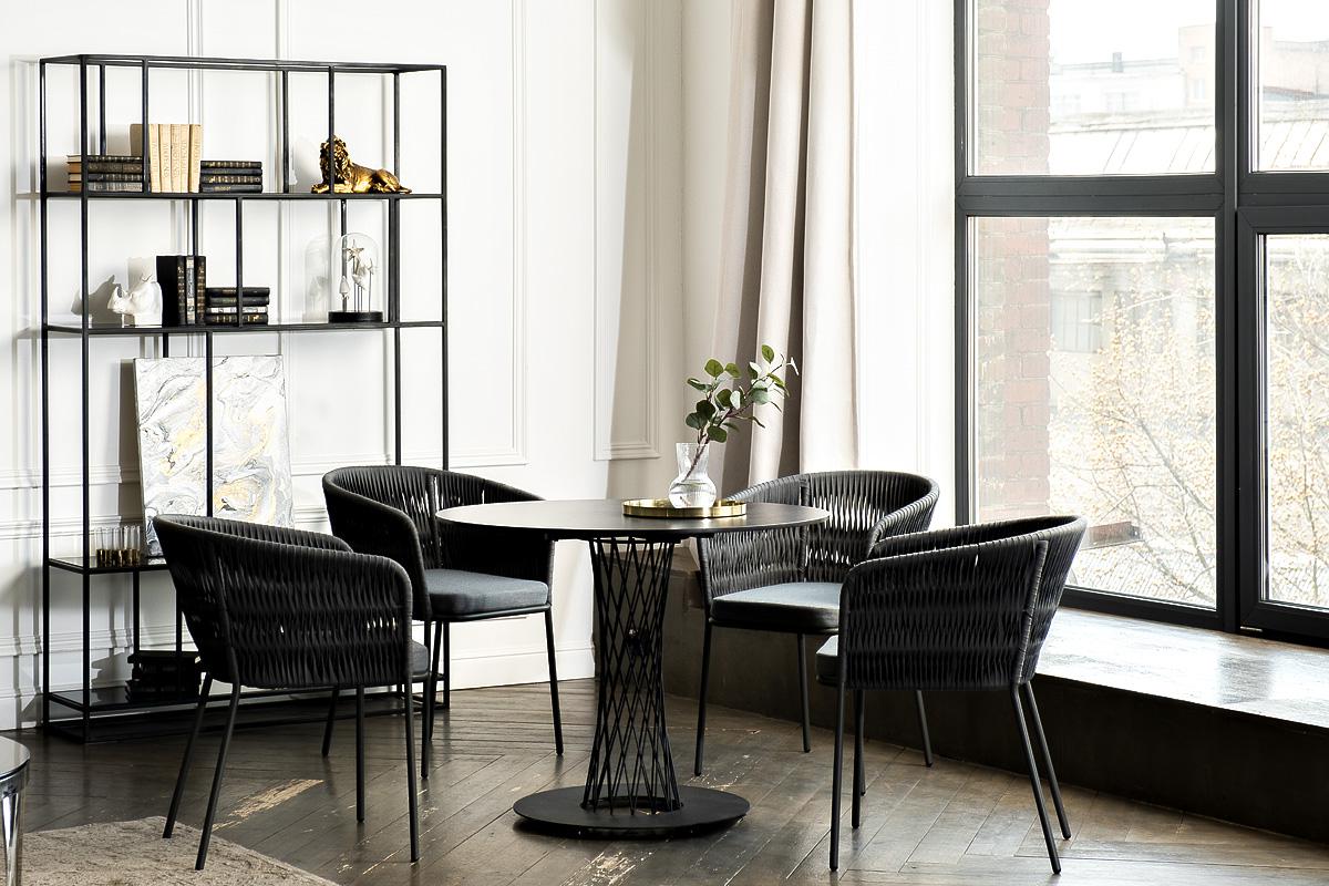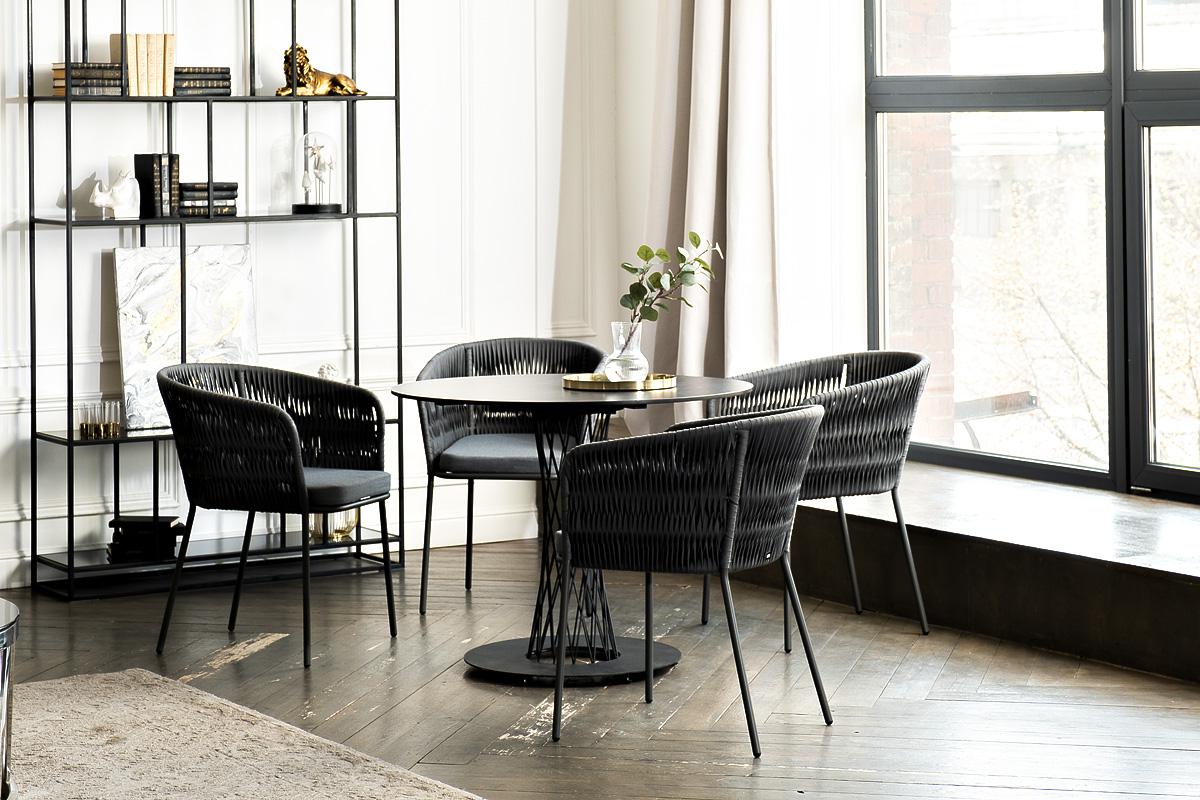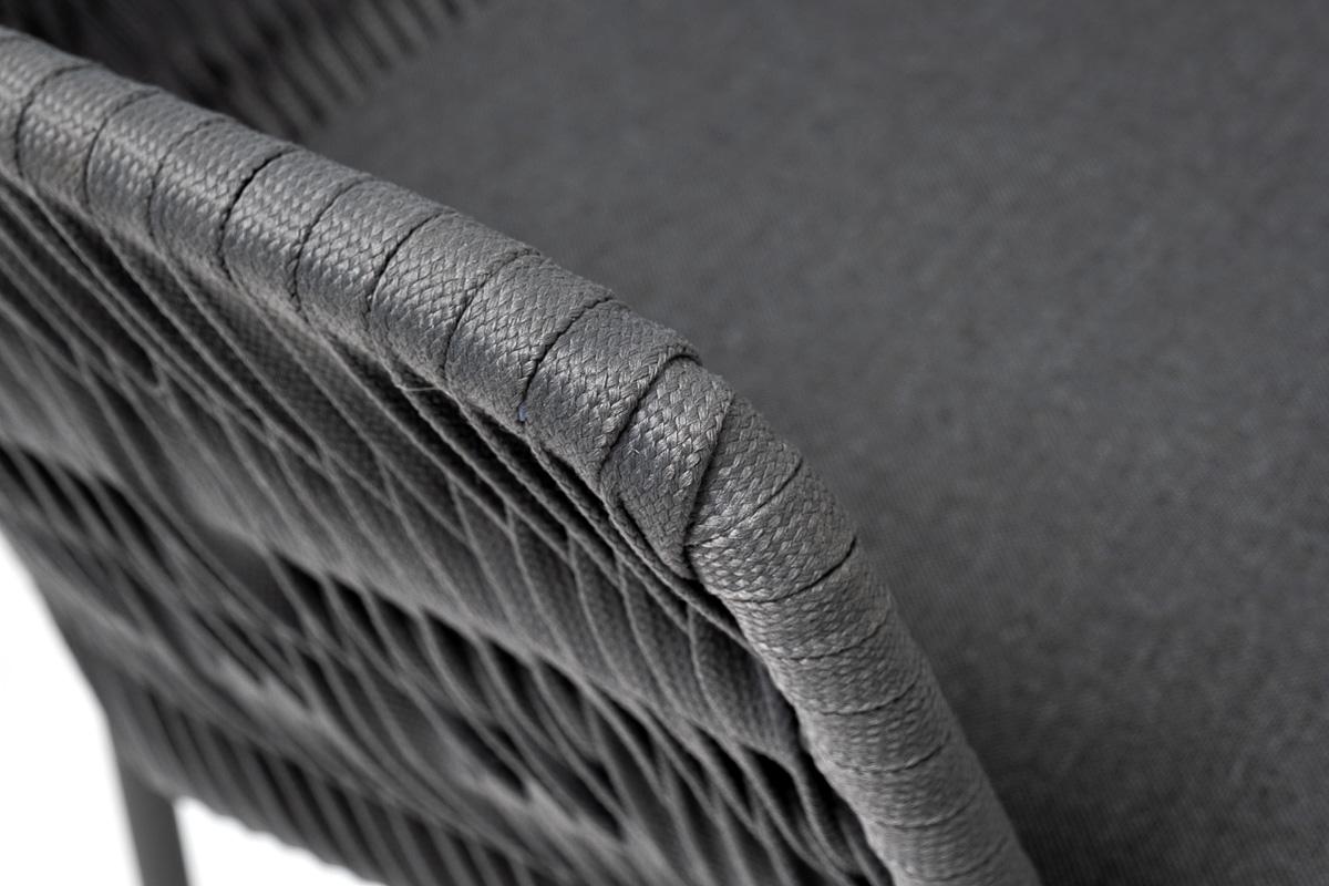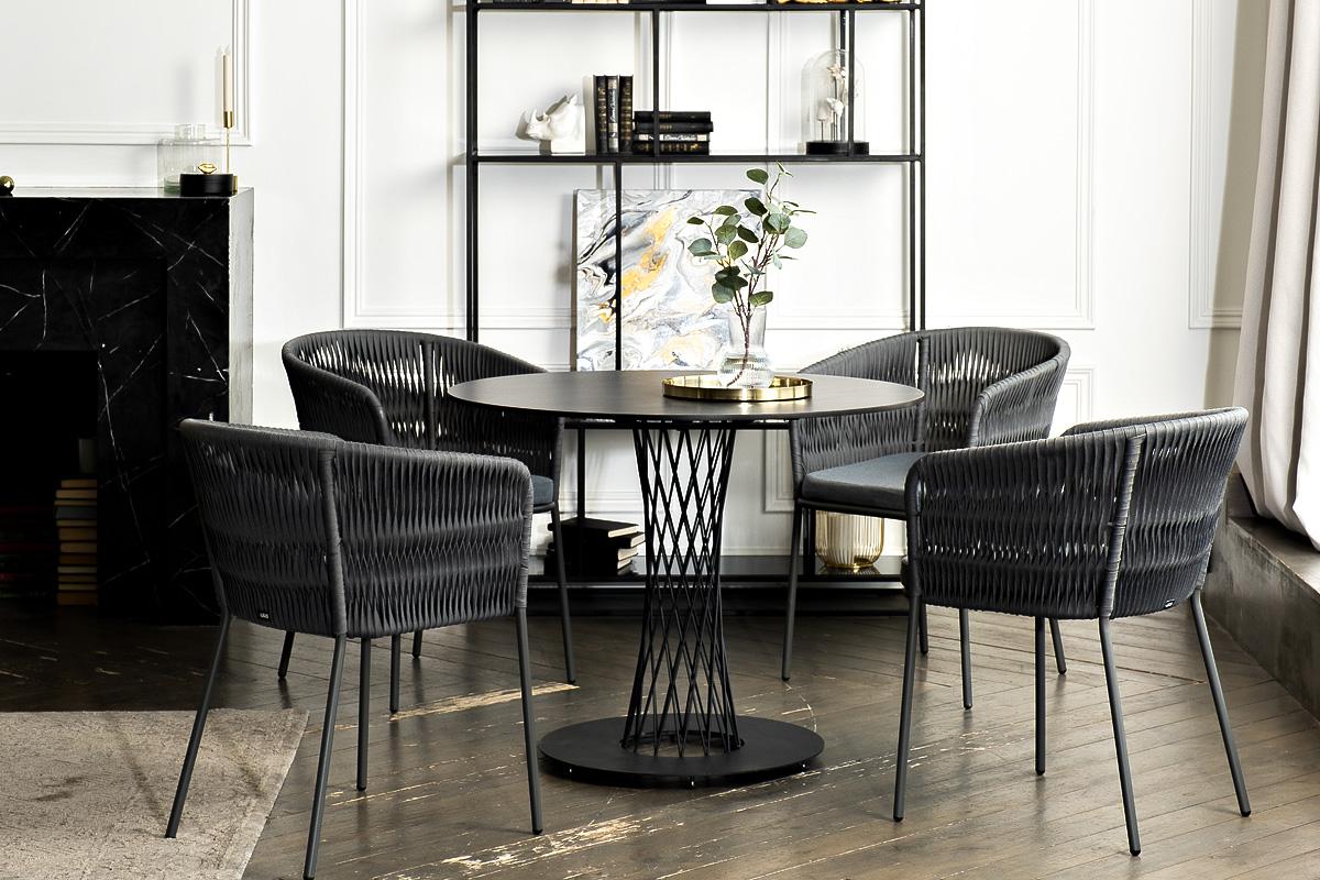 Обеденная группа «Диего» предназначена для комфортного размещения 4 человек. В комплект входят стол «Диего» с HPL-пластиковой столешницей, диаметром 900 мм в цвете «серый гранит». Высота данного стола составляет 750 мм, что обеспечивает оптимальный уровень для сидения и расположения посуды. Вместе с этим, в комплектацию входит 4 плетеных стула «Бордо», выполненных с использованием высокопрочного роуп-волокна серого цвета с плетением вида «колос». Стулья имеют размеры 570×620×775 мм и устойчи "Диего" обеденный стол из HPL круглый Ø90см, цвет "серый гранит" 1шт. 900Х900Х750, "Бордо" стул плетеный из роупа (колос), каркас алюминий темно-серый (RAL7024) муар, роуп серый 15мм, ткань темно-серая 027 4шт. 570Х620Х775,