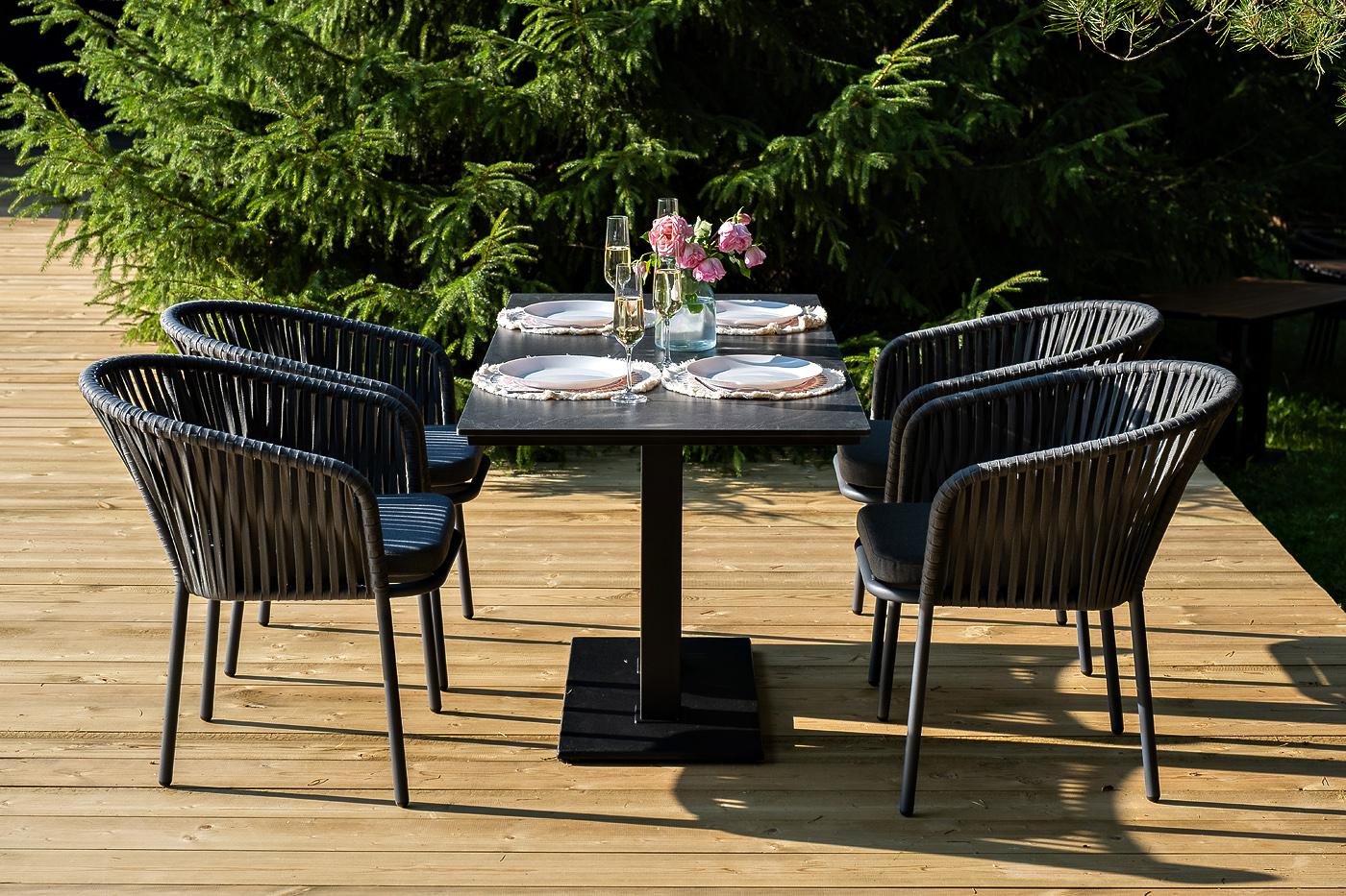 Обеденная группа «Каффе Дабл» рассчитана на 4 персоны. В состав комплекта входит: - Стол «Каффе» из HPL, размер столешницы - 140×70 см, цвет «серый гранит», подстолье двойное черное металл. - 4 плетеных стула «Бордо» из плоского роупа, размером - 570×620×775 мм, цвет роупа - серый, каркас - темно-серый (RAL7024). Габариты упаковки и комплектация четырех коробок: 1 кор. (столешница): 1460×720×80 мм – 24,6 кг. 2 кор. (ножки и основание): 780×480×140 мм – 25,4 кг. 3 кор. (стулья - 2 шт.): 750×650 "Бордо" стул плетеный из роупа, каркас алюминий темно-серый (RAL7024) муар, роуп серый 15мм, ткань темно-серая 027 4шт. 570Х620Х775, "Каффе" обеденный стол из HPL 140х70см, цвет "серый гранит", подстолье двойное черное 1шт. 1 400Х700Х750,