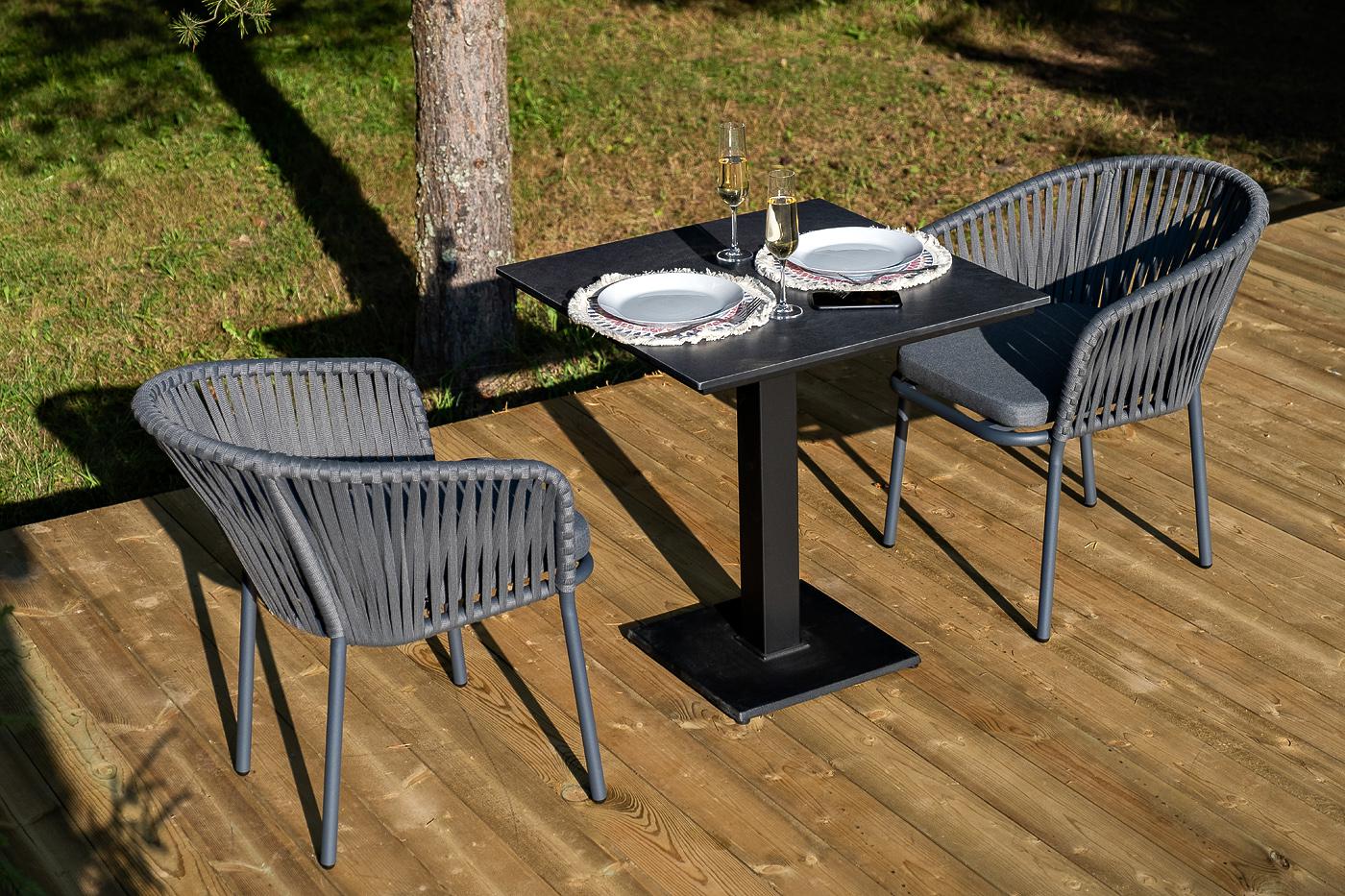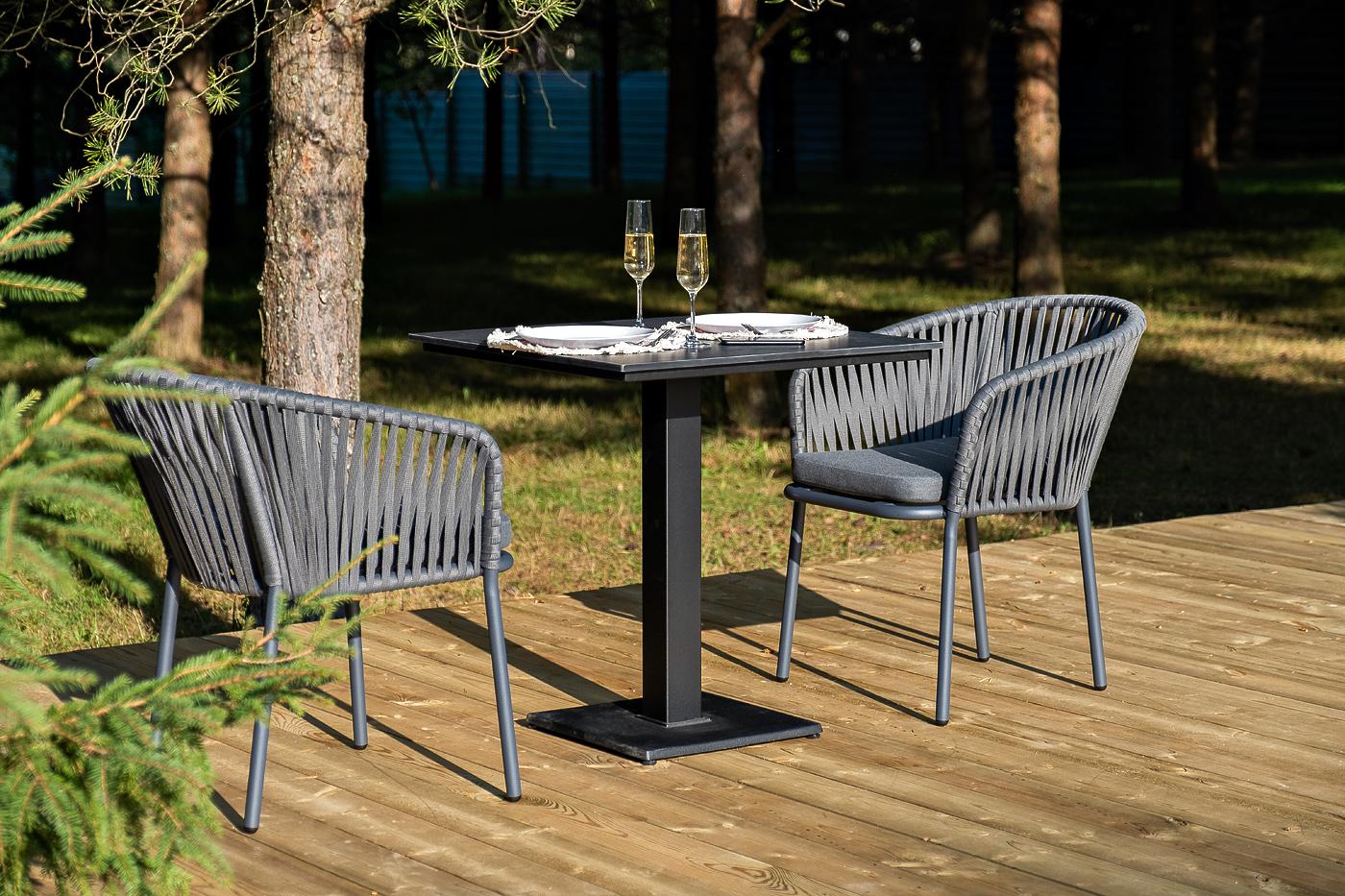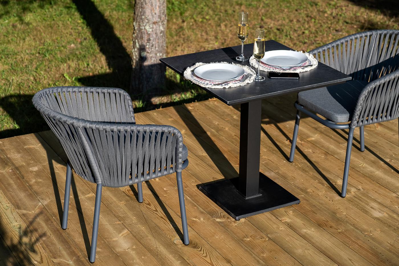 Обеденная группа «Каффе» рассчитана на 2 персоны. В состав комплекта входят: - стол со столешницей из HPL-пластика - 700×700×750 мм. - двух стульев «Бордо» - 570×620×775 мм. Интерьерный стол изготовлен из металлического подстолья, окрашенного в черный цвет, и столешницы из компактного пластика HPL в цвете «серый гранит». Благодаря массивному основанию столик устойчив на любых поверхностях. Стулья оснащены алюминиевым каркасом, которые вручную оплетены плоским роупом серого цвета. Габариты упа "Бордо" стул плетеный из роупа, каркас алюминий темно-серый (RAL7024) муар, роуп серый 15мм, ткань темно-серая 027 2шт. 570Х620Х775, "Каффе" стол из HPL квадратный 70х70см, цвет "серый гранит" 1шт. 700Х700Х750,