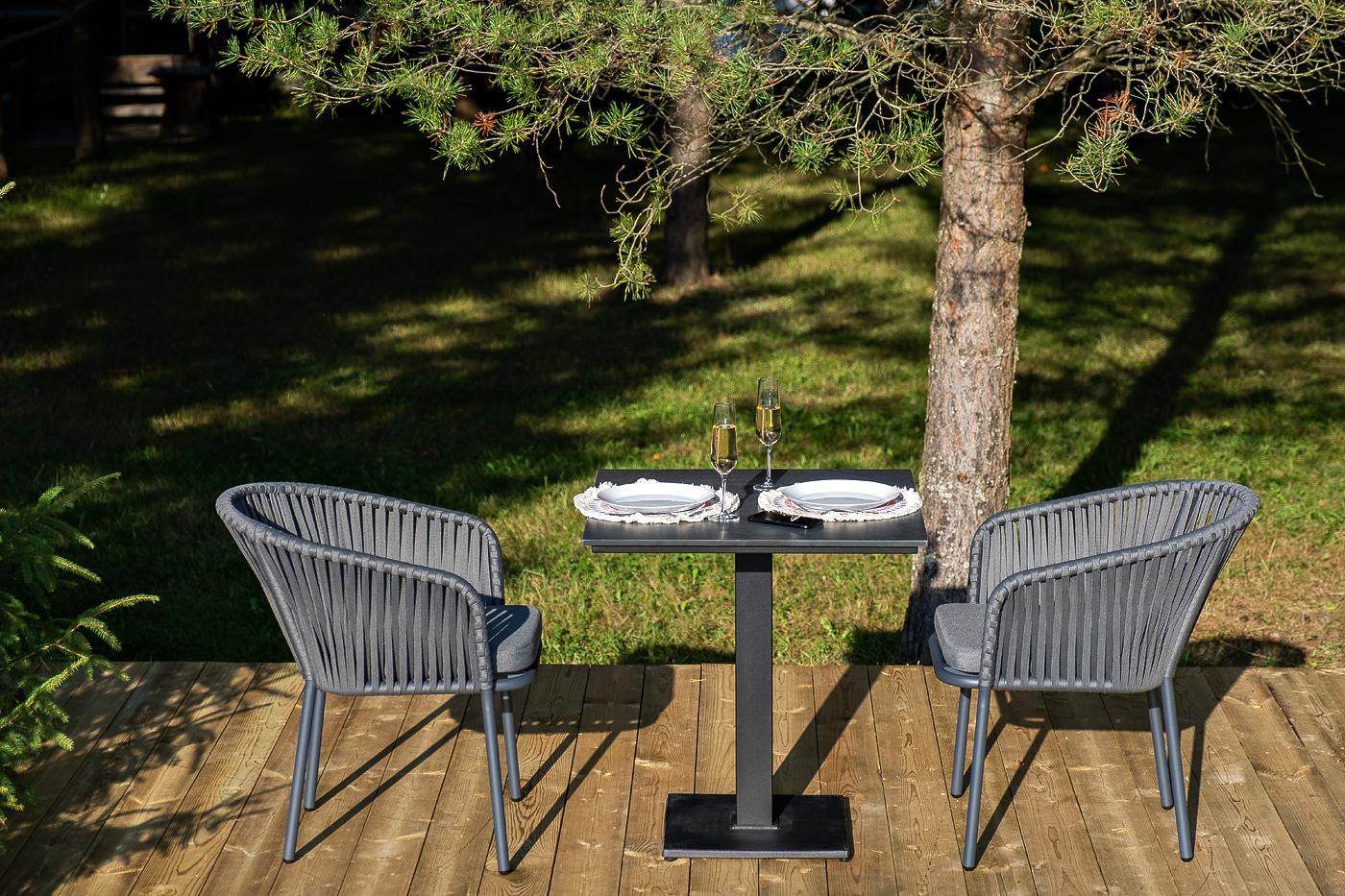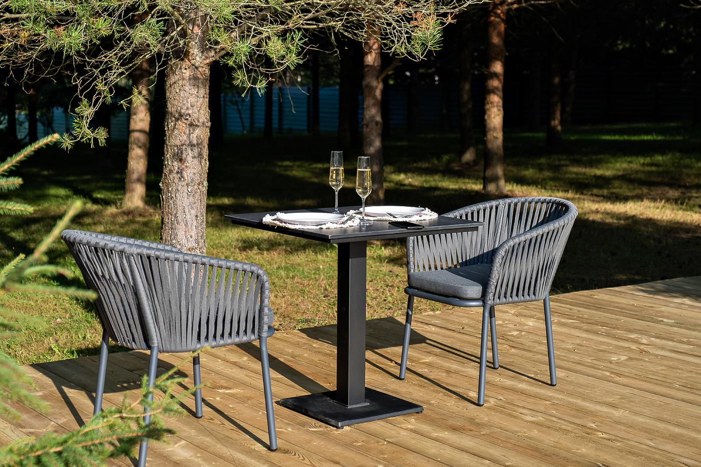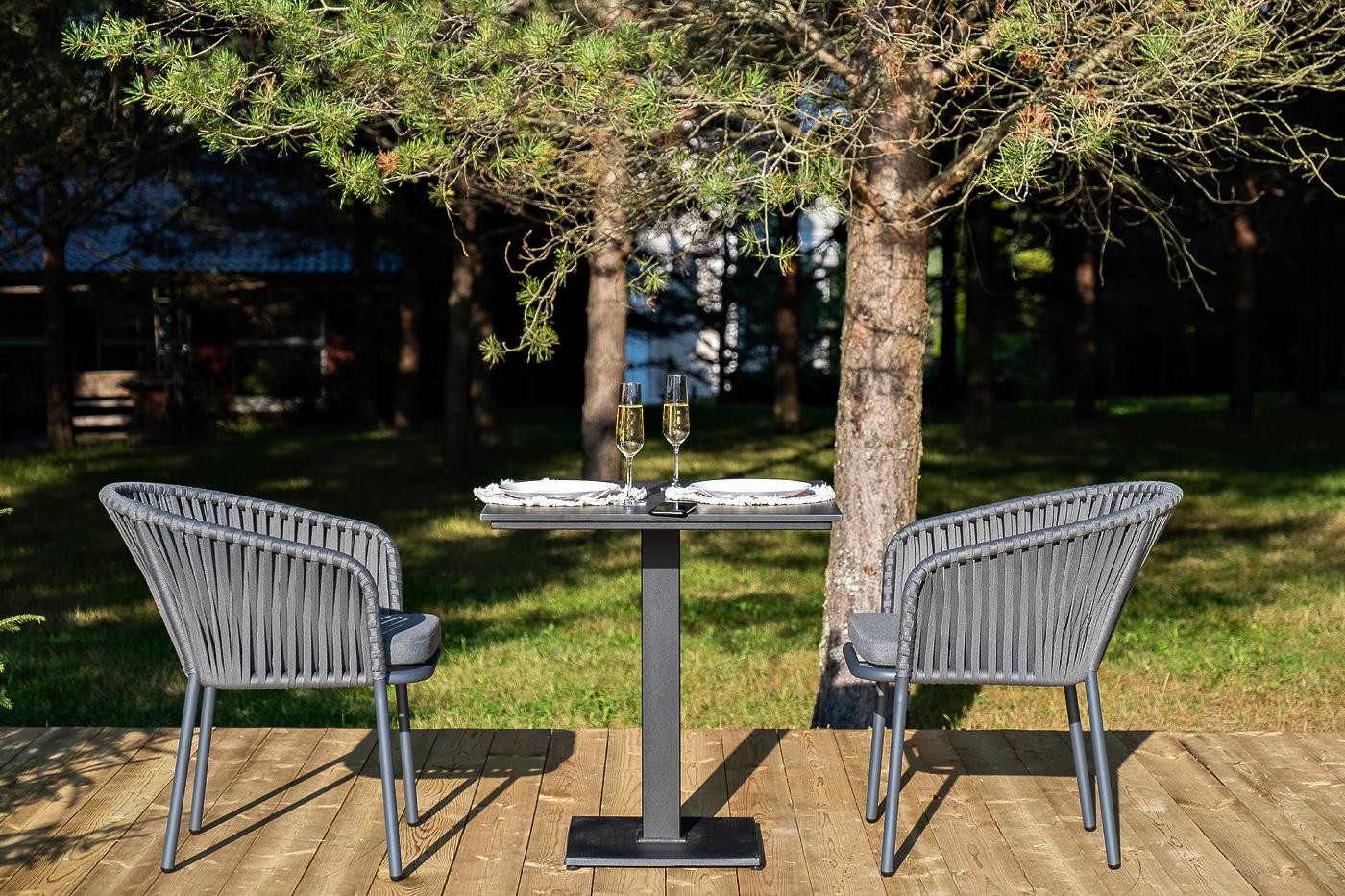 Обеденная группа «Каффе» рассчитана на 2 персоны. В состав комплекта входят: - стол со столешницей из HPL-пластика - 700×700×750 мм. - двух стульев «Бордо» - 570×620×775 мм. Интерьерный стол изготовлен из металлического подстолья, окрашенного в черный цвет, и столешницы из компактного пластика HPL в цвете «серый гранит». Благодаря массивному основанию столик устойчив на любых поверхностях. Стулья оснащены алюминиевым каркасом, которые вручную оплетены плоским роупом серого цвета. Габариты упа "Бордо" стул плетеный из роупа, каркас алюминий темно-серый (RAL7024) муар, роуп серый 15мм, ткань темно-серая 027 2шт. 570Х620Х775, "Каффе" стол из HPL квадратный 70х70см, цвет "серый гранит" 1шт. 700Х700Х750,