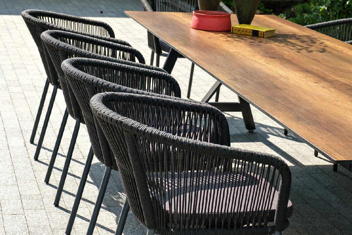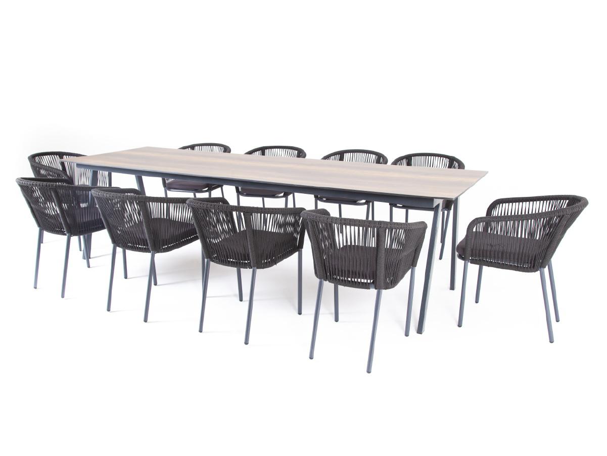 Обеденная группа «Куба» рассчитана на 10 персон. В состав комплекта входит: - Стол обеденный 300х100 см, цвет «дуб». - 10 плетеных стульев «Марсель» из круглых эластичных лент, размером - 570х620х775 мм, цвет темно-серый. "Рио" стол из HPL 300х100см, цвет столешницы "дуб" 1шт. 3 000Х1 000Х750, "Марсель" стул плетеный из роупа, каркас алюминий темно-серый (RAL7024) муар, роуп темно-серый круглый, ткань темно-серая 027 10шт. 570Х620Х775,