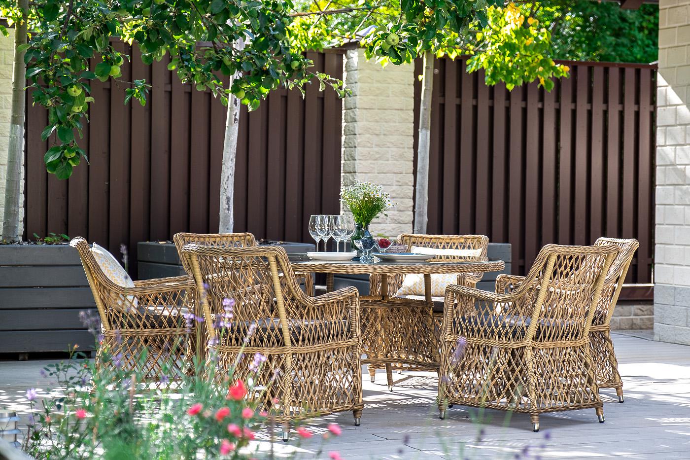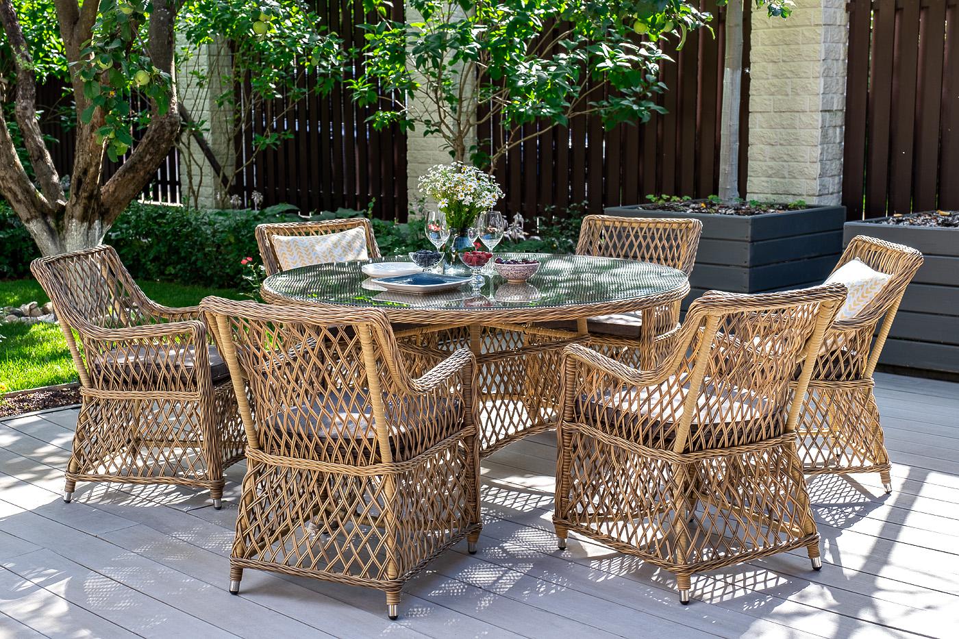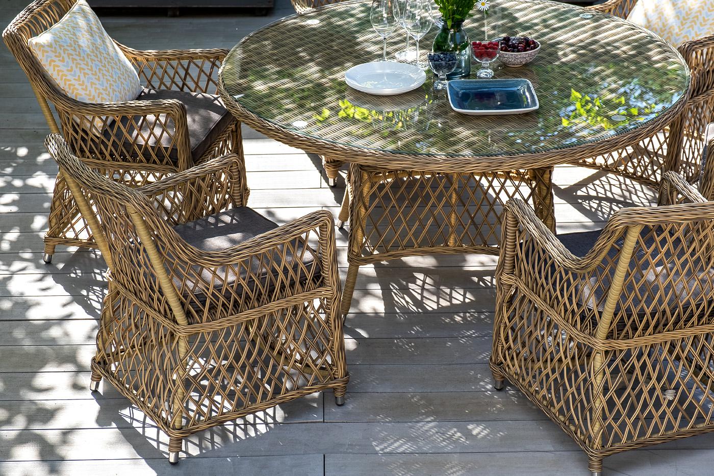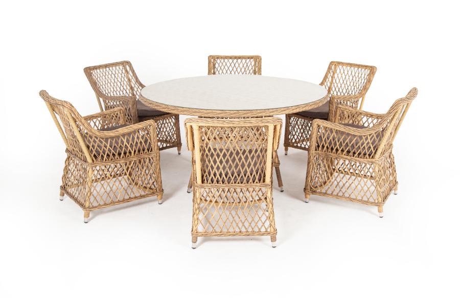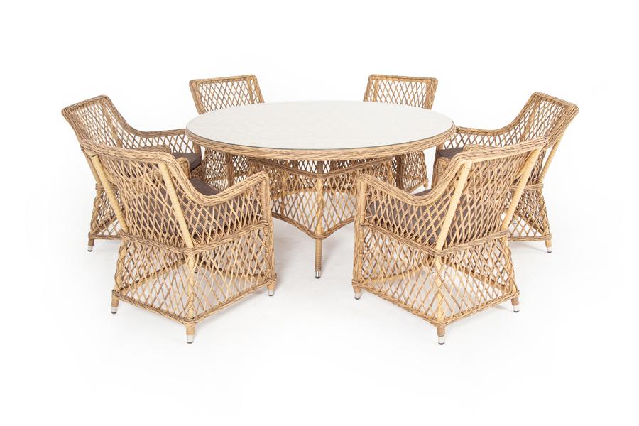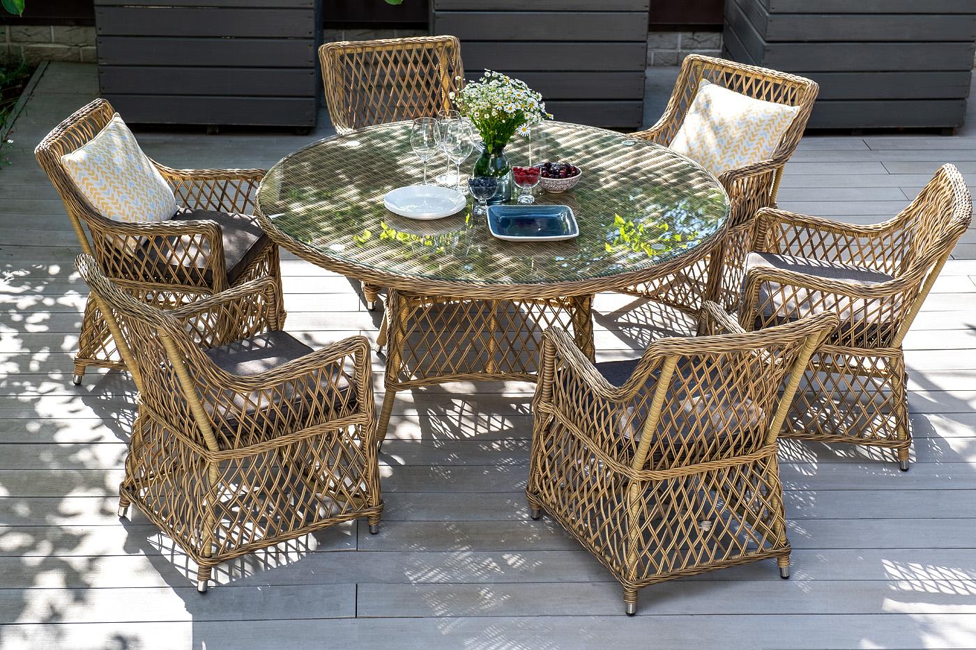 В комплекте круглый обеденный стол «Эспрессо» (1500×1500×750 мм) с ударопрочной стеклянной столешницей и 6 кресел коллекции «Латте» 550×660×850 мм. Вся мебель изготовлена из долговечного и легкого алюминия, обтянутого синтетическим ротангом. На столе для удобства эксплуатации предусмотрена столешница из ударопрочного закаленного стекла 5 мм. Стулья укомплектованы подушками на сидениях. Параметры кресел без подушек: Глубина сидения – 480 мм; Высота сидения – 400 мм; Высота спинки – 460 мм. "Эспрессо" плетеный круглый стол, диаметр 150 см, цвет соломенный 1шт. 1 500Х1 500Х750, "Латте" плетеное кресло из искусственного ротанга, цвет соломенный 6шт. 550Х660Х850,
