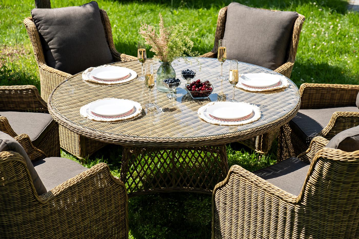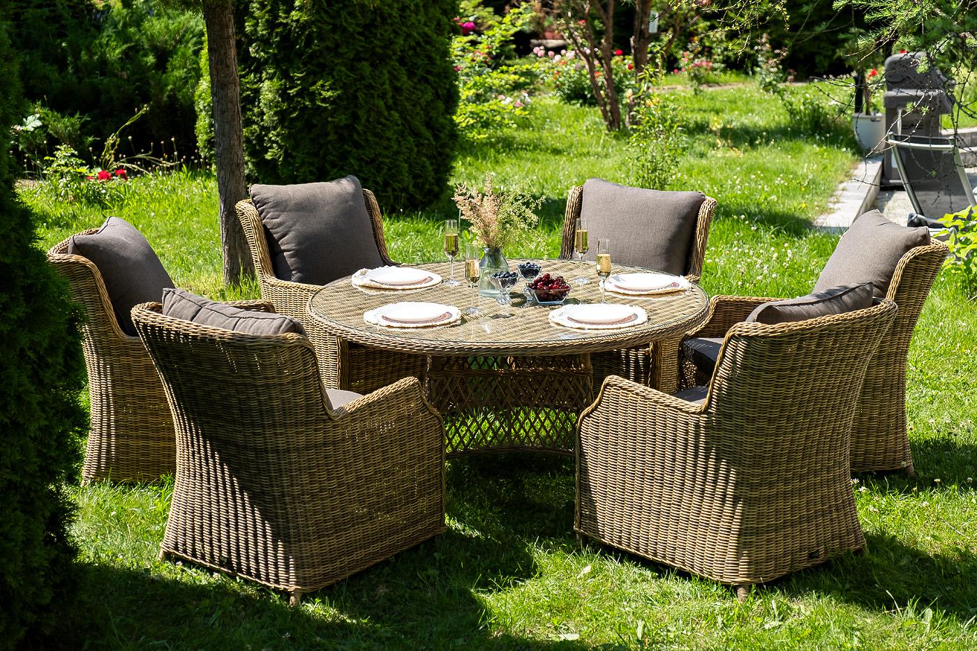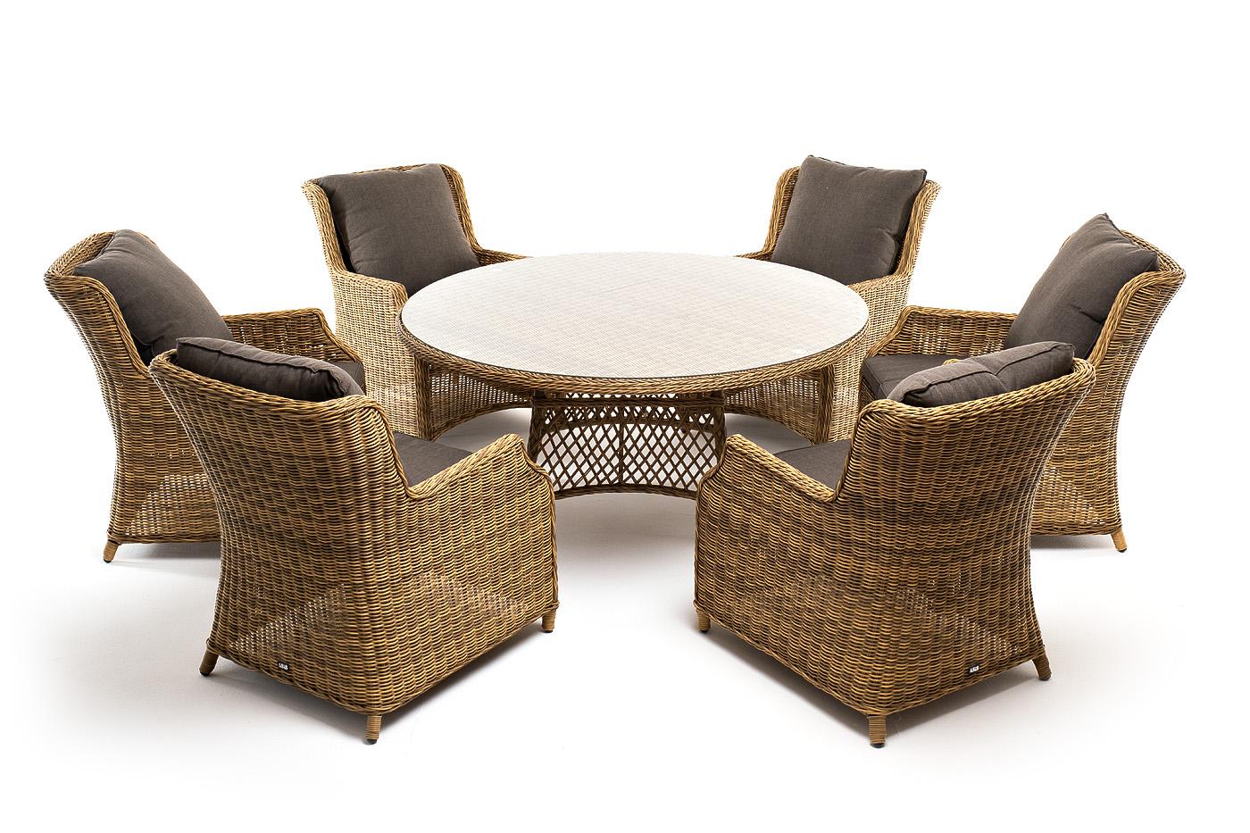 Обеденная группа на 6 персон «Эспрессо» из ротанга. В комплекте: большой круглый обеденный стол (1500×1500×750 мм.) и 6 кресел коллекции «Неаполь» (650×900×920 мм). Вся мебель изготовлена из долговечного и легкого алюминия, обтянутого синтетическим ротангом. На столе для удобства эксплуатации предусмотрена столешница из ударопрочного закаленного стекла 5 мм. Стулья укомплектованы подушками на сидениях и на спинках. Параметры кресел без подушек: Глубина сидения – 620 мм; Высота сидения – 4 "Неаполь" плетеный стул из искусственного ротанга, цвет соломенный 6шт. 650Х900Х920, "Эспрессо" плетеный круглый стол, диаметр 150 см, цвет соломенный 1шт. 1 500Х1 500Х750,