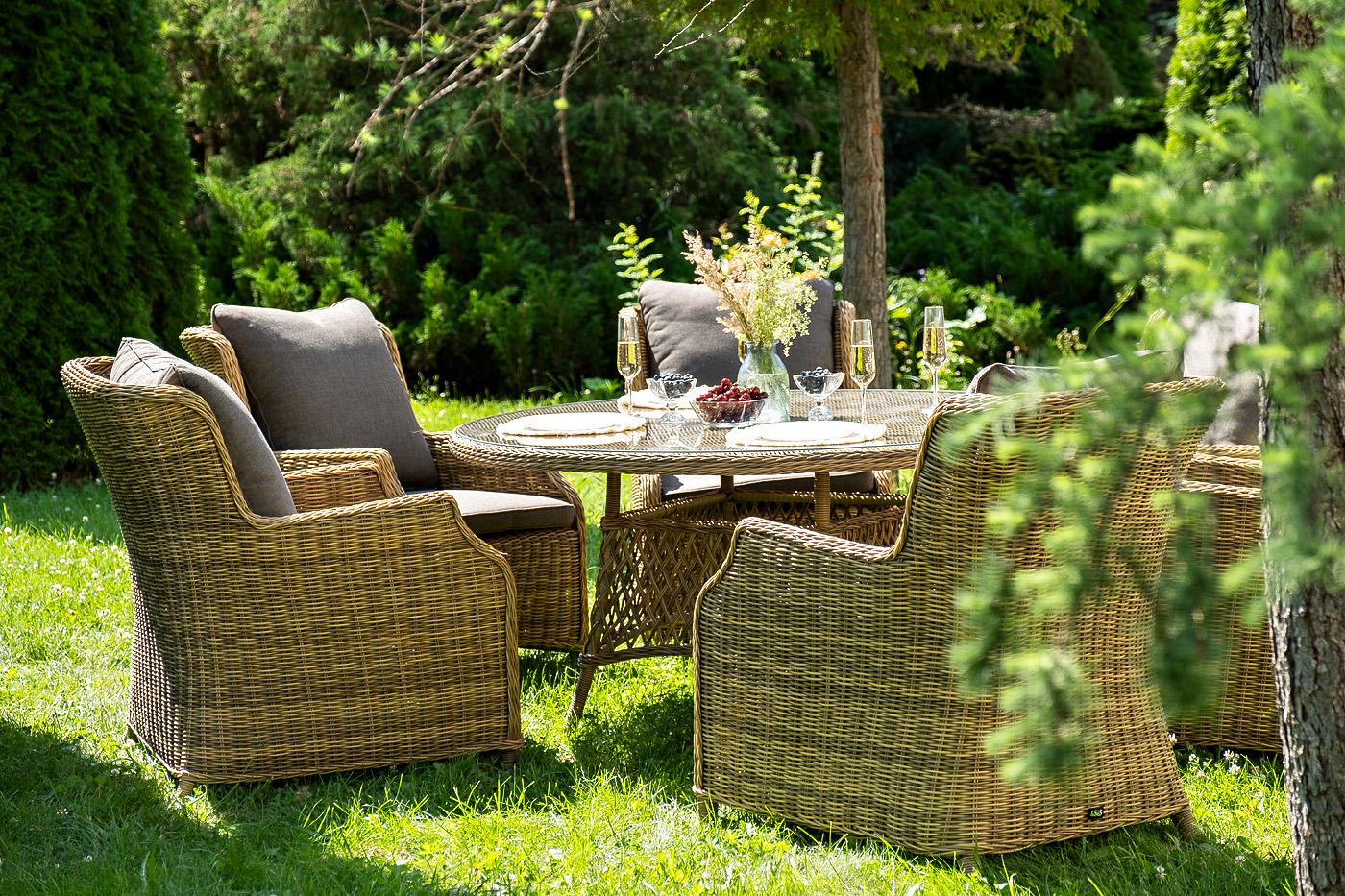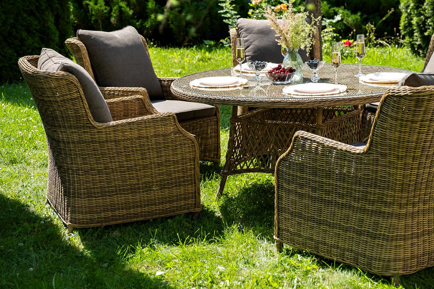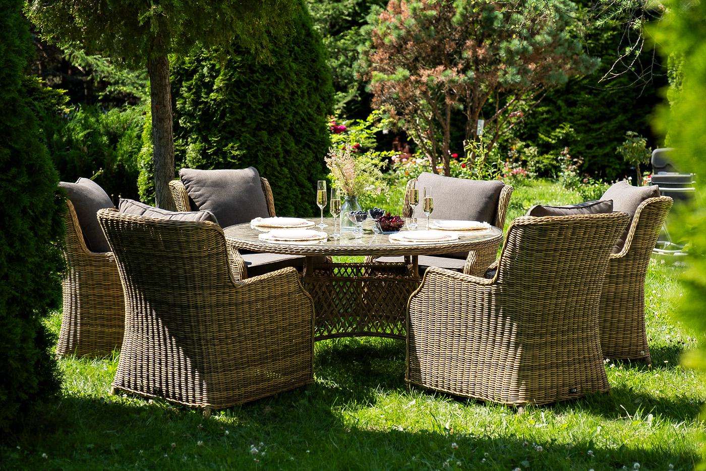 Обеденная группа на 6 персон «Эспрессо» из ротанга. В комплекте: большой круглый обеденный стол (1500×1500×750 мм.) и 6 кресел коллекции «Неаполь» (650×900×920 мм). Вся мебель изготовлена из долговечного и легкого алюминия, обтянутого синтетическим ротангом. На столе для удобства эксплуатации предусмотрена столешница из ударопрочного закаленного стекла 5 мм. Стулья укомплектованы подушками на сидениях и на спинках. Параметры кресел без подушек: Глубина сидения – 620 мм; Высота сидения – 4 "Неаполь" плетеный стул из искусственного ротанга, цвет соломенный 6шт. 650Х900Х920, "Эспрессо" плетеный круглый стол, диаметр 150 см, цвет соломенный 1шт. 1 500Х1 500Х750,
