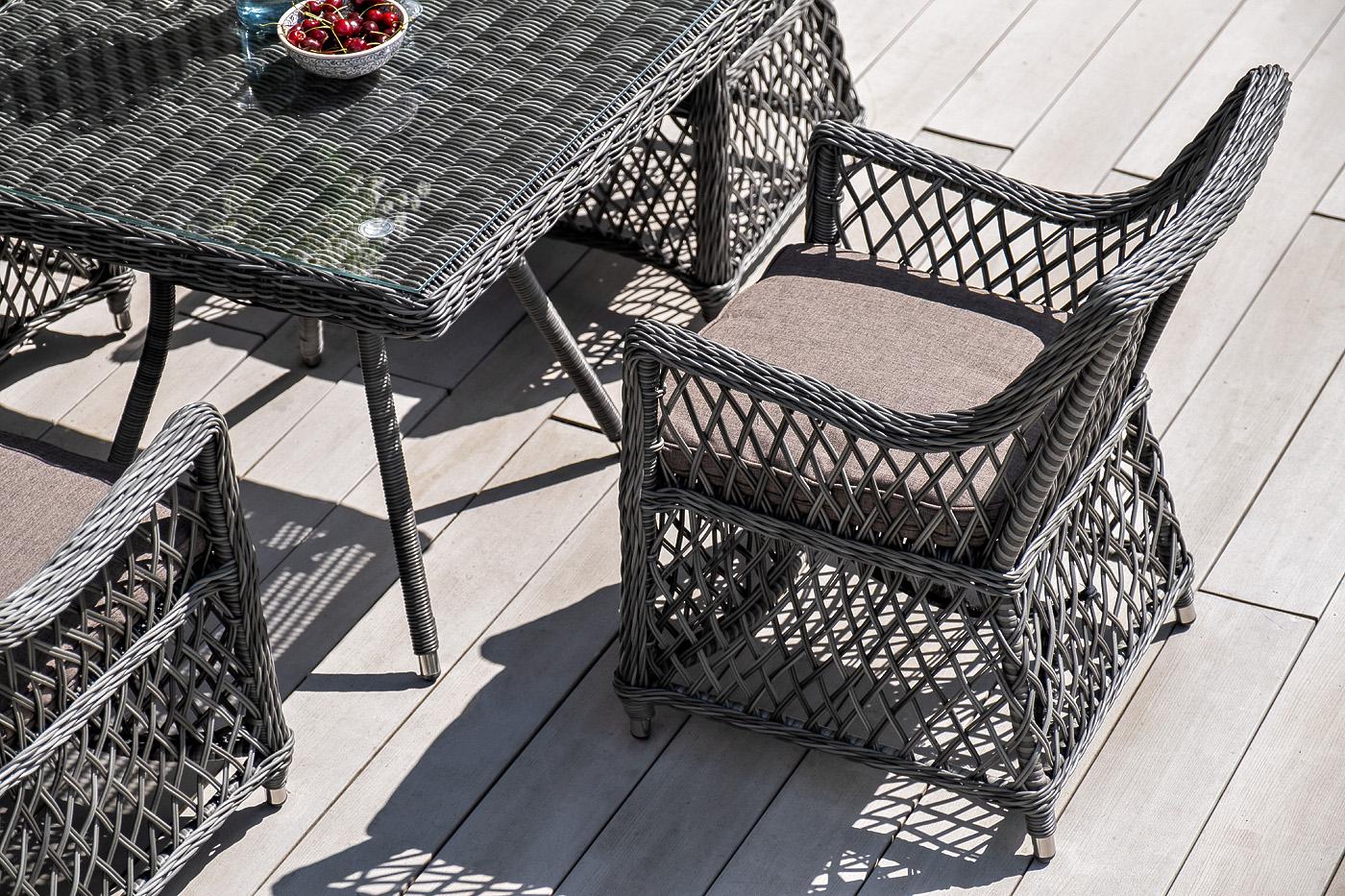 Комплет для обеденной зоны «Айриш» состоит из: - квадратного обеденного стола, размером - 900×900×750 мм. - 4 плетеных кресел - 550×660×850 мм. Каркас мебели выполнен из прочного и легкого алюминия, оплетенного вручную долговечным искусственным ротангом графитового цвета, столешница – закаленное стекло. На креслах предусмотрены подушки со съёмными влагоотталкивающими чехлами. Обеденная группа «Айриш» представлена также в соломенном, коричневом и бежевом цветах. Все изделия можно купить по отде "Айриш" стол плетеный из искусственного ротанга, цвет графит 1шт. 900Х900Х750, "Латте" плетеное кресло из искусственного ротанга, цвет графит 4шт. 550Х660Х850,