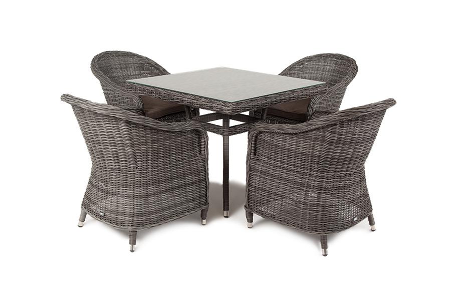 Уличная обеденная группа «Фредо» для обустройства зоны отдыха. Комплект состоит из: квадратного обеденного стола «Айриш» - 900×900×750 мм и 4 кресел «Равенна» - 570×680×810 мм в графитовом цвете. Вся мебель изготовлена из алюминия, поэтому ее очень легко перемещать. Декоративное покрытие выполнено из долговечного искусственного ротанга, устойчивого к перепадам температур и переменам погоды. Столешница изготовлена из прочного закаленного стекла 5 мм, кресла укомплектованы подушками серого цвета "Айриш" стол плетеный из искусственного ротанга, цвет графит 1шт. 900Х900Х750, "Равенна" плетеное кресло из искусственного ротанга, цвет графит 4шт. 570Х680Х810,