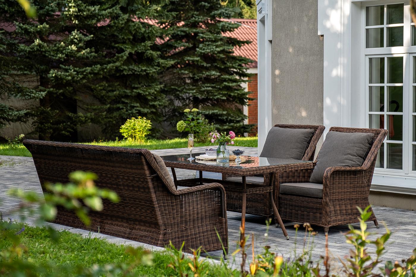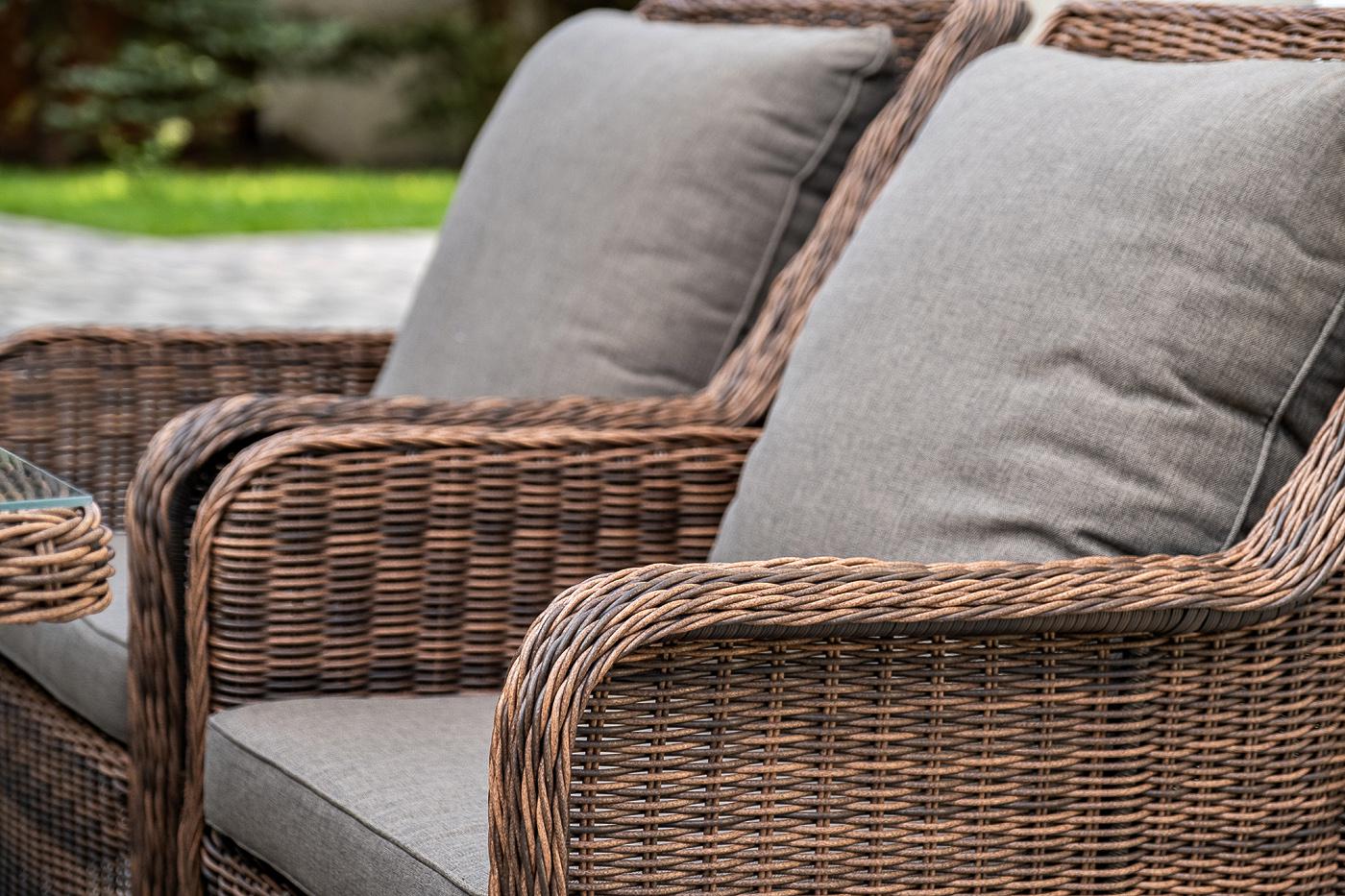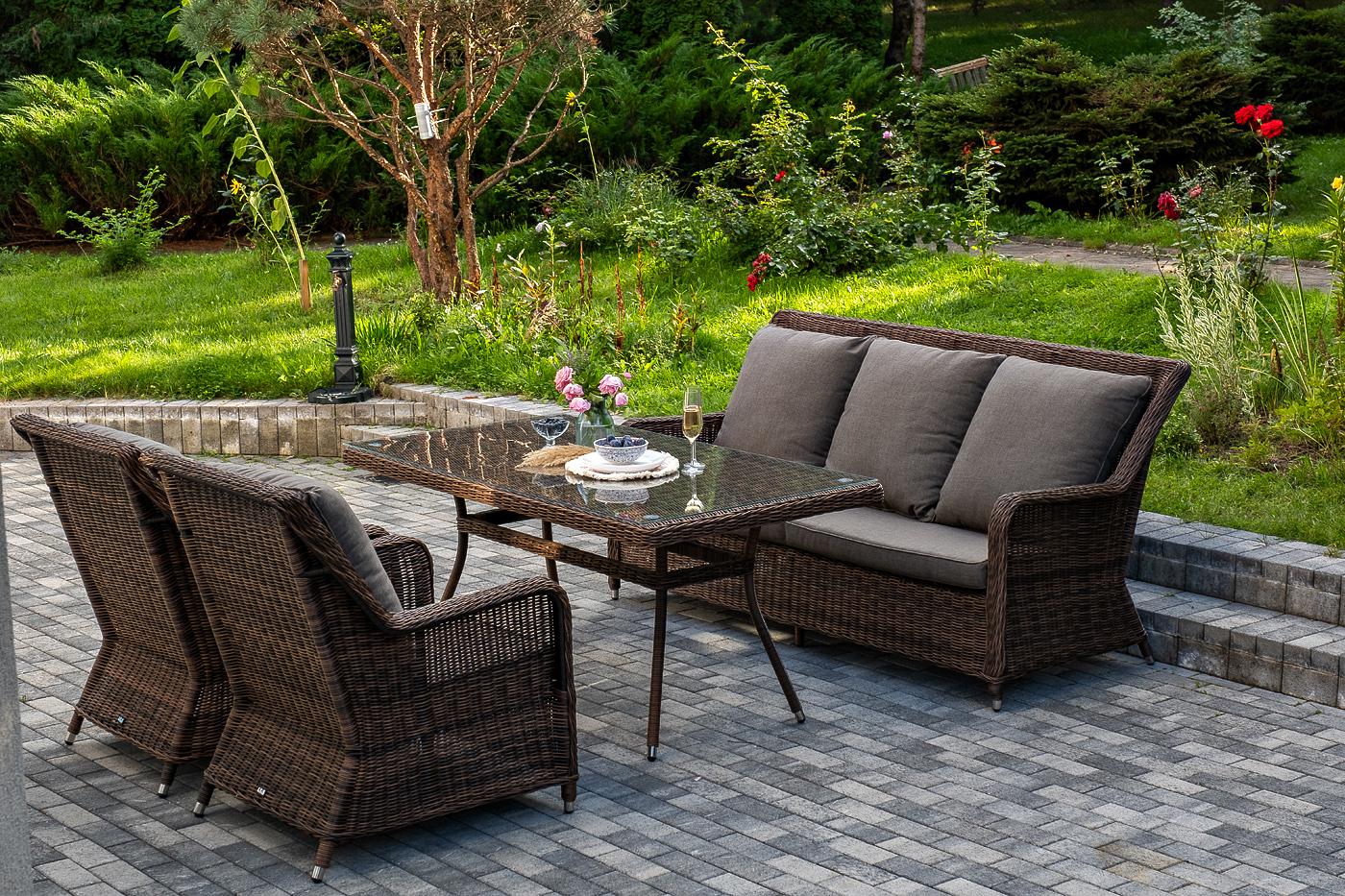 Обеденная группа «Гляссе» подойдет для компании из 5 человек. В ее составе: - трехместный диван «Гляссе» – 1900×880×990 мм. - два кресла «Гляссе» – 730×880×990 мм. - стол «Латте» – 1600×900×750 мм. Каркас мебели алюминиевый. Он оформлен с помощью искусственного ротанга круглой формы и был оплетен ручным способом. Цвет плетение - коричневый. На креслах и диване располагаются мягкие подушки серого цвета. Съёмные чехлы подушек пошиты из полиэстера. Материал имеет плотность 300гр/м2. Вл "Гляссе" диван трехместный из искусственного ротанга, цвет коричневый 1шт. 1 900Х880Х990, "Гляссе" кресло плетеное из искусственого ротанга, цвет коричневый 2шт. 730Х880Х990, "Латте" плетеный стол из искусственного ротанга 160х90см, цвет коричневый 1шт. 1 600Х900Х750,