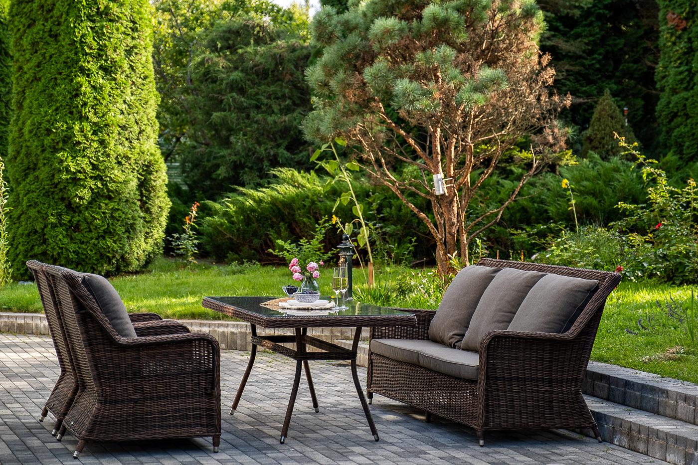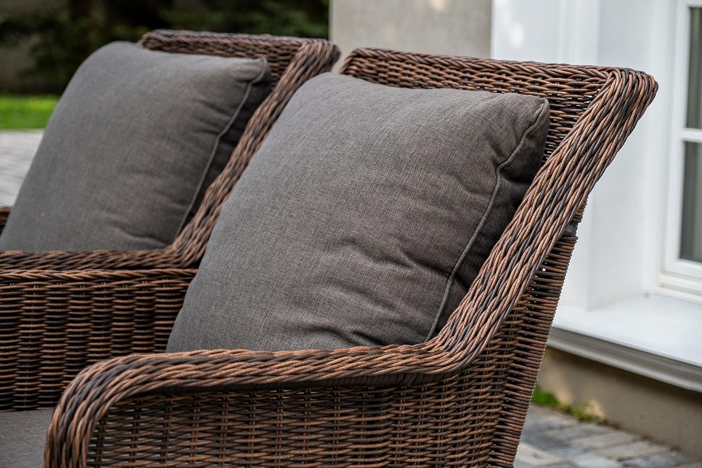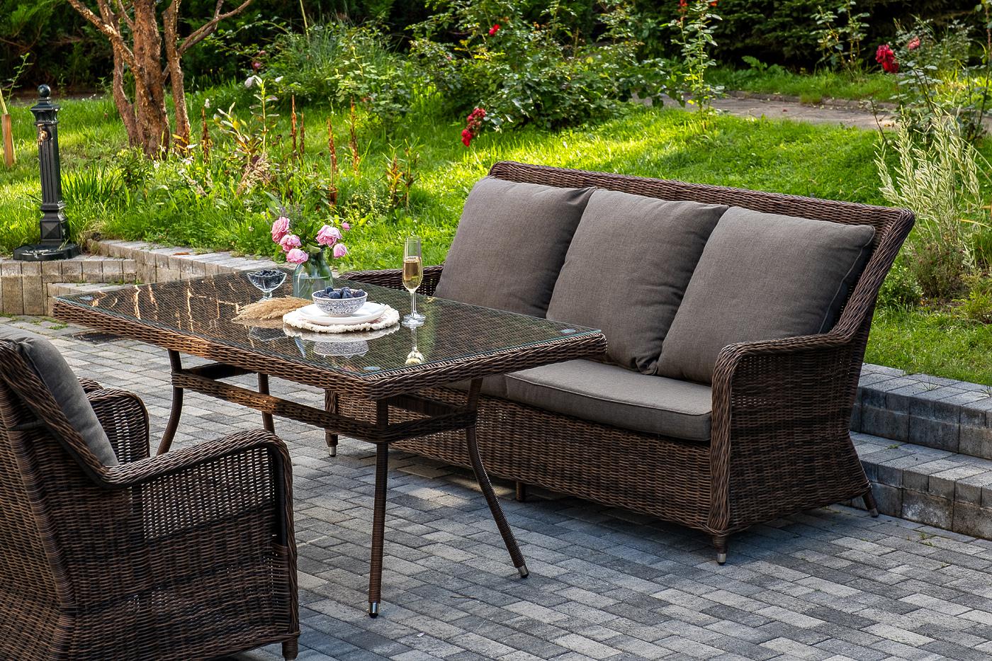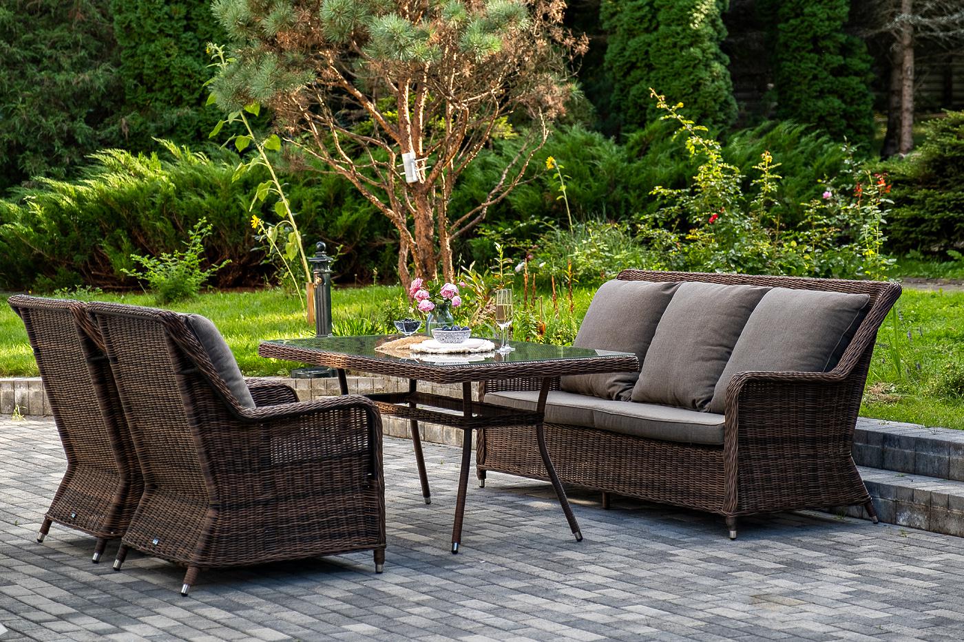 Обеденная группа «Гляссе» подойдет для компании из 5 человек. В ее составе: - трехместный диван «Гляссе» – 1900×880×990 мм. - два кресла «Гляссе» – 730×880×990 мм. - стол «Латте» – 1600×900×750 мм. Каркас мебели алюминиевый. Он оформлен с помощью искусственного ротанга круглой формы и был оплетен ручным способом. Цвет плетение - коричневый. На креслах и диване располагаются мягкие подушки серого цвета. Съёмные чехлы подушек пошиты из полиэстера. Материал имеет плотность 300гр/м2. Вл "Гляссе" диван трехместный из искусственного ротанга, цвет коричневый 1шт. 1 900Х880Х990, "Гляссе" кресло плетеное из искусственого ротанга, цвет коричневый 2шт. 730Х880Х990, "Латте" плетеный стол из искусственного ротанга 160х90см, цвет коричневый 1шт. 1 600Х900Х750,
