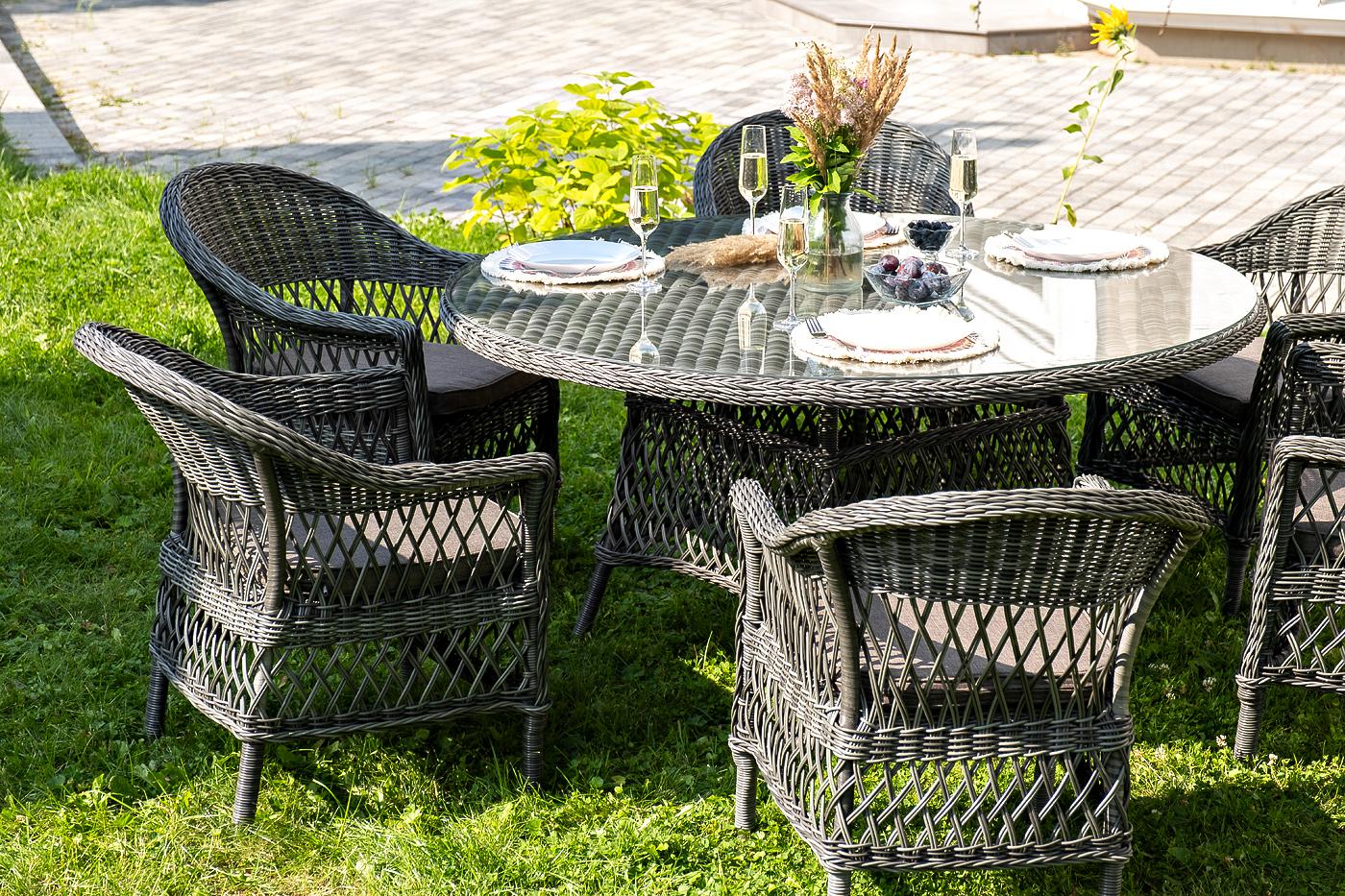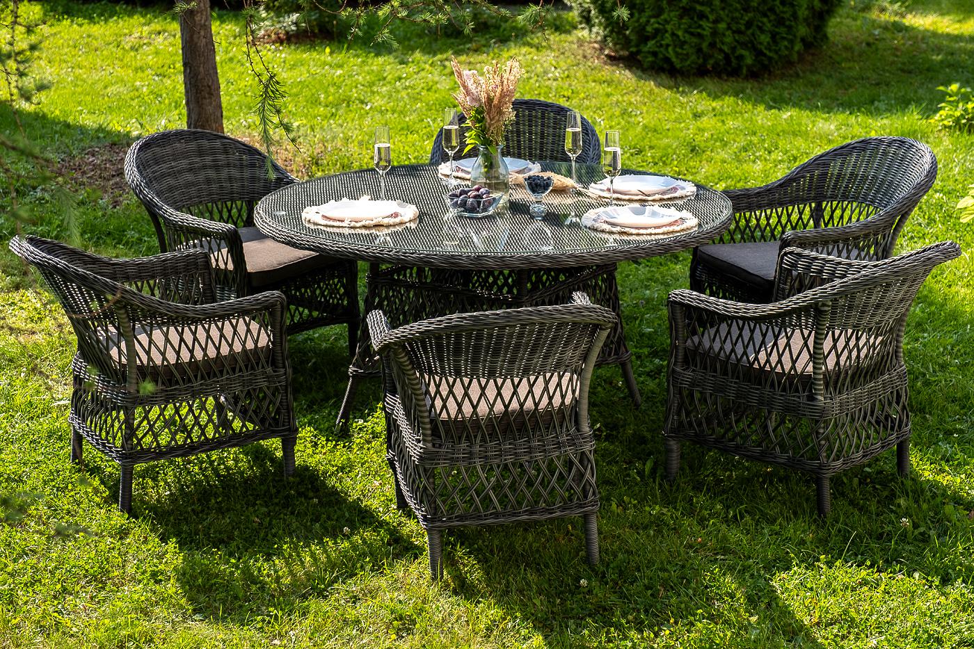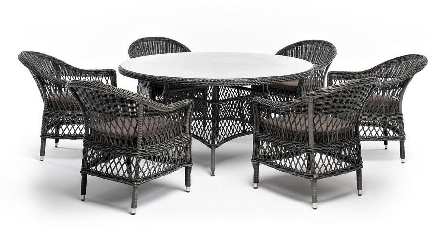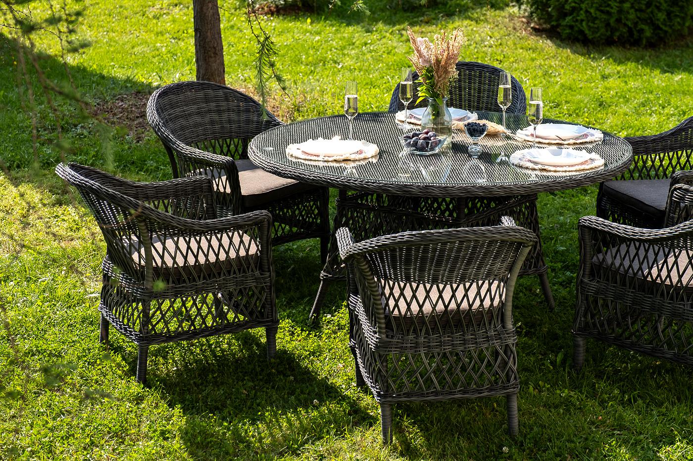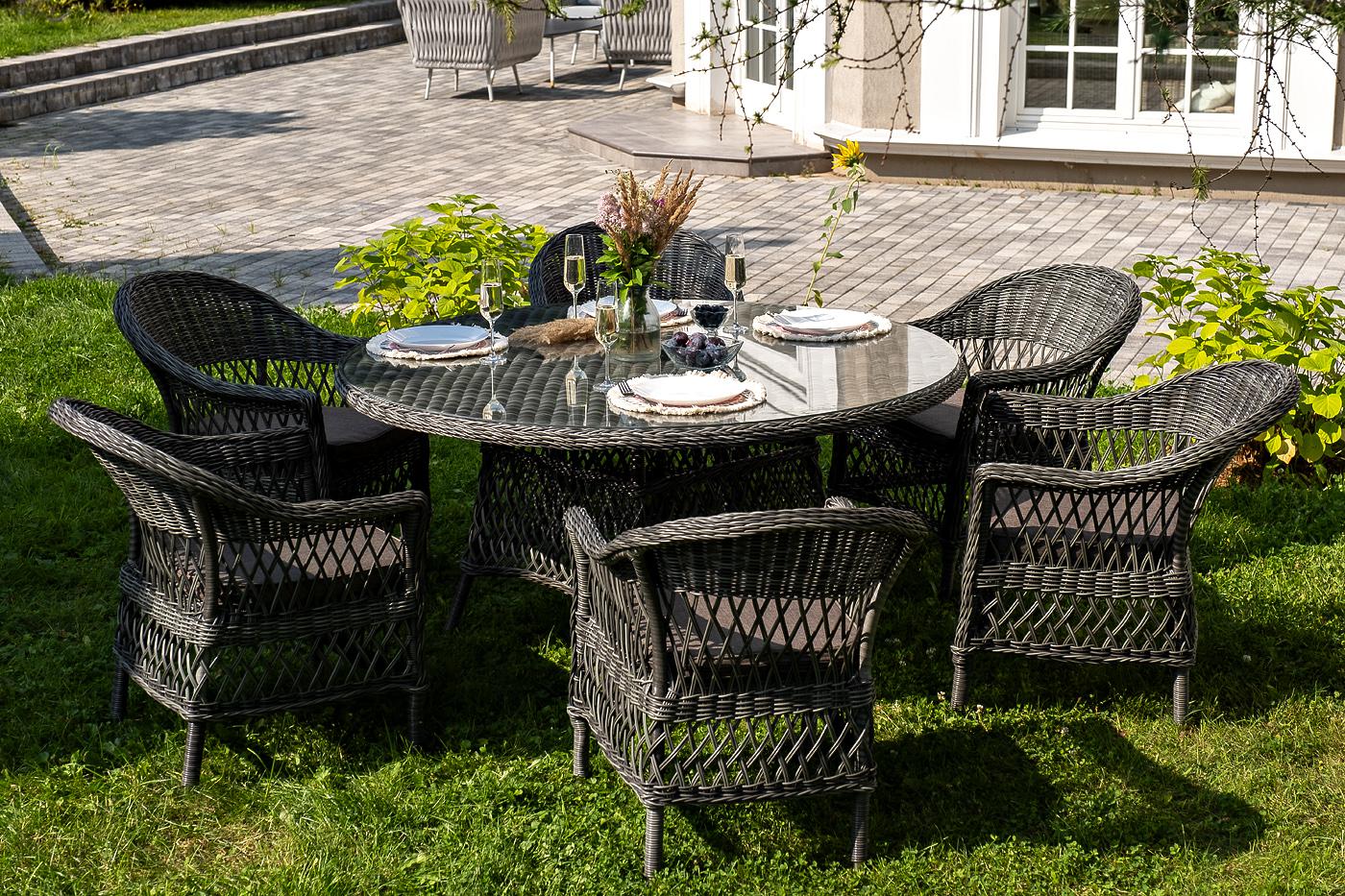 В комплект входит: - круглый обеденный стол «Эспрессо» (1500×1500×750 мм) с ударопрочной стеклянной столешницей. - 6 кресел коллекции «Сицилия» (590×640×820 мм). Цвет - графит. Вся мебель изготовлена из долговечного и легкого алюминия, обтянутого синтетическим ротангом. На столе для удобства эксплуатации предусмотрена столешница из ударопрочного закаленного стекла 5 мм. Стулья укомплектованы подушками на сидениях. Параметры кресел без подушек: Глубина сидения – 480 мм; Высота сидения – 420 м "Сицилия" плетеный стул из искусственного ротанга, цвет графит 6шт. 590Х640Х820, "Эспрессо" плетеный круглый стол, диаметр 150 см, цвет графит 1шт. 1 500Х1 500Х750,