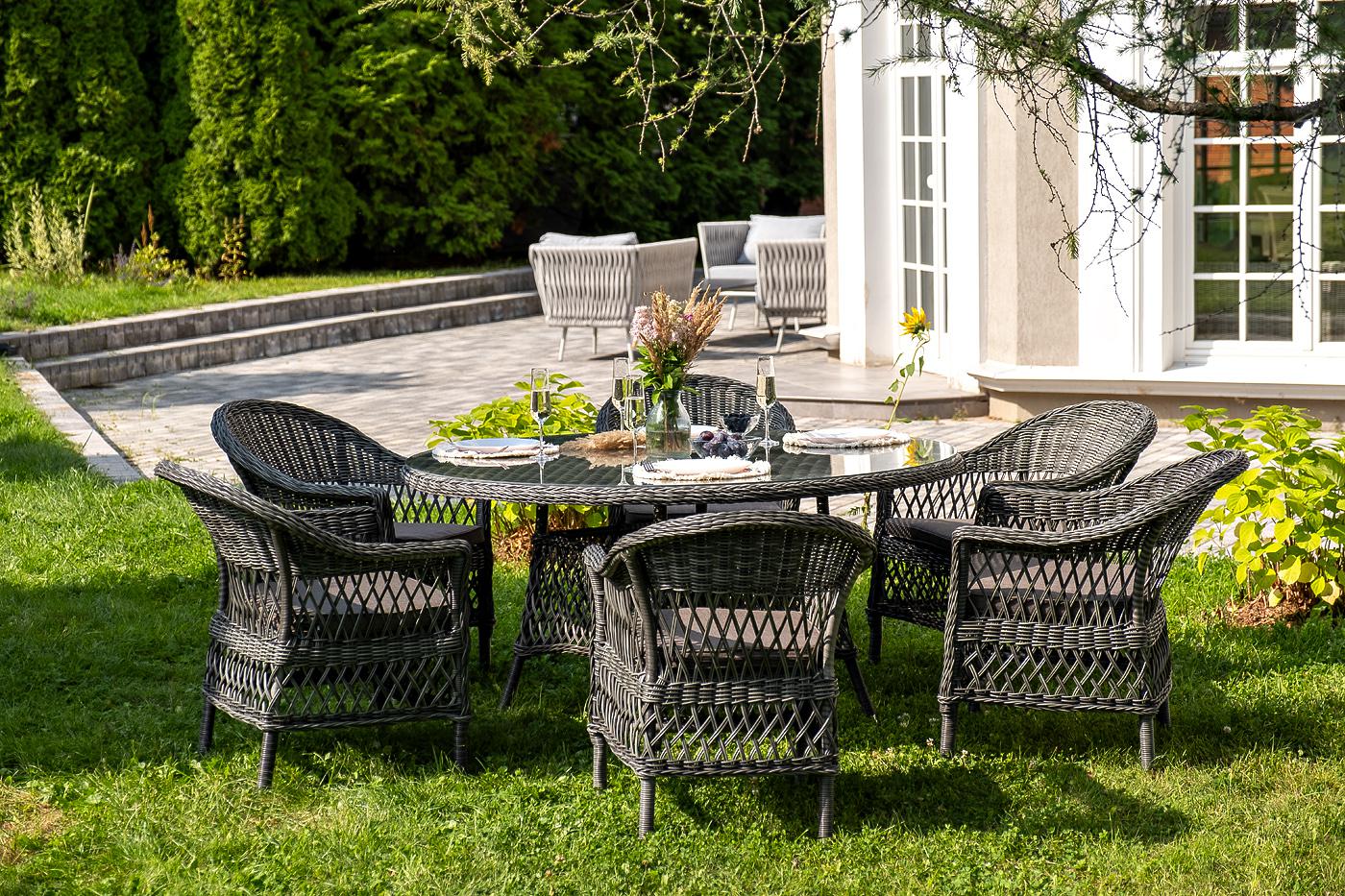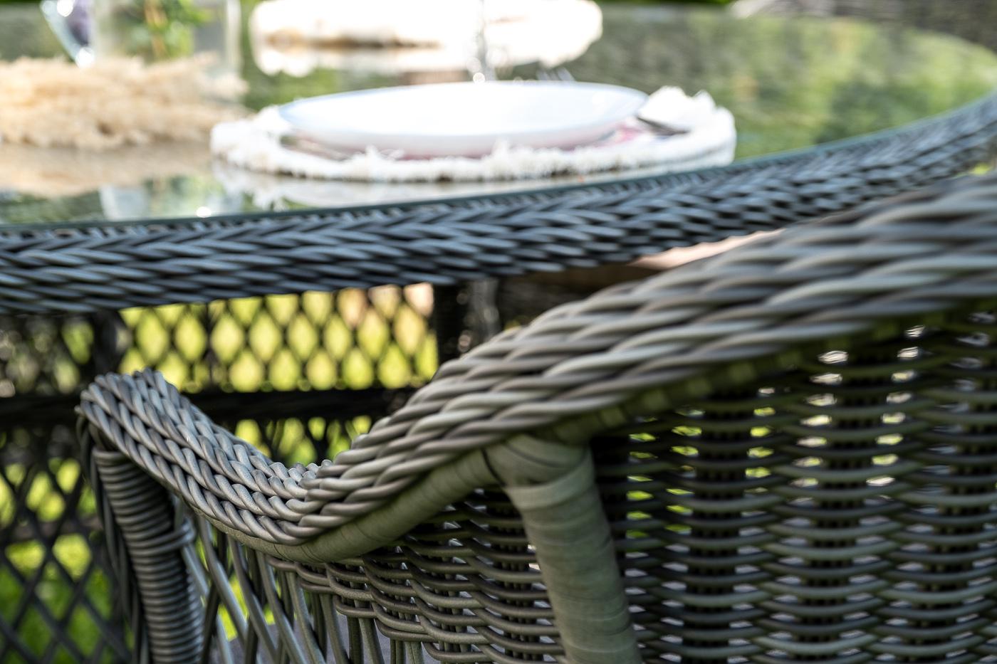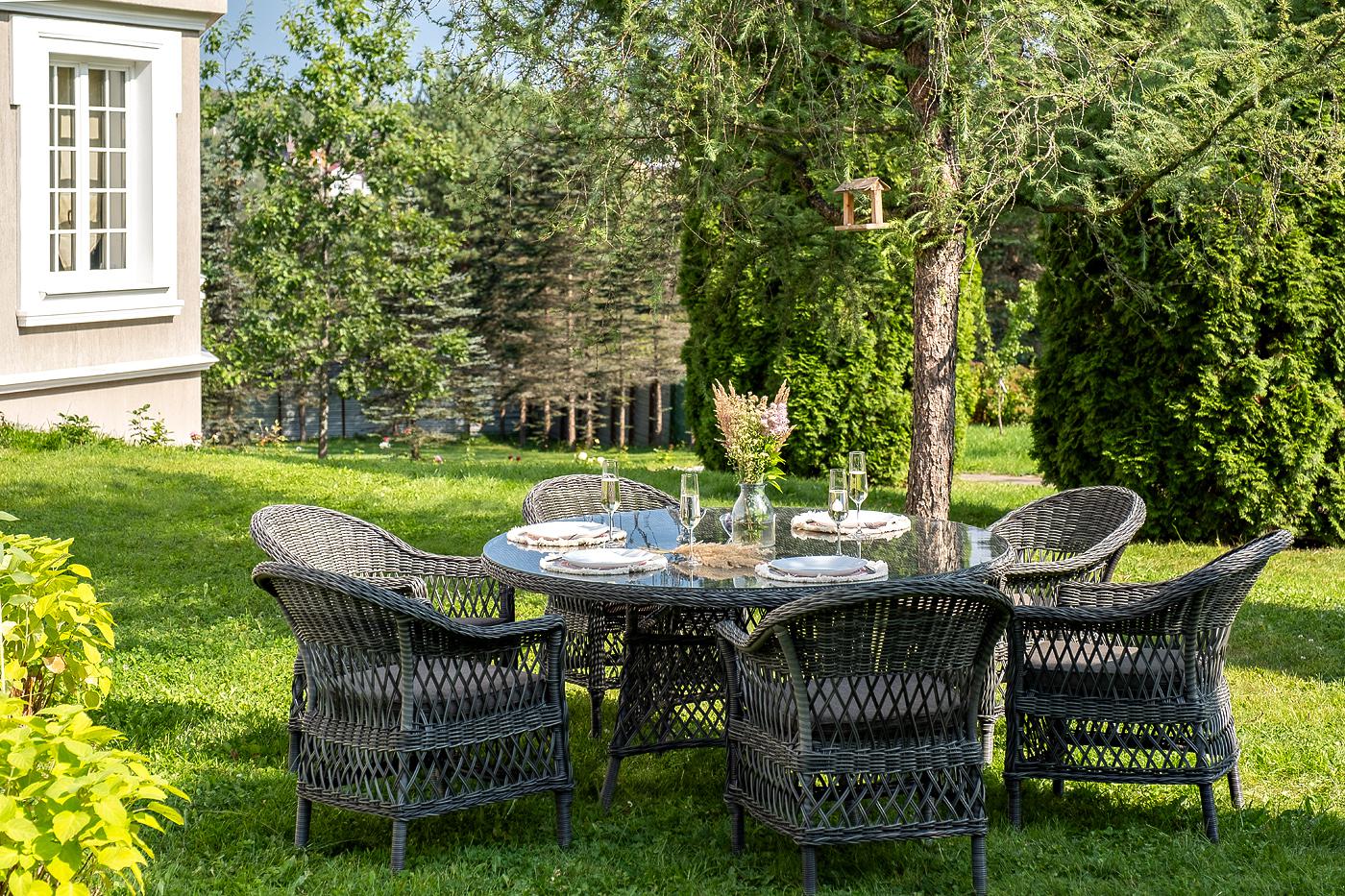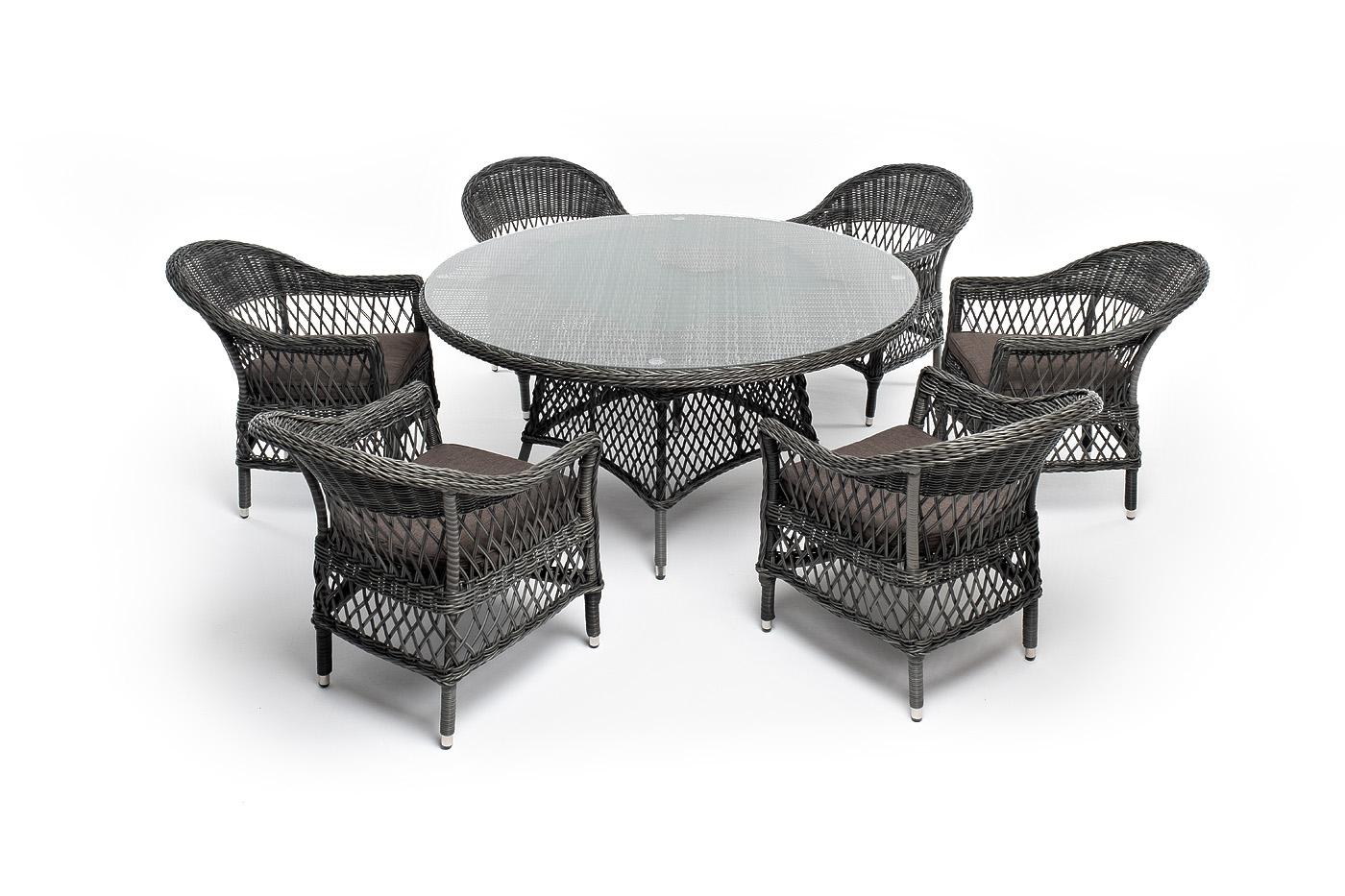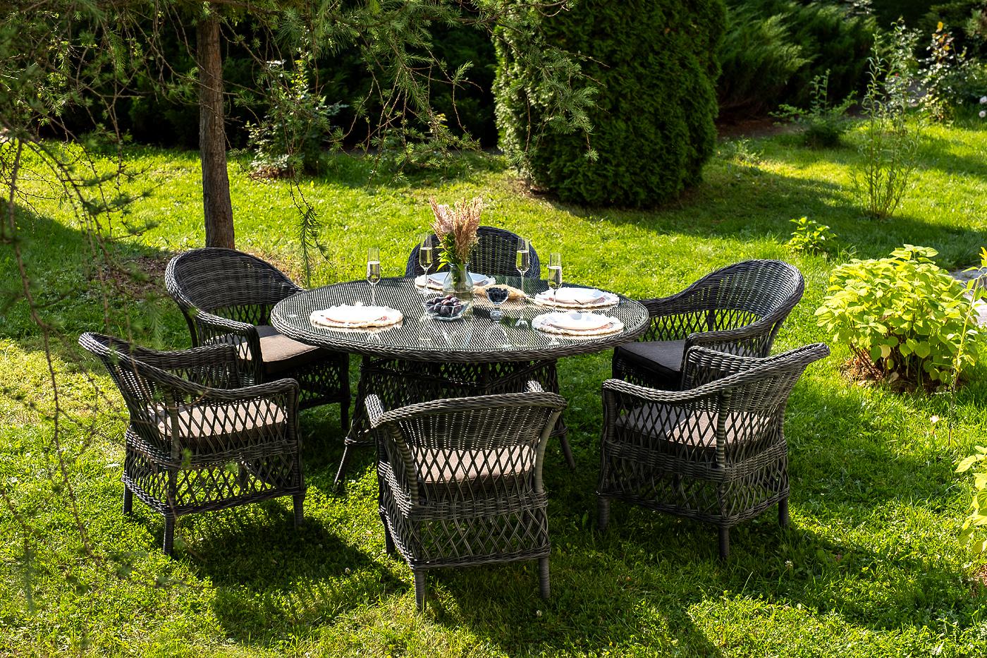 В комплект входит: - круглый обеденный стол «Эспрессо» (1500×1500×750 мм) с ударопрочной стеклянной столешницей. - 6 кресел коллекции «Сицилия» (590×640×820 мм). Цвет - графит. Вся мебель изготовлена из долговечного и легкого алюминия, обтянутого синтетическим ротангом. На столе для удобства эксплуатации предусмотрена столешница из ударопрочного закаленного стекла 5 мм. Стулья укомплектованы подушками на сидениях. Параметры кресел без подушек: Глубина сидения – 480 мм; Высота сидения – 420 м "Сицилия" плетеный стул из искусственного ротанга, цвет графит 6шт. 590Х640Х820, "Эспрессо" плетеный круглый стол, диаметр 150 см, цвет графит 1шт. 1 500Х1 500Х750,