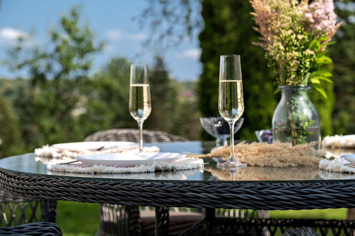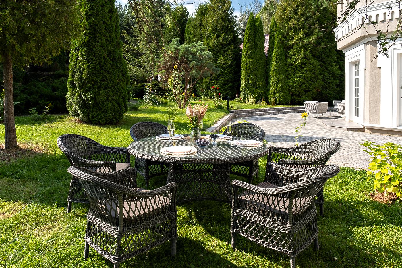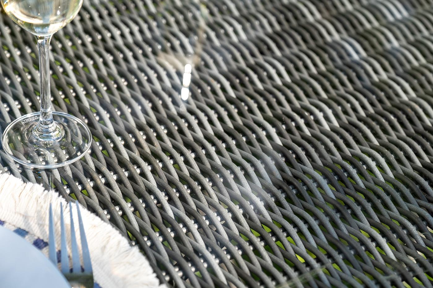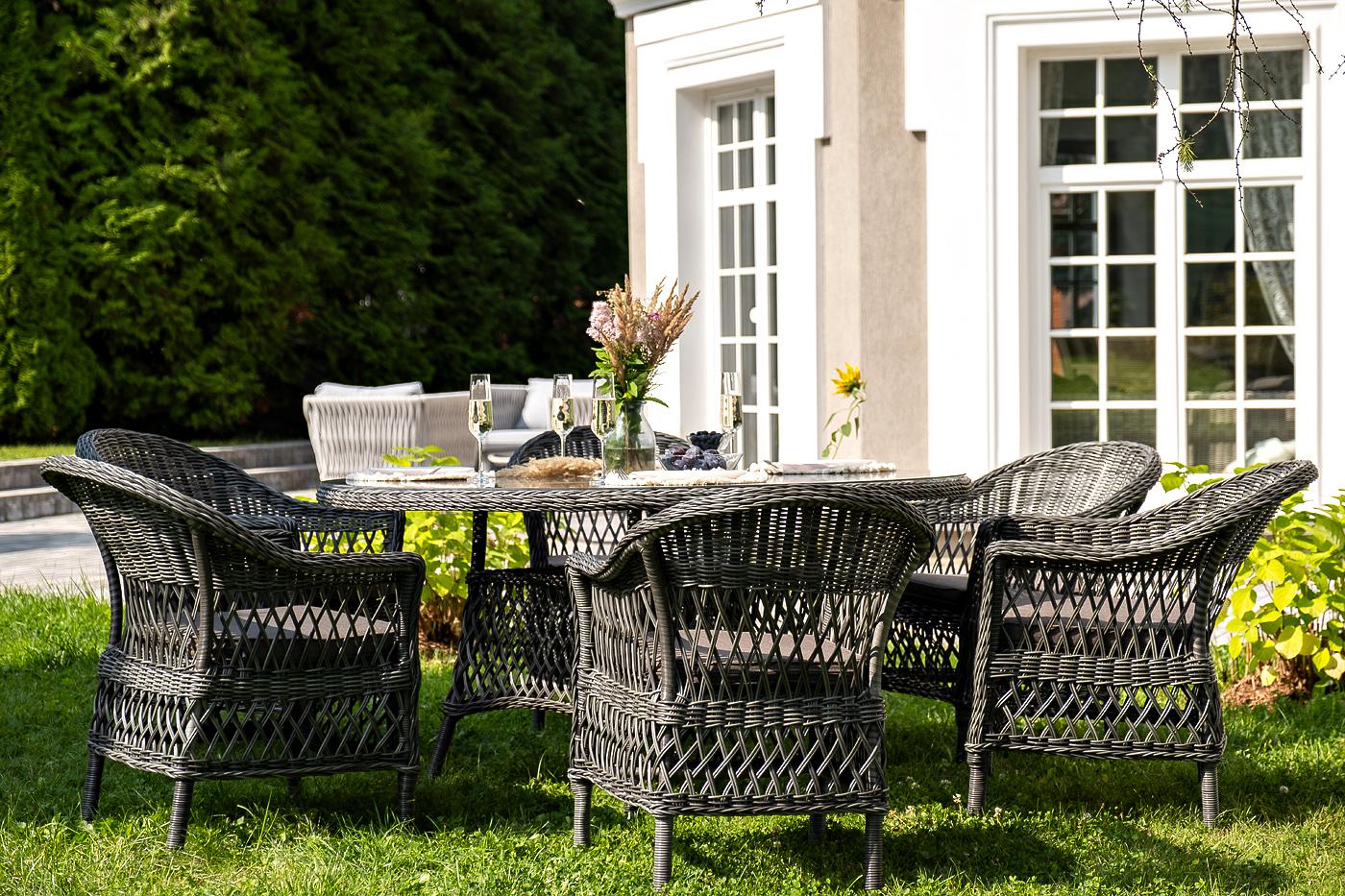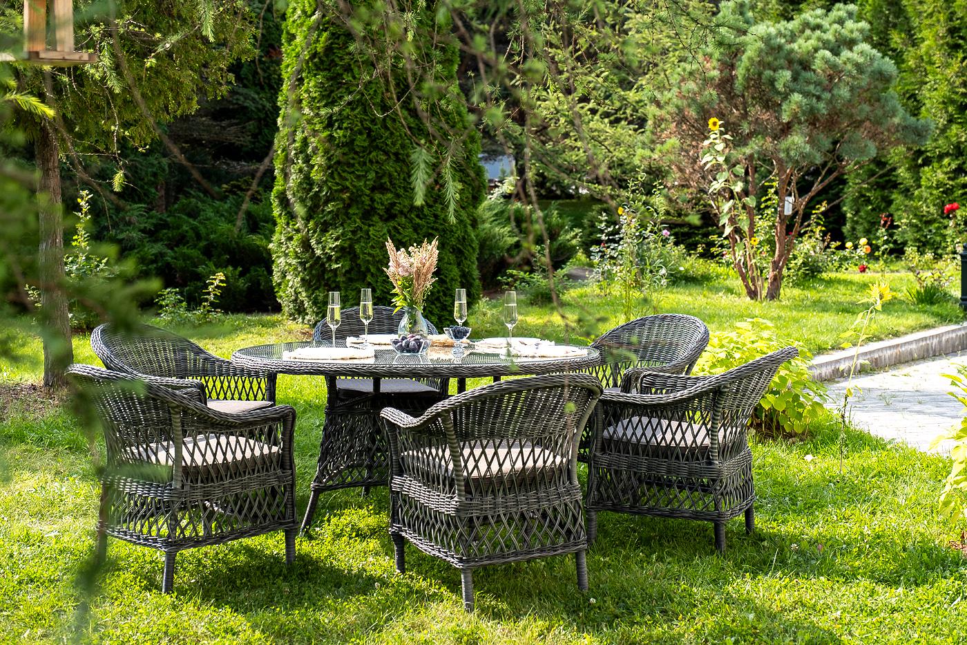 В комплект входит: - круглый обеденный стол «Эспрессо» (1500×1500×750 мм) с ударопрочной стеклянной столешницей. - 6 кресел коллекции «Сицилия» (590×640×820 мм). Цвет - графит. Вся мебель изготовлена из долговечного и легкого алюминия, обтянутого синтетическим ротангом. На столе для удобства эксплуатации предусмотрена столешница из ударопрочного закаленного стекла 5 мм. Стулья укомплектованы подушками на сидениях. Параметры кресел без подушек: Глубина сидения – 480 мм; Высота сидения – 420 м "Сицилия" плетеный стул из искусственного ротанга, цвет графит 6шт. 590Х640Х820, "Эспрессо" плетеный круглый стол, диаметр 150 см, цвет графит 1шт. 1 500Х1 500Х750,