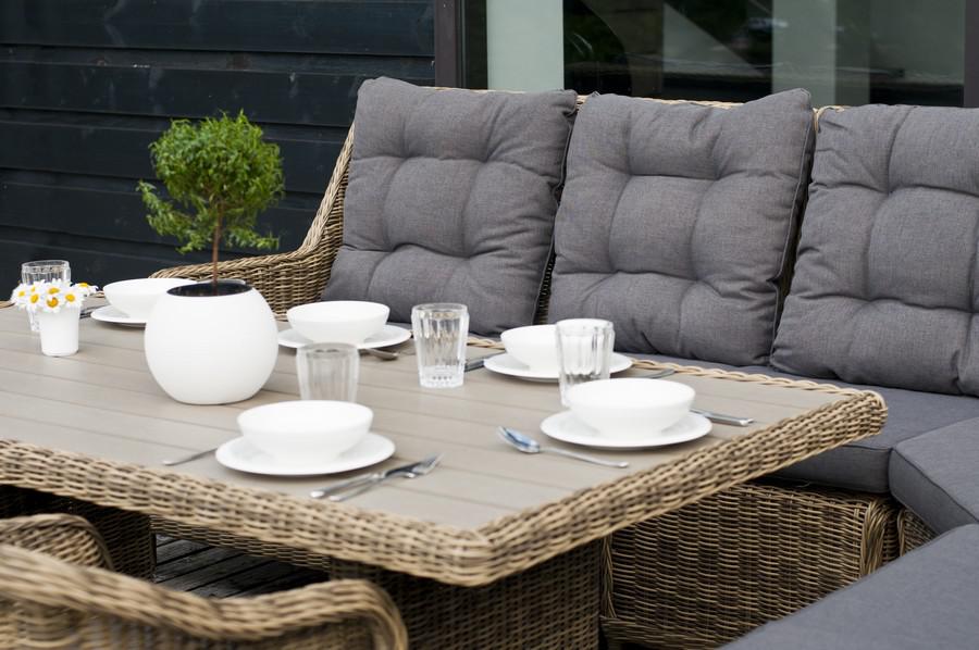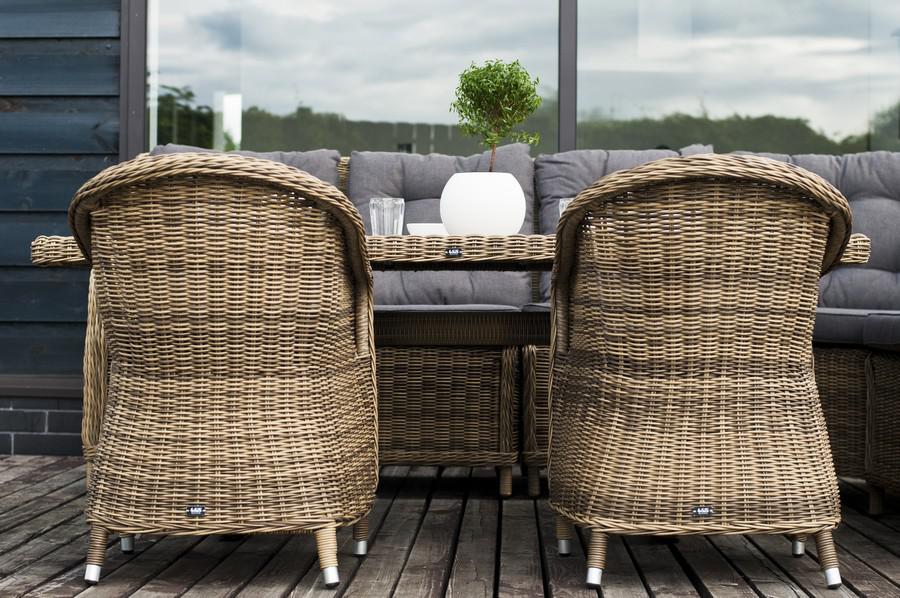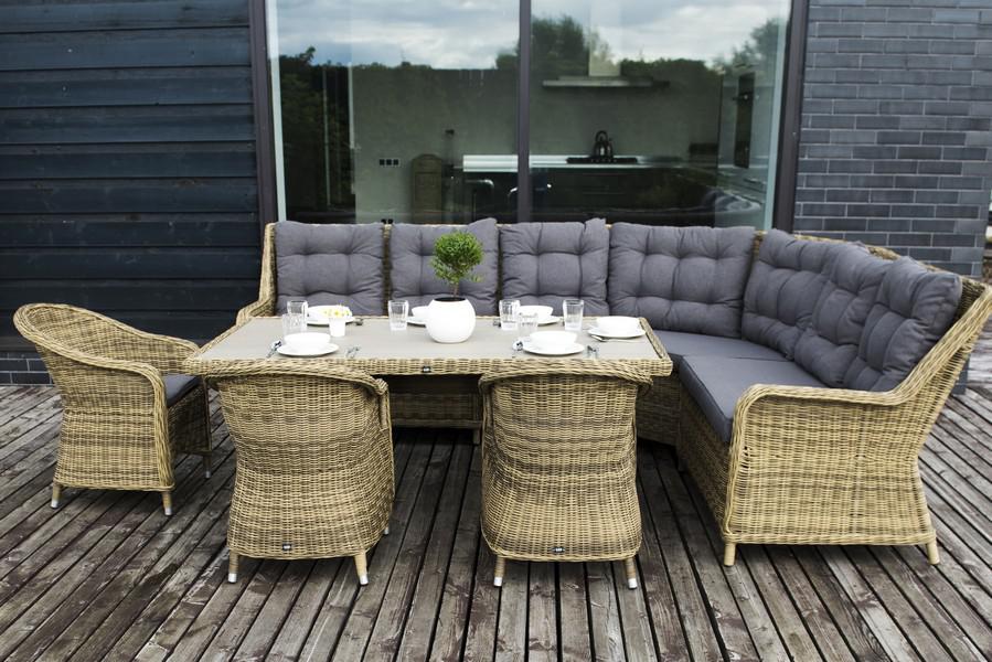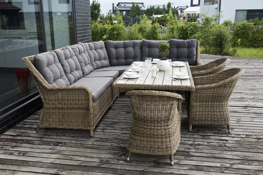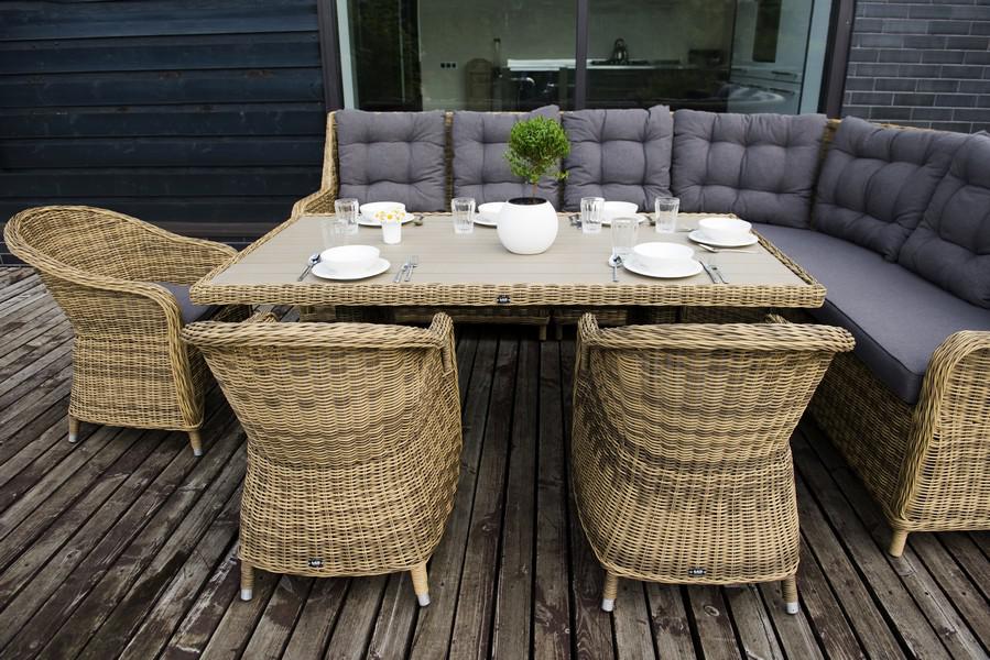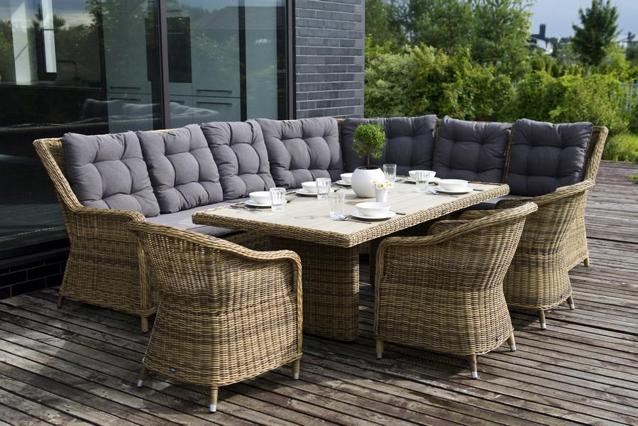 Угловая модульная лаунж-зона с обеденным столом и тремя стульями. В состав входят: - модульный диван (правый модуль - 1150×900×990 мм, левый модуль - 1150×900×990 мм, угловой модуль - 1630×900×990 мм, центральный модуль - 570×900×990 мм). - плетеный обеденный стол (1800×1000×680 мм). - кресло 3 шт. - (570×680×810 мм). Столешница выполнена из современного полимерного материала ДПК в тон ротанга. Каркас изготовлен из прочного и легкого металла – алюминия, вручную оплетенного искусственной ротанг "Бергамо" плетеный угловой диванный модуль, цвет соломенный 1шт. 1 630Х900Х990, "Бергамо" плетеный левый модуль дивана, цвет соломенный 1шт. 1 150Х900Х990, "Бергамо" плетеный правый модуль дивана, цвет соломенный 1шт. 1 150Х900Х990, "Бергамо" плетеный центральный модуль дивана, цвет соломенный 1шт. 570Х900Х990, "Бергамо" плетеный обеденный стол, цвет соломенный 1шт. 1 800Х1 000Х680, "Равенна" плетеное кресло из искусственного ротанга, цвет соломенный 3шт. 570Х680Х810,
