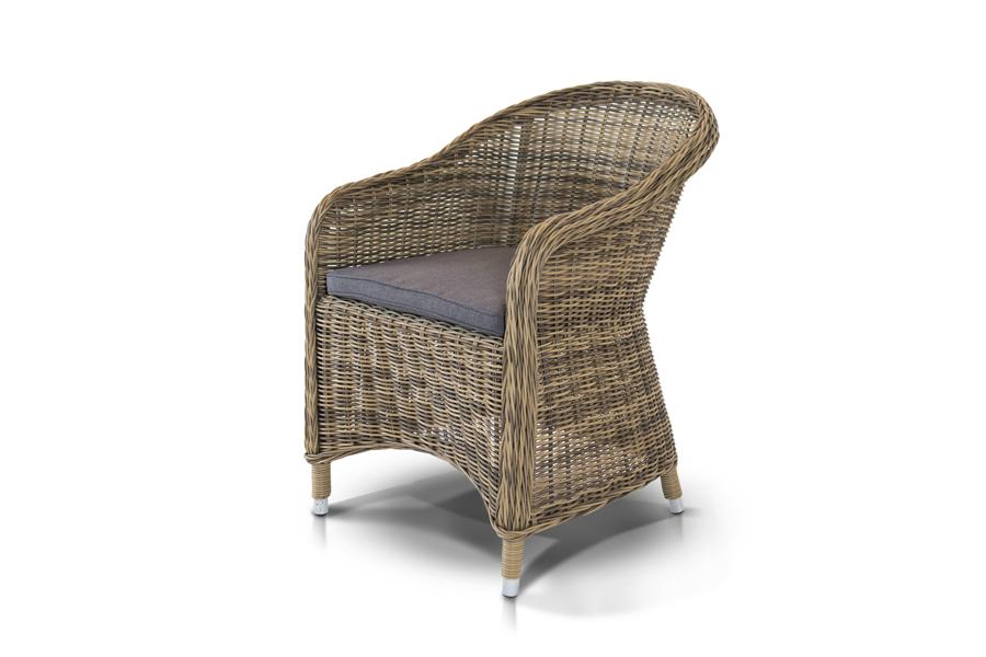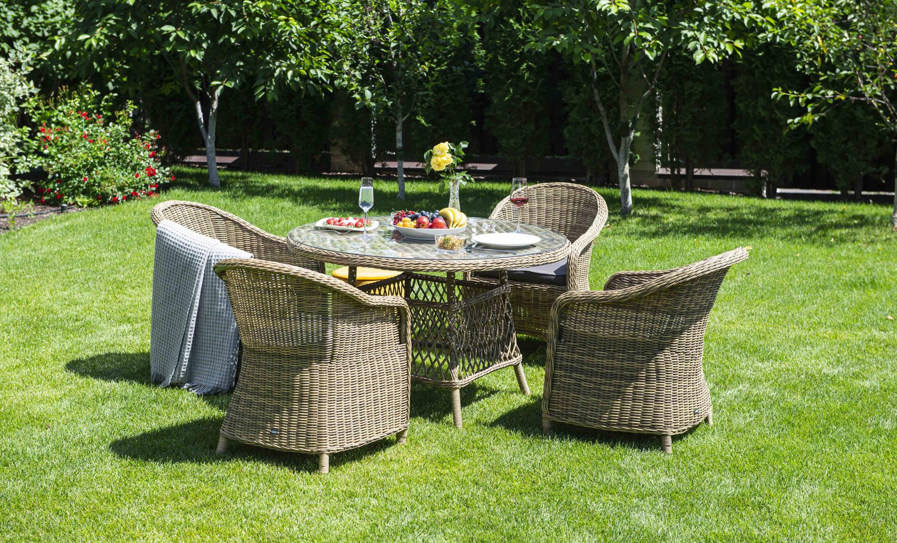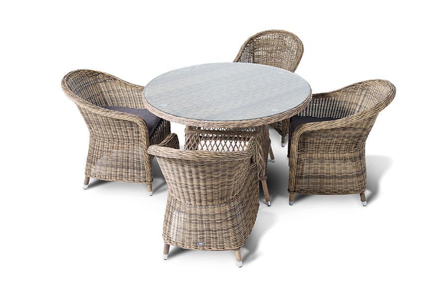 Обеденная группа «Равенна» на 4 персоны из круглого искусственного ротанга. Стулья с подлокотниками в комплекте с подушками серого цвета. Круглый стол со стеклянной столешницей из каленного стекла толщиной 5 мм. Ручное плетение. Алюминиевый каркас. Подушки из водостойкой полиэфирной ткани. Параметры кресел без подушек: Глубина сидения – 500 мм; Высота сидения – 440 мм; Высота спинки – 400 мм. "Эспрессо" плетеный круглый стол, диаметр 118 см, цвет соломенный 1шт. 1 180Х1 180Х750, "Равенна" плетеное кресло из искусственного ротанга, цвет соломенный 4шт. 570Х680Х810,